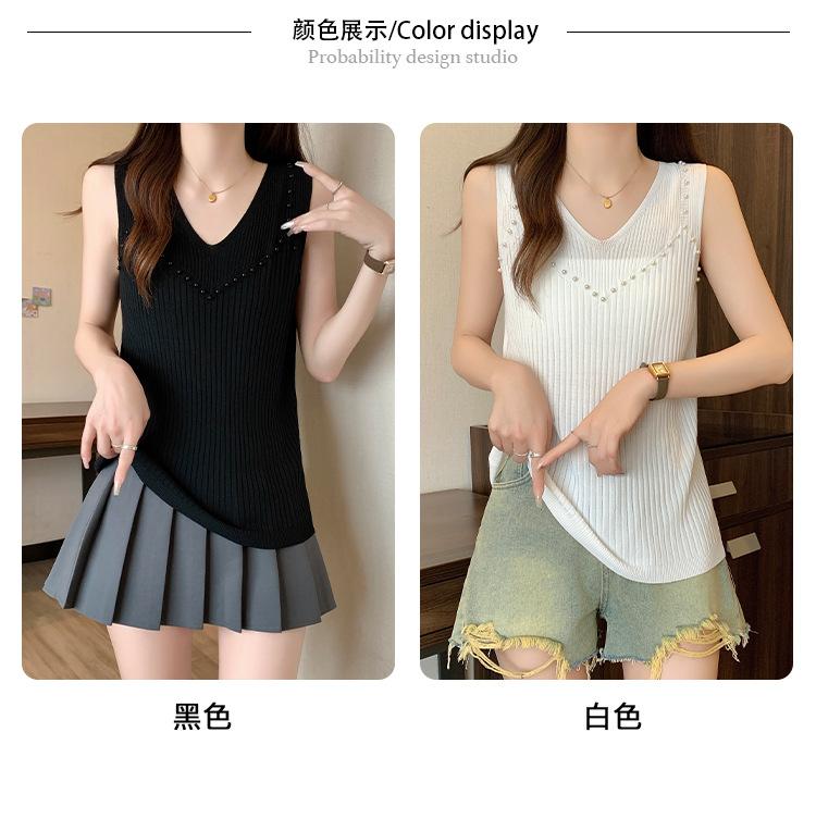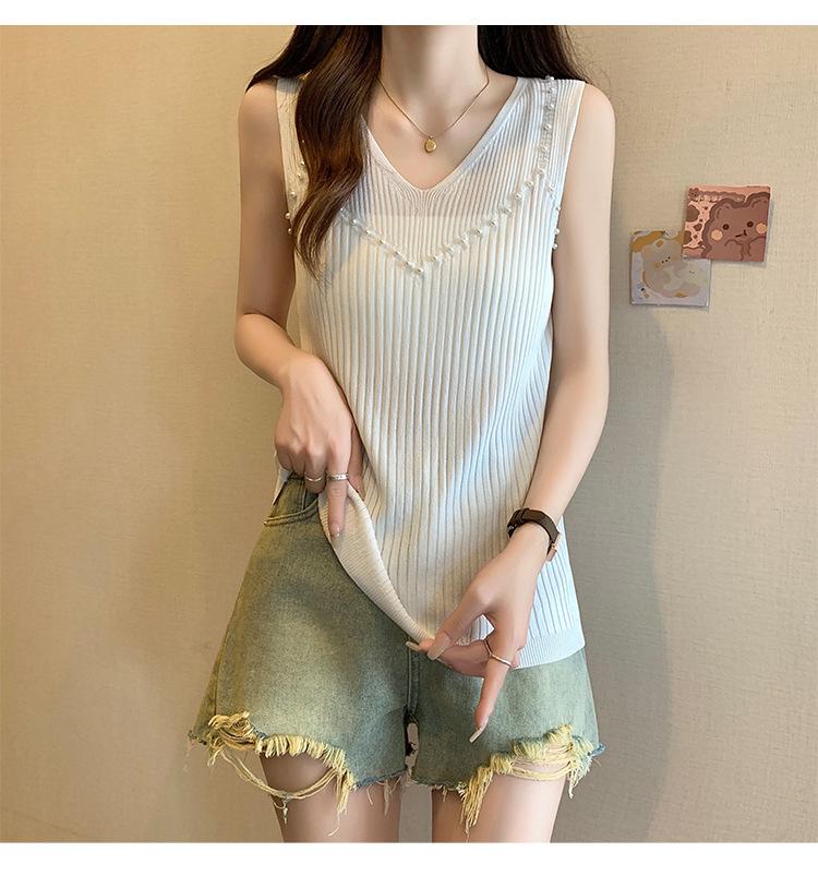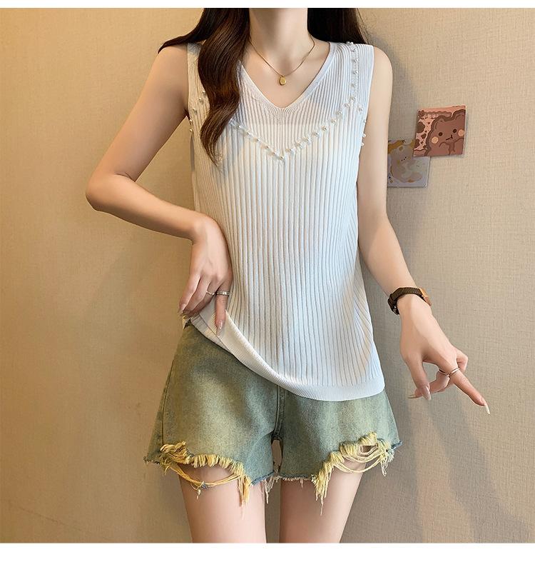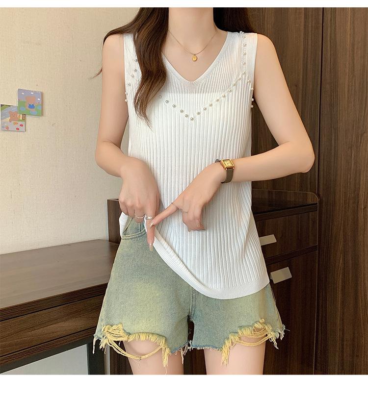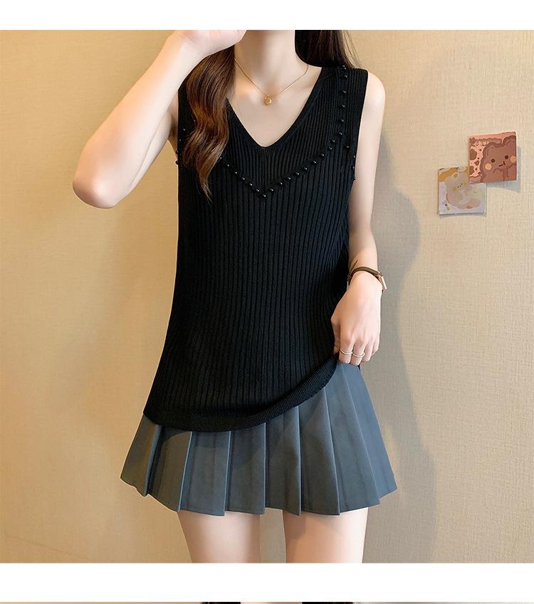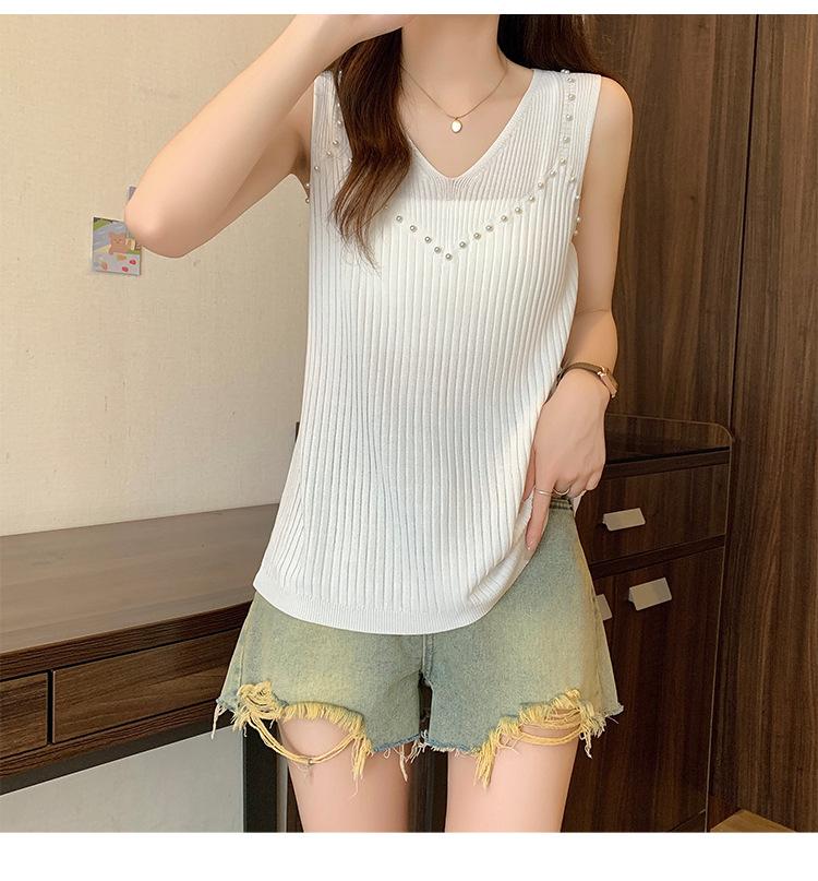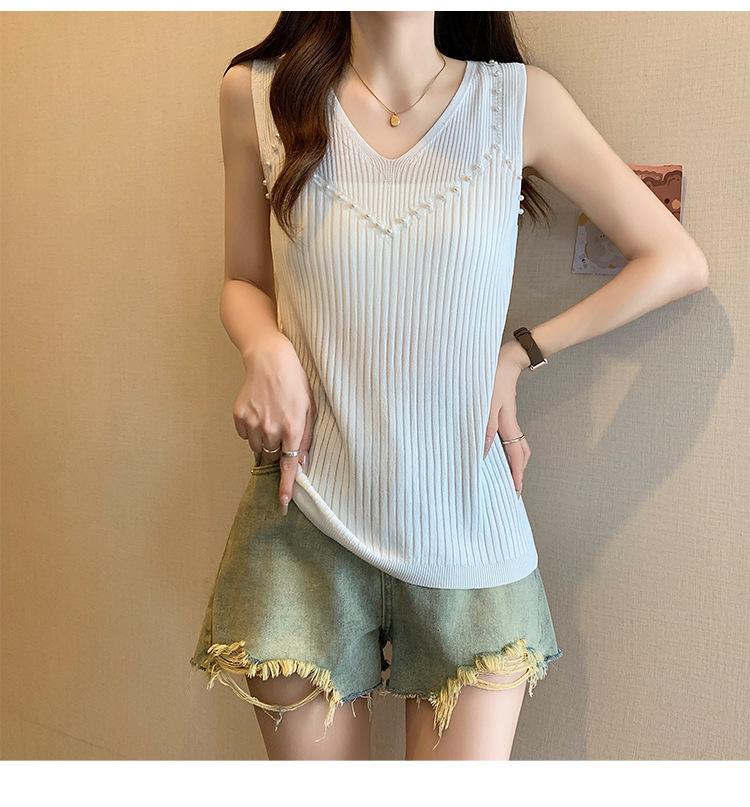 Camisola de punto sin mangas de seda de hielo para mujer, verano 2025, nueva, cuello en V, abalorios pesados, camiseta interior y exterior