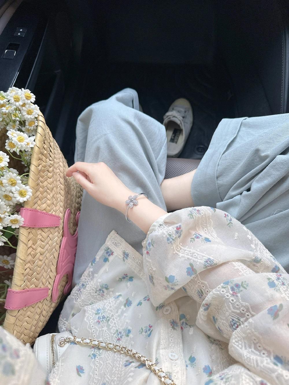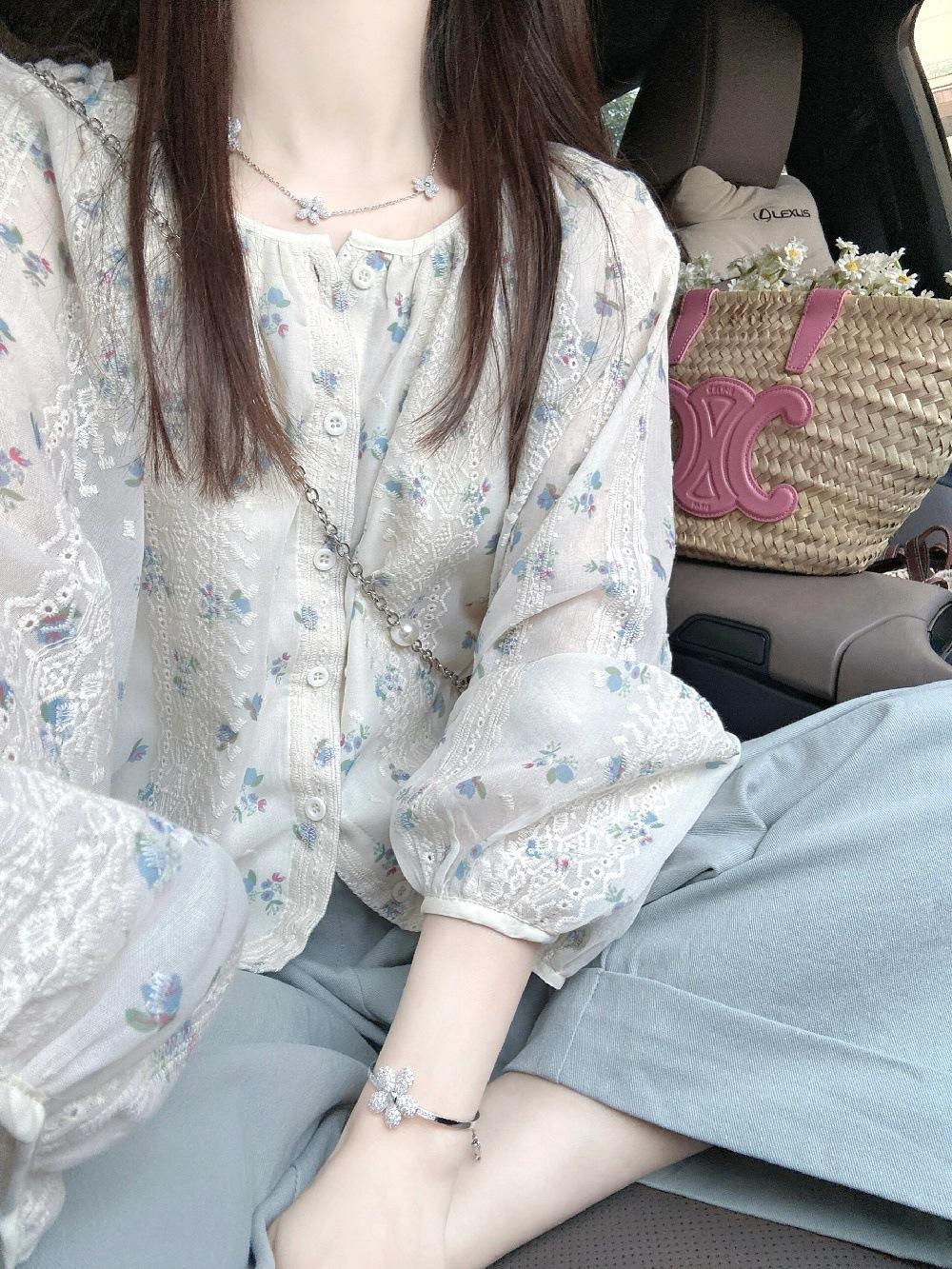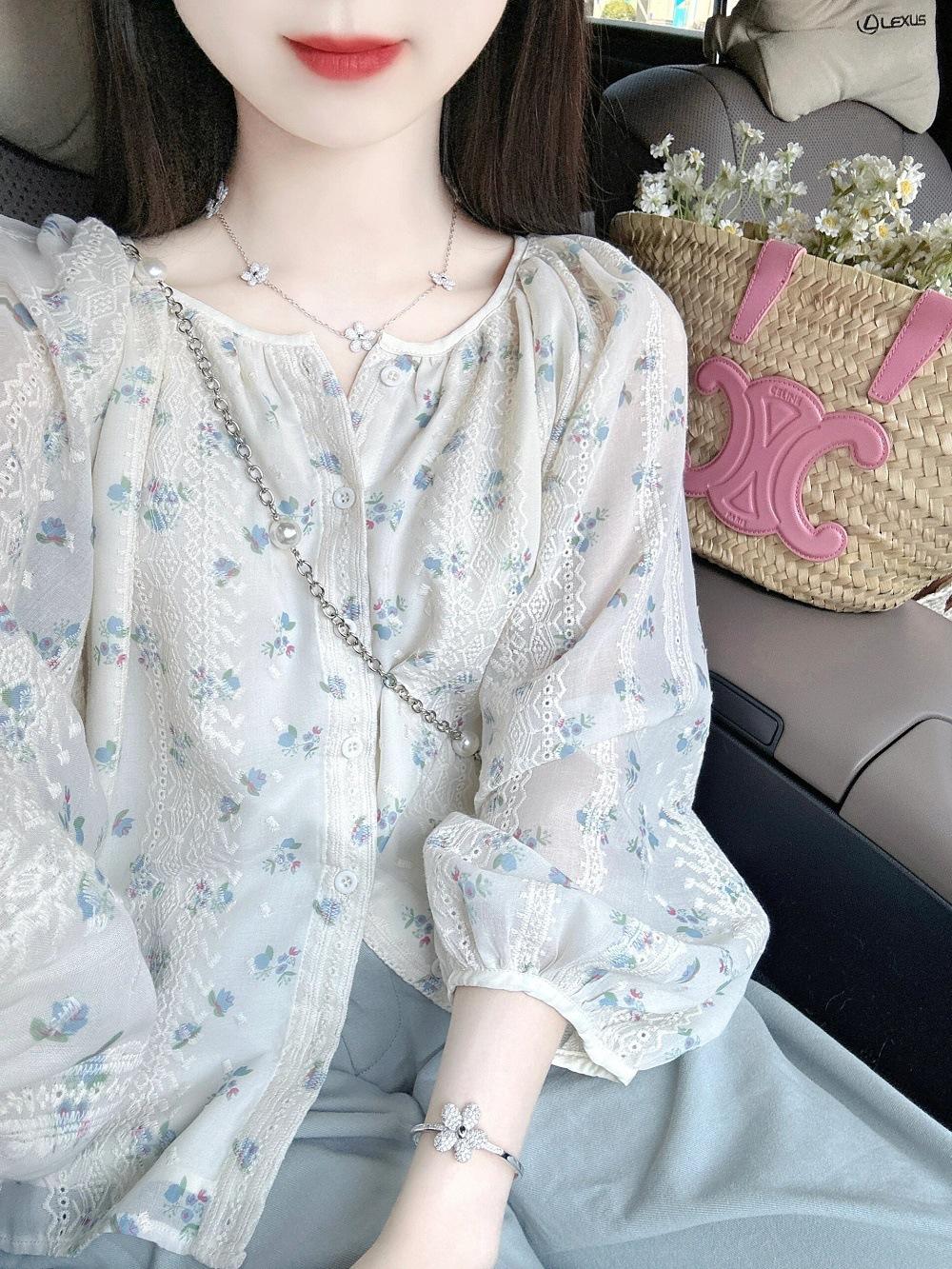 Blusa de Muñeca de Encaje Chifón de Manga Abullonada Floral para Mujer Verano Delgada Protector Solar Diseño de Nicho Cuello Redondo