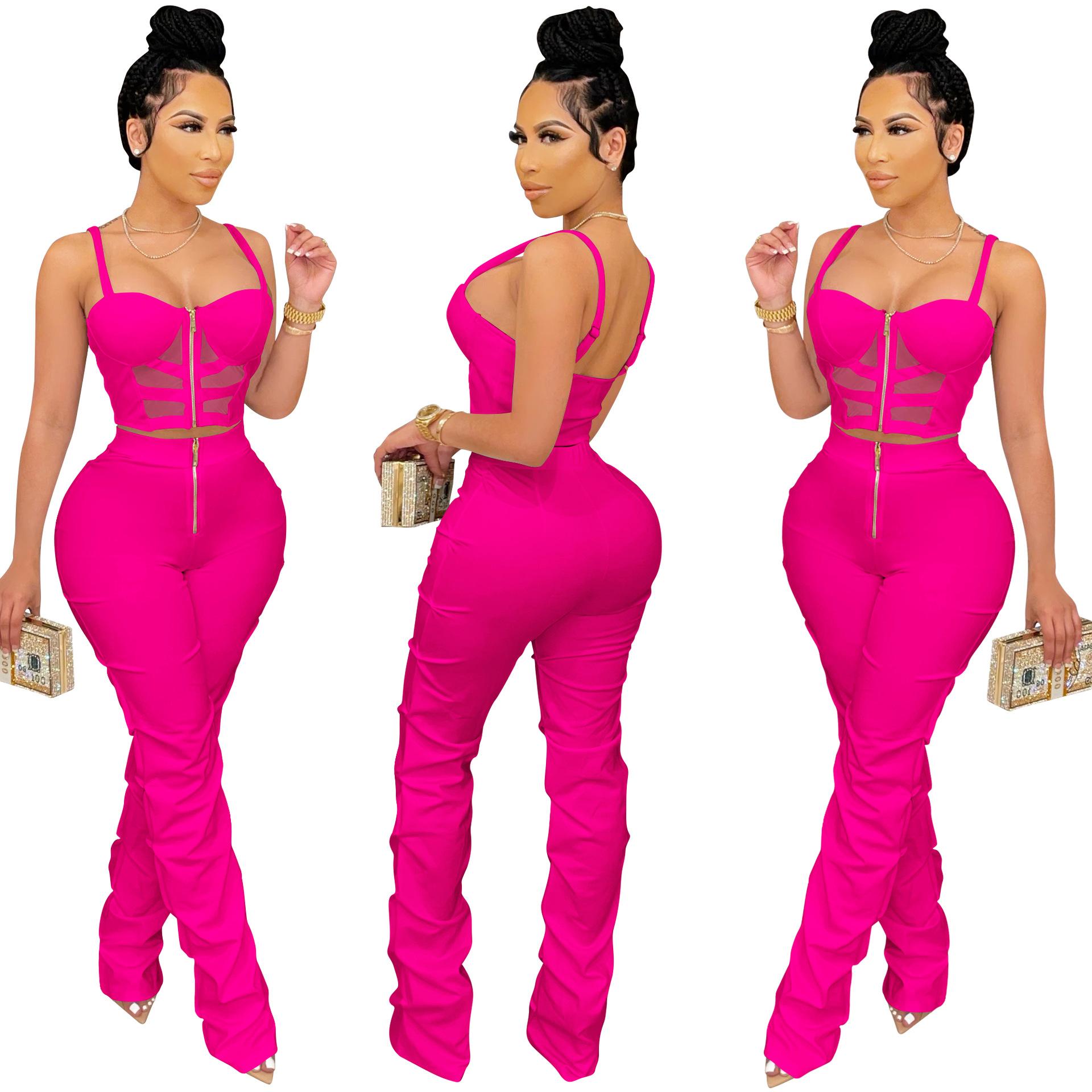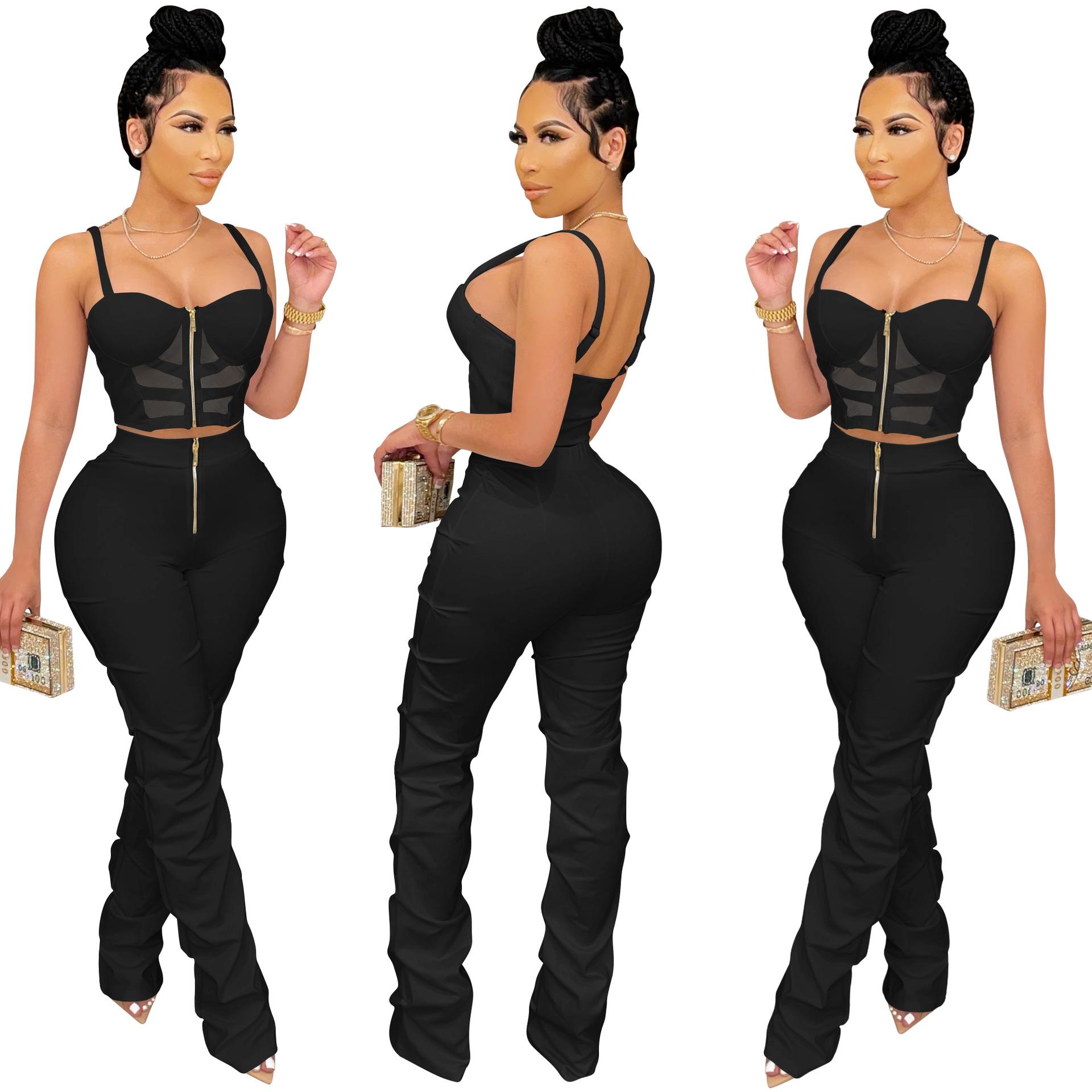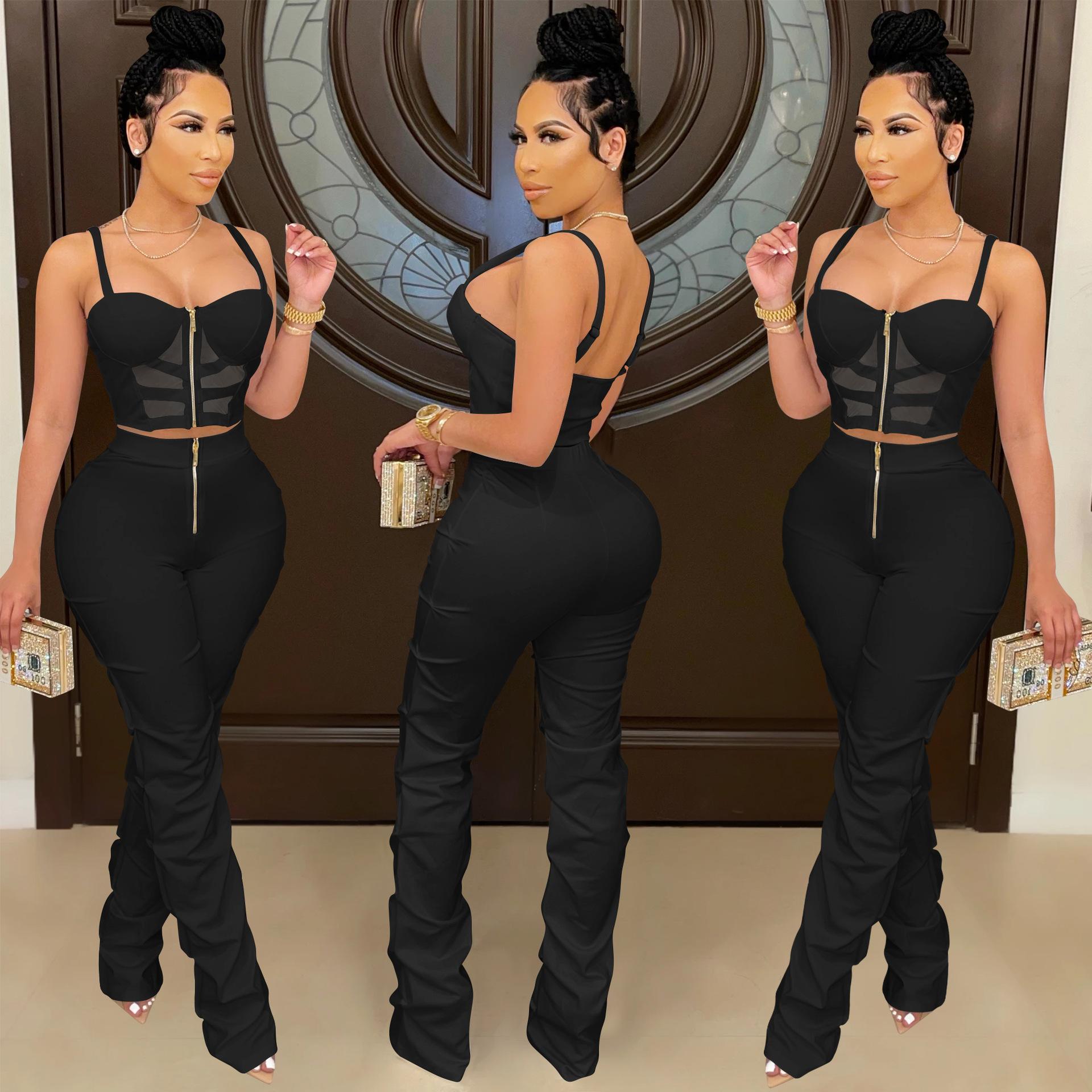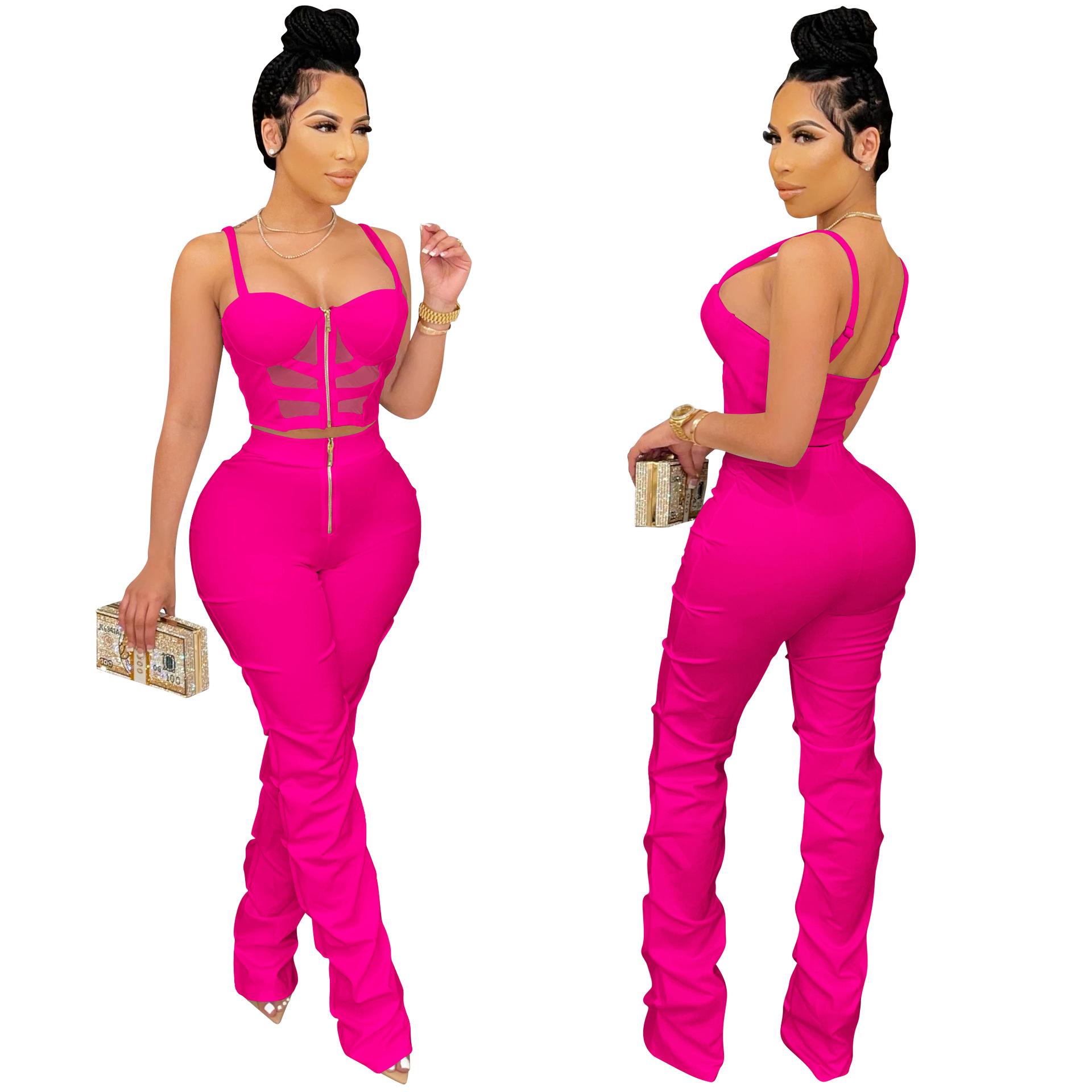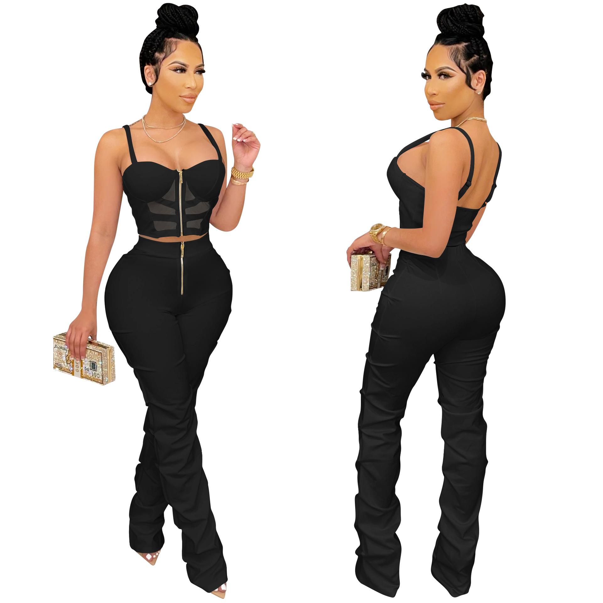 X5215 AliExpress Amazon Ebay Color Sólido Sexy para Mujer Sling Envoltura Pecho Cremallera Chaleco Pantalones Conjunto de Dos Piezas