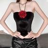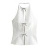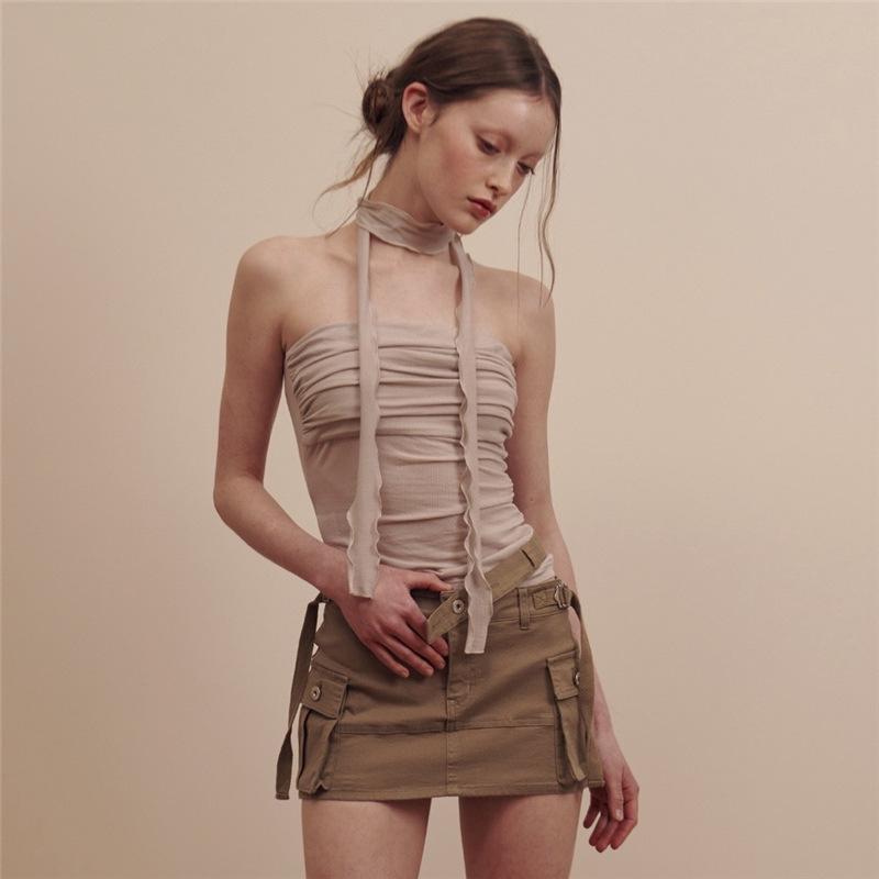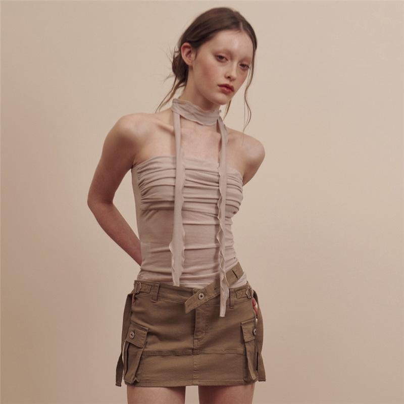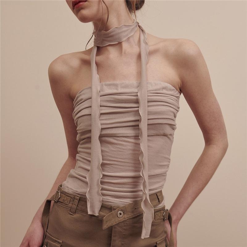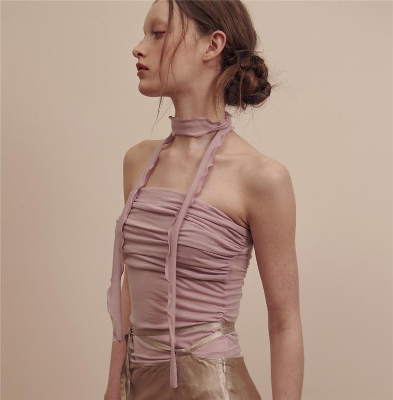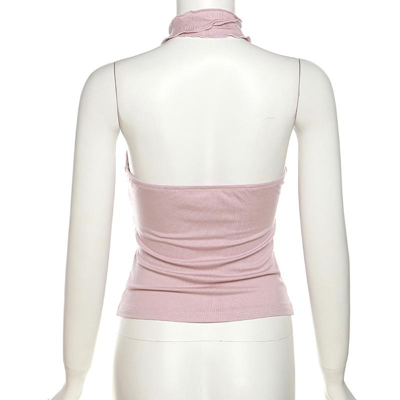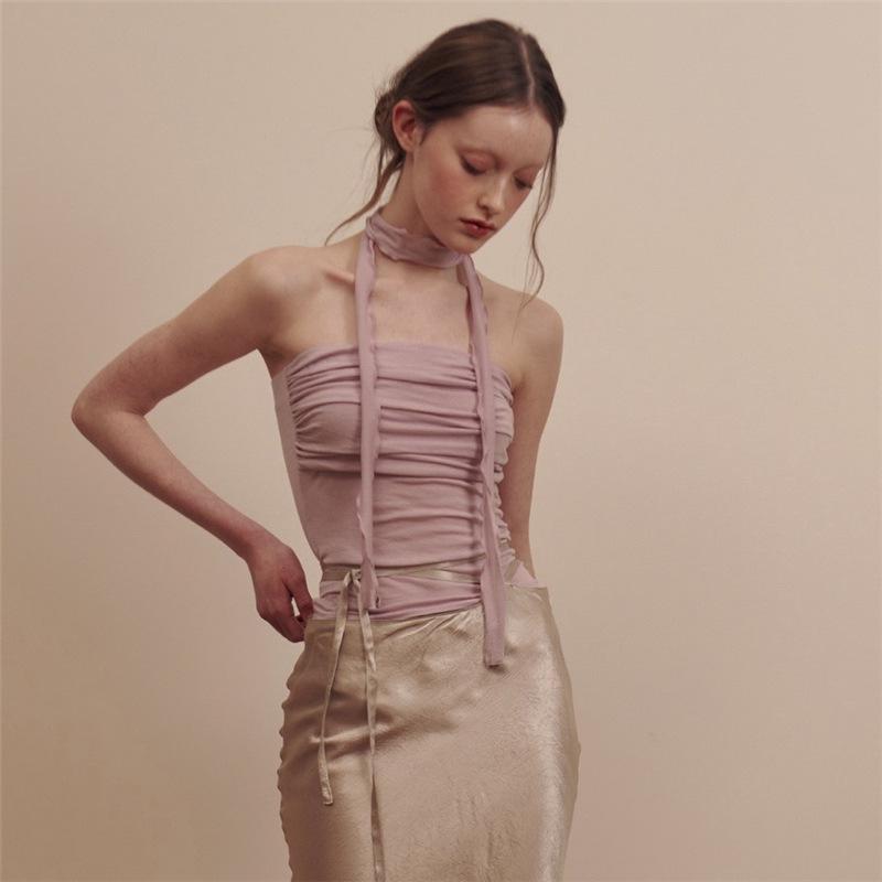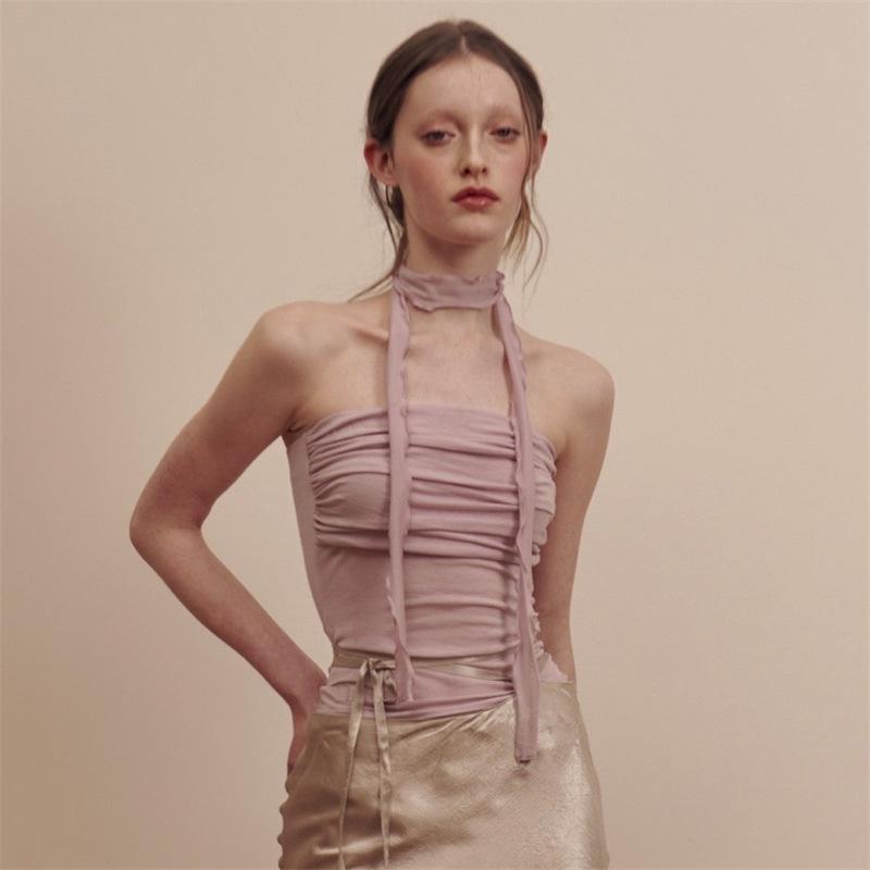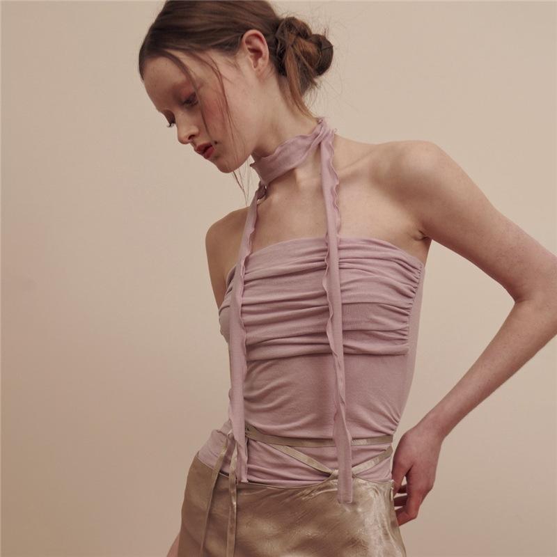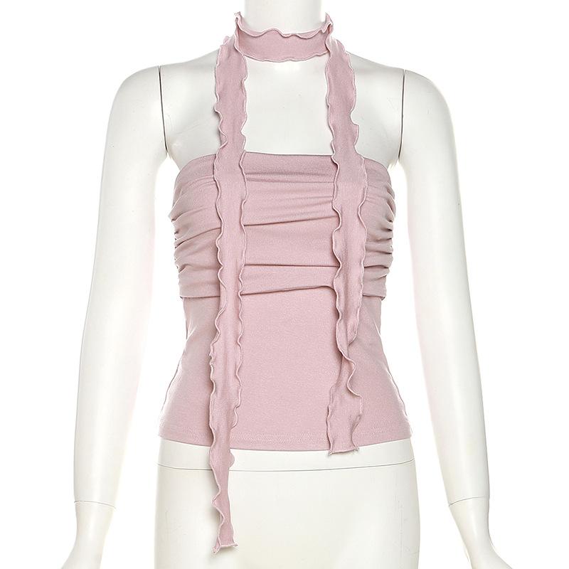 2024 Estilo Europeo y Americano Transfronterizo Primavera Ropa Nueva para Mujer Color Puro Ajustado Moda Cuello de un Hombro Plisado Sexy Espalda Descubierta Chaleco
