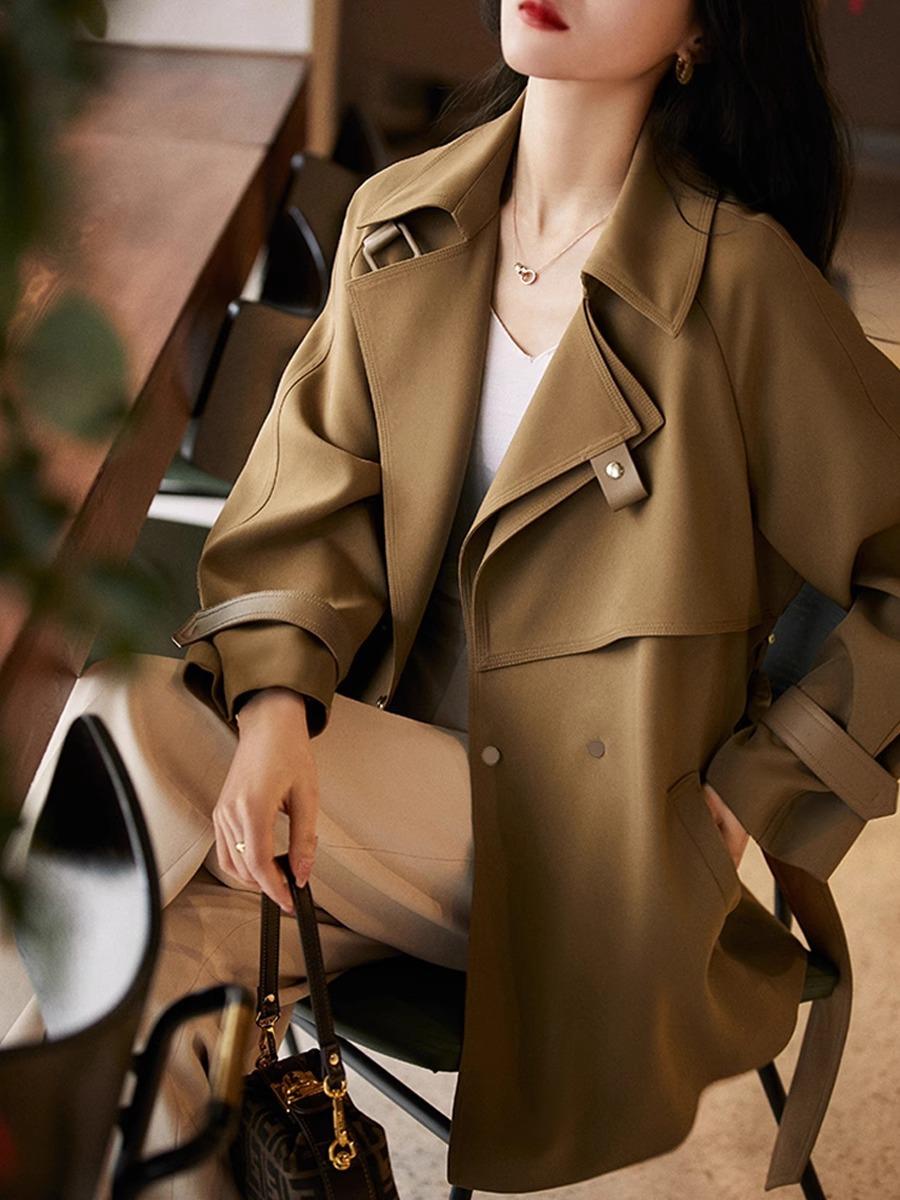 Rompevientos para Mujer 2025 Nuevo Primavera y Otoño Rompevientos Caqui para Mujer Largo Medio Doble Botonadura Estilo Británico Ropa Exterior Chaqueta de Moda