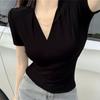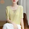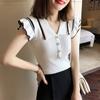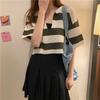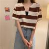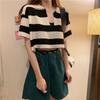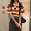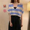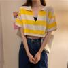 Verano 2021 nuevo suéter de punto de manga corta con cuello en V a rayas de color contrastante para mujer, prenda exterior holgada de estilo occidental que combina con todo, camiseta top