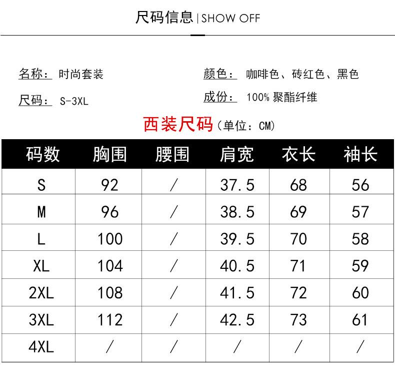 Black suit, Brown suit, Brick red suit, Black suit + pants, Brown suit + pants, Brick red suit + pants