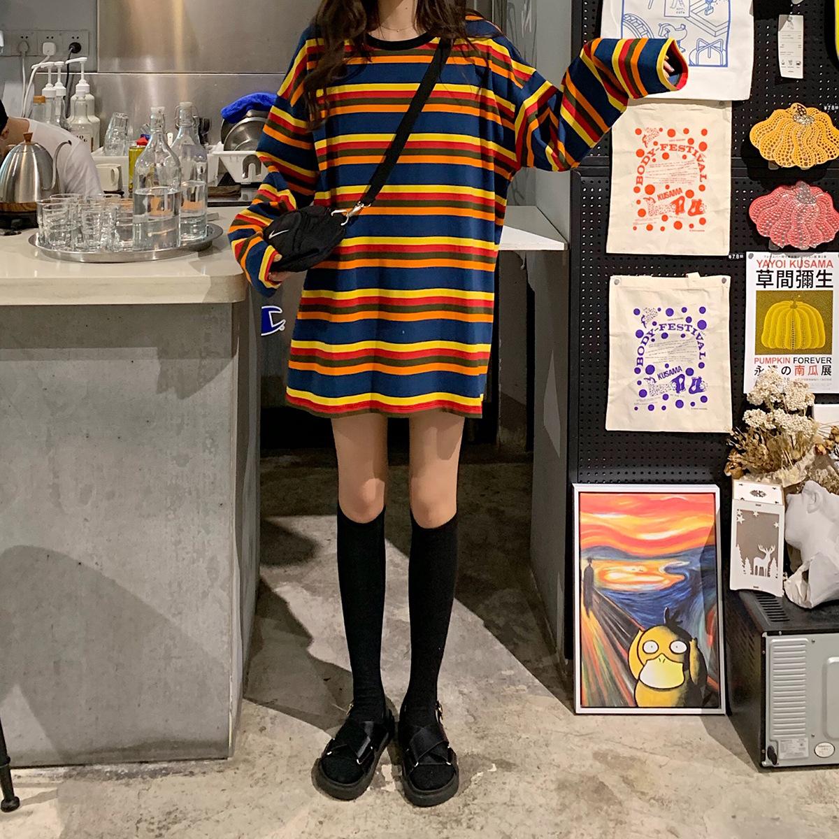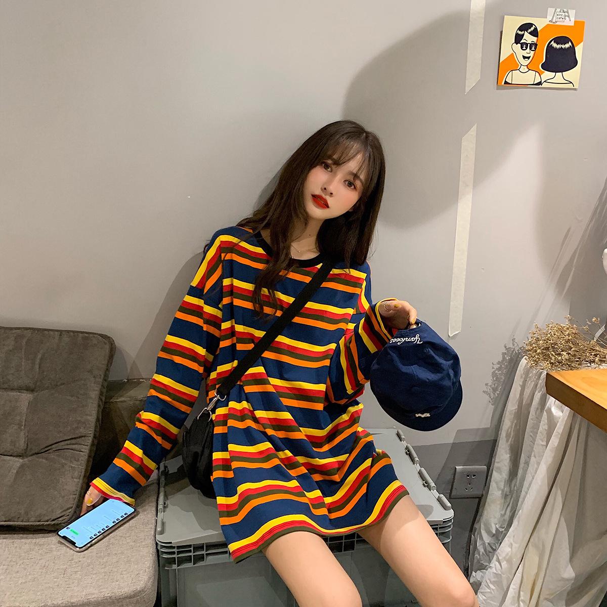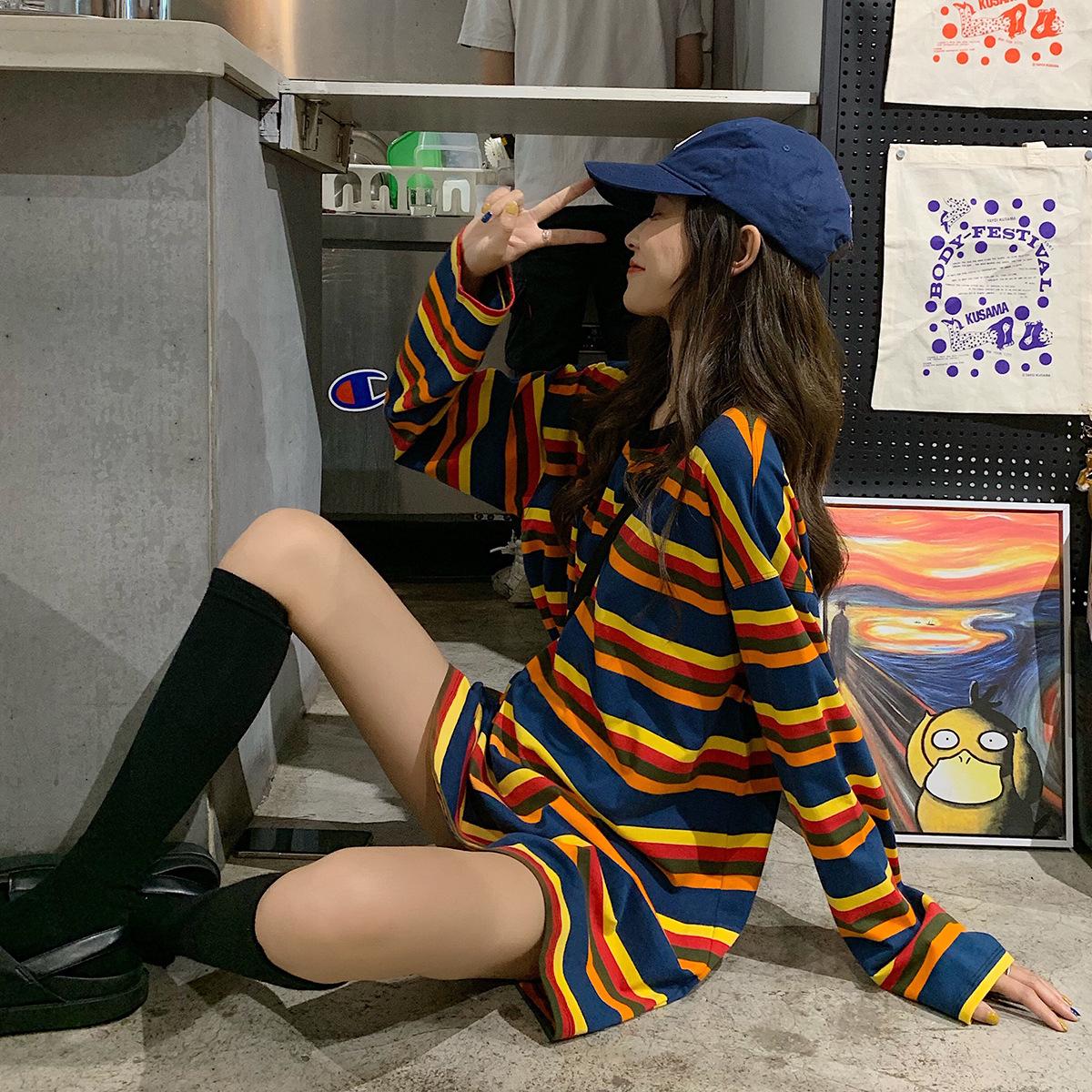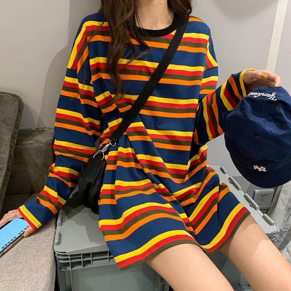 Camiseta de Manga Larga para Estudiante con Estilo K que Reduce la Edad para Mujer, Holgada de Largo Medio, Camiseta Básica de Primavera y Otoño que Afina la Figura, Top de Rayas Arcoíris