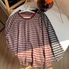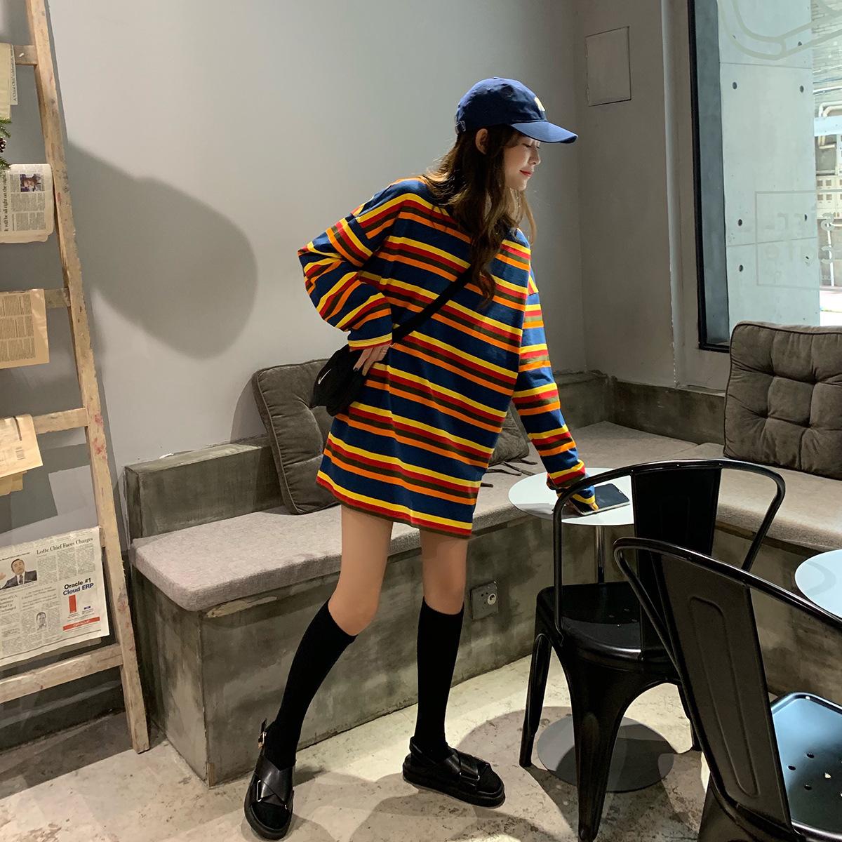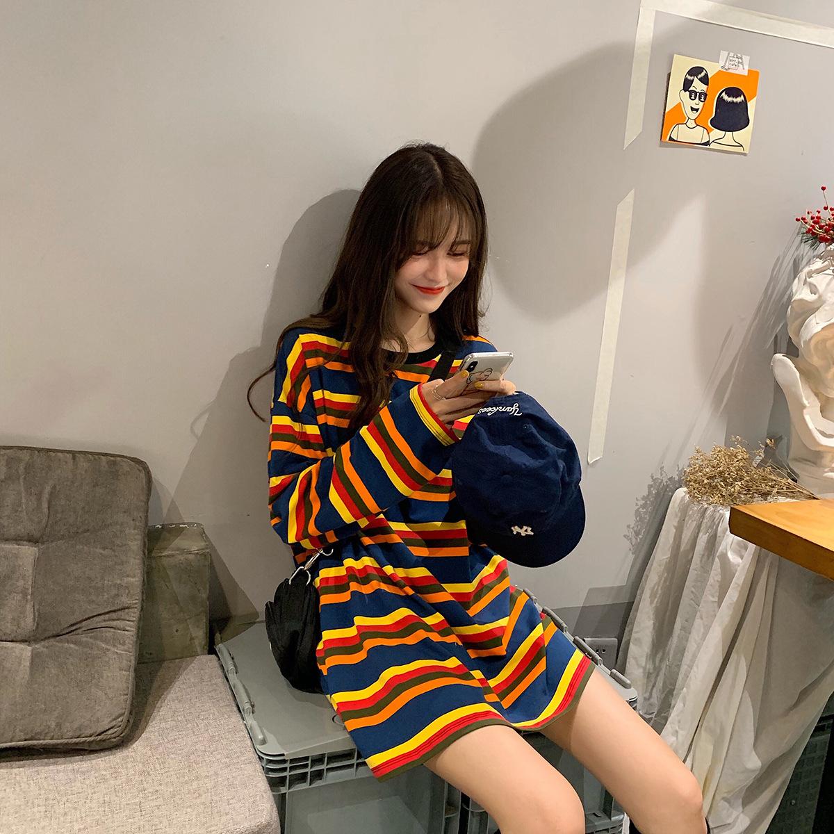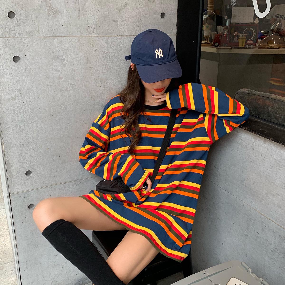 Camiseta de Manga Larga para Estudiante con Estilo K que Reduce la Edad para Mujer, Holgada de Largo Medio, Camiseta Básica de Primavera y Otoño que Afina la Figura, Top de Rayas Arcoíris