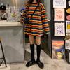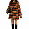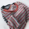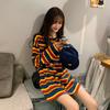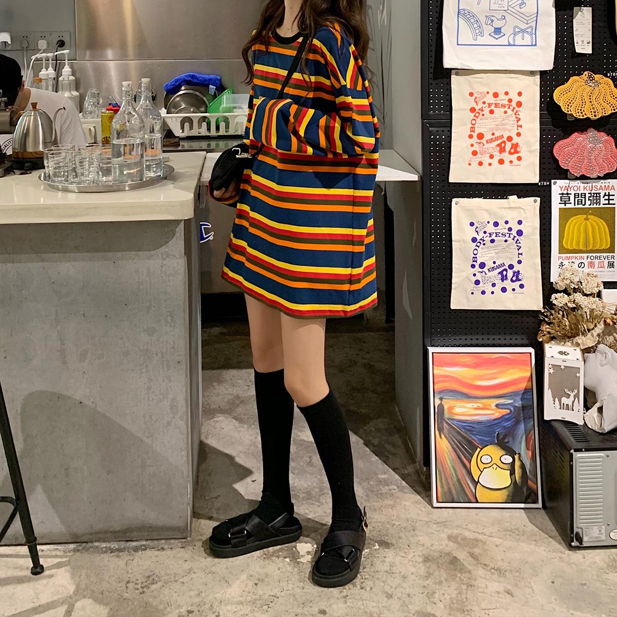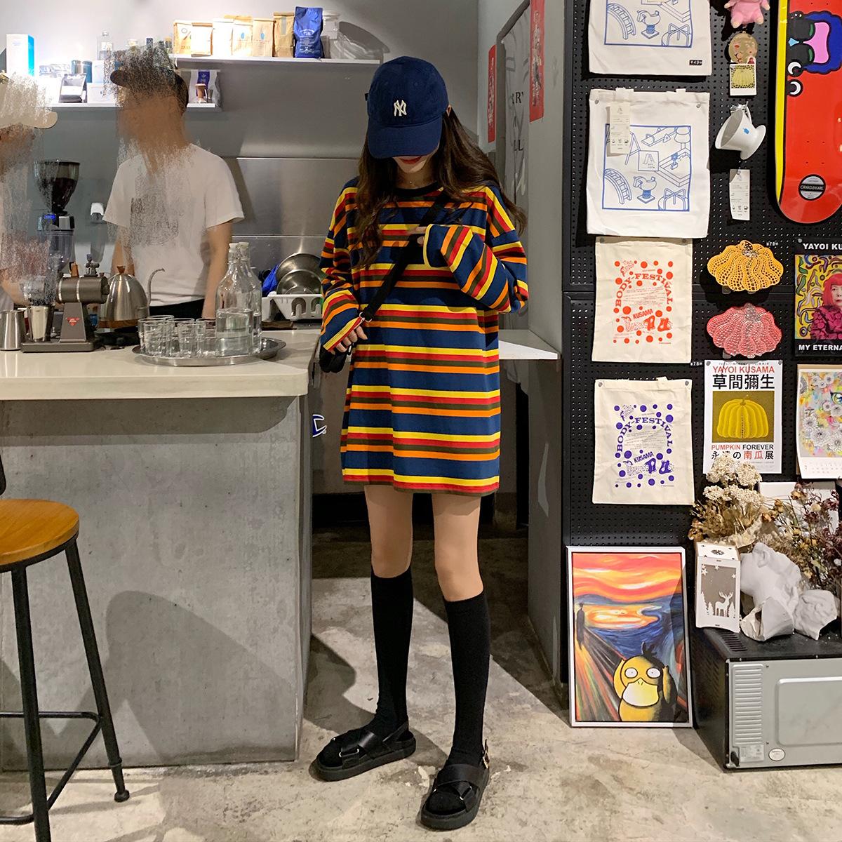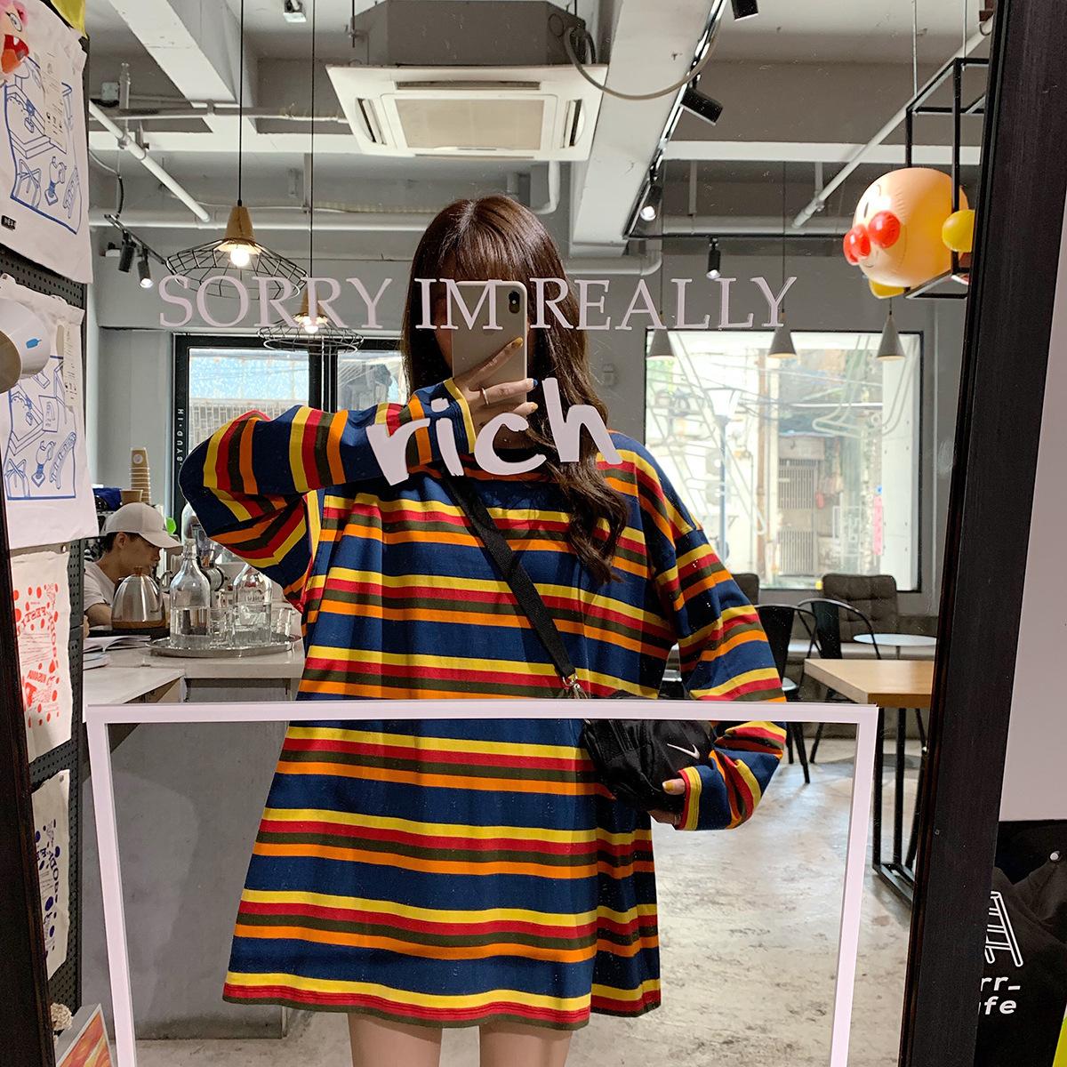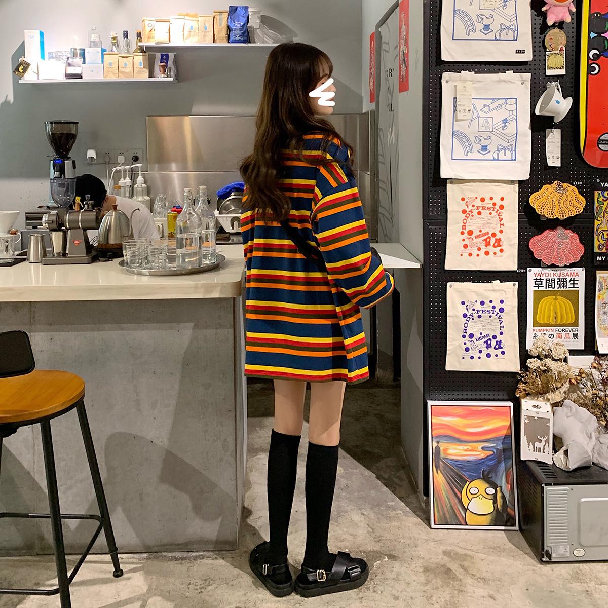Camiseta de Manga Larga para Estudiante con Estilo K que Reduce la Edad para Mujer, Holgada de Largo Medio, Camiseta Básica de Primavera y Otoño que Afina la Figura, Top de Rayas Arcoíris