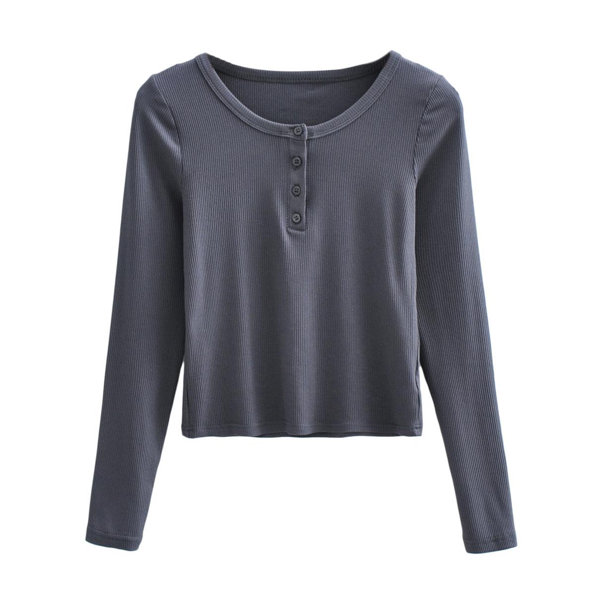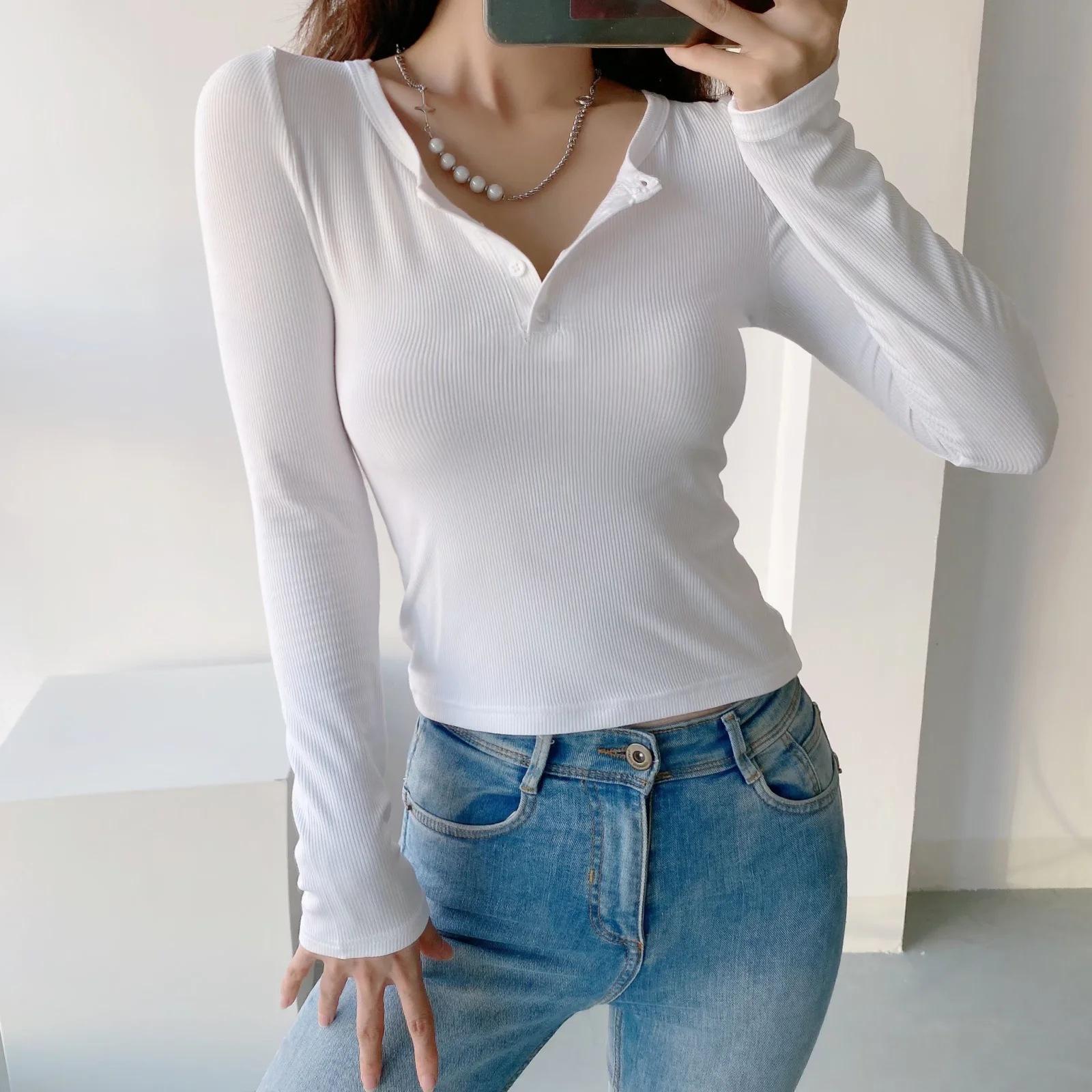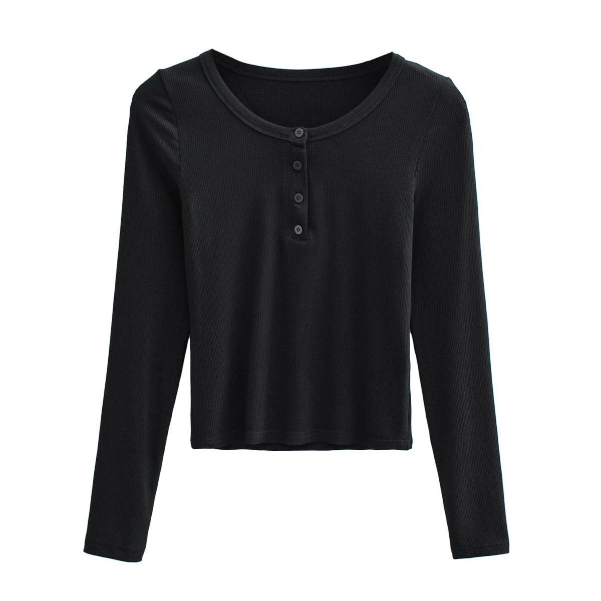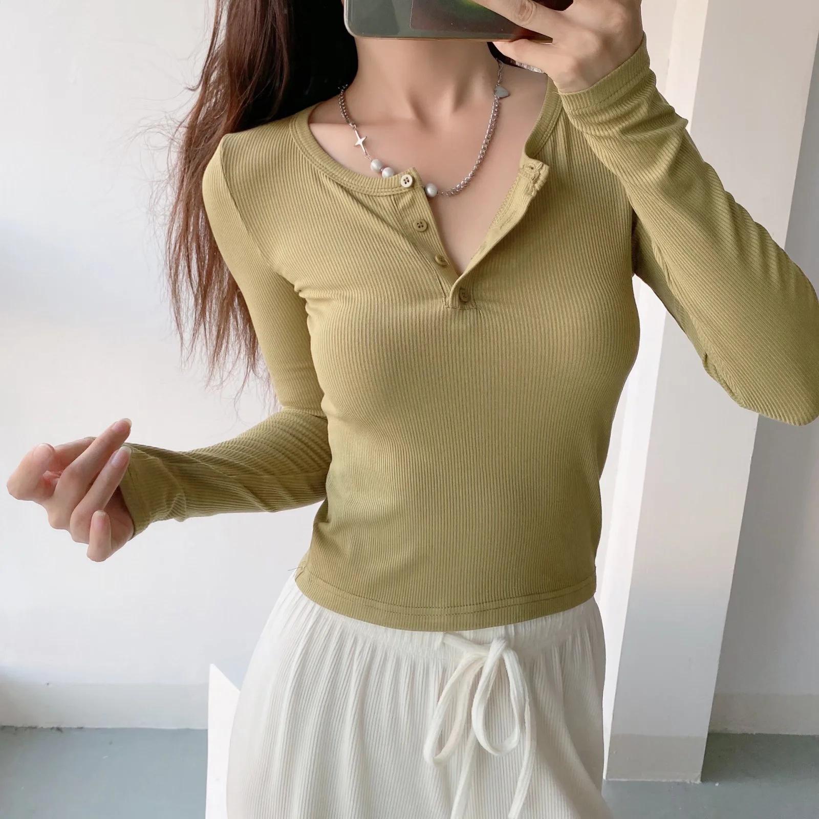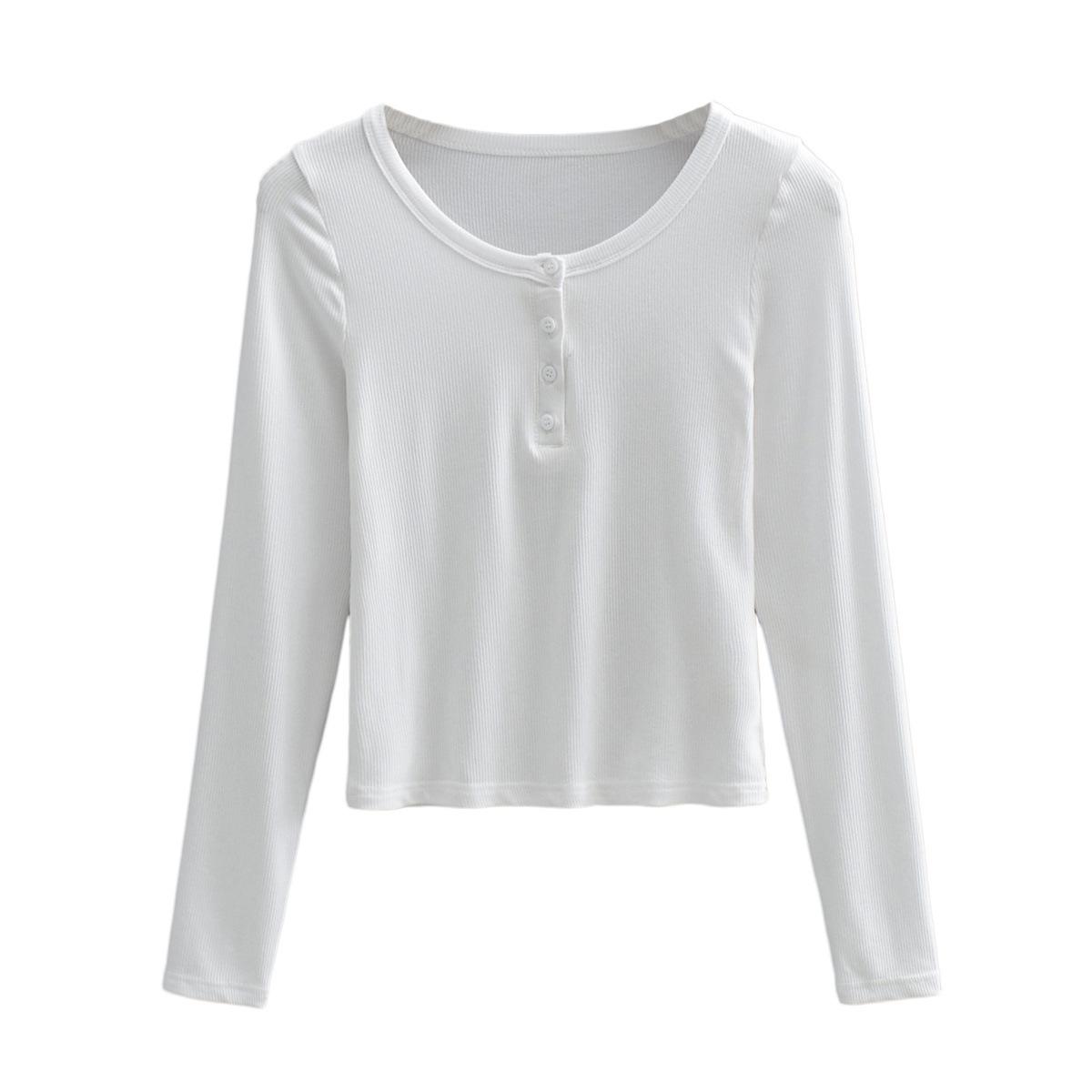 Camiseta sexy de manga larga con cuatro botones para mujer, estilo europeo y americano, de corte corto, entallada, con cuello redondo pequeño, básica, de color liso