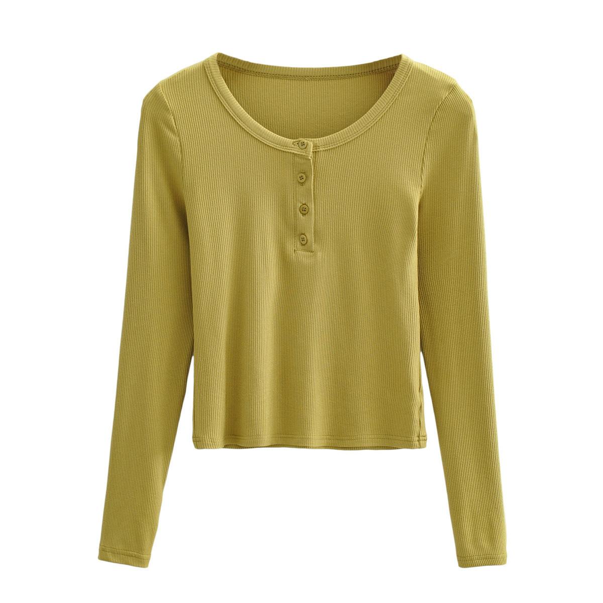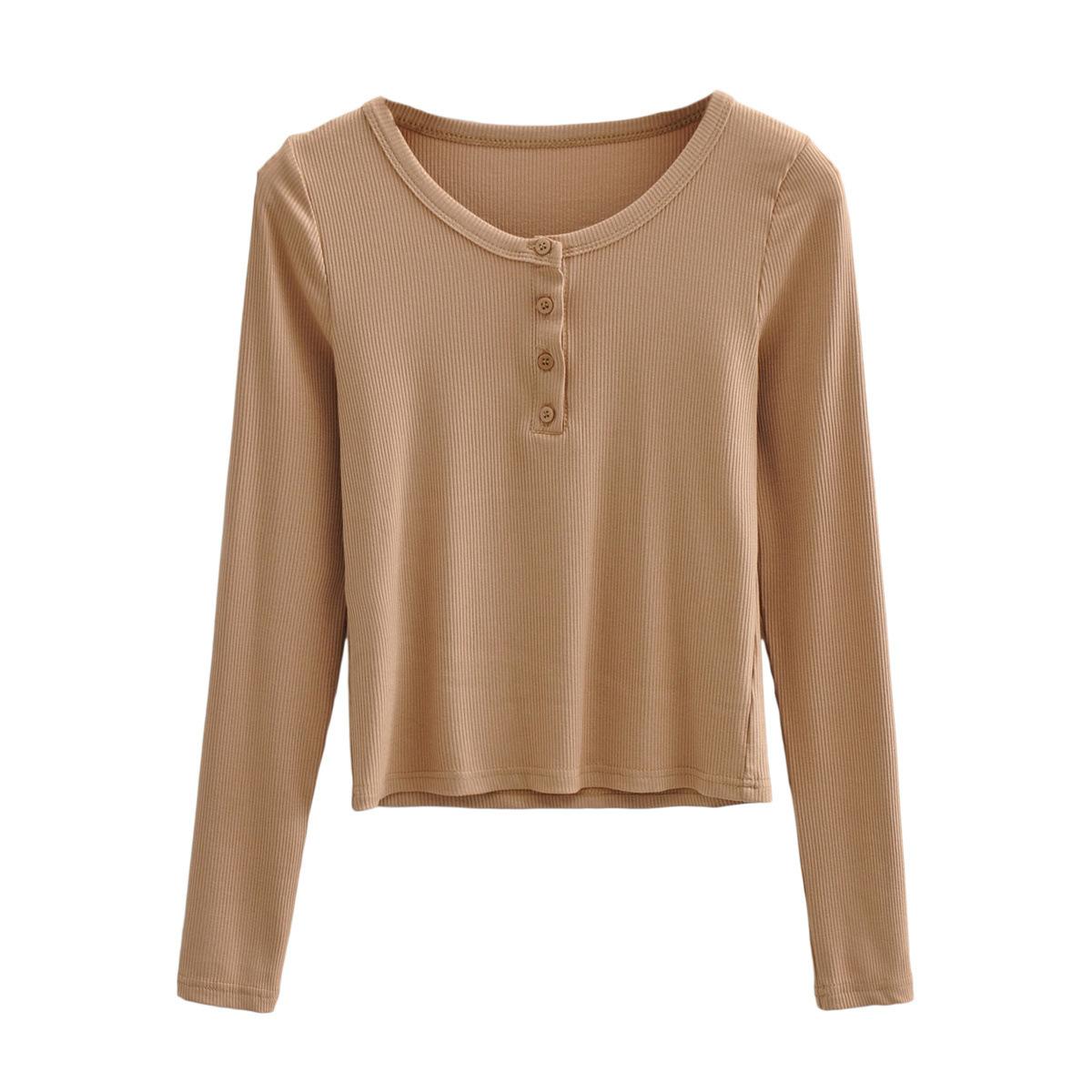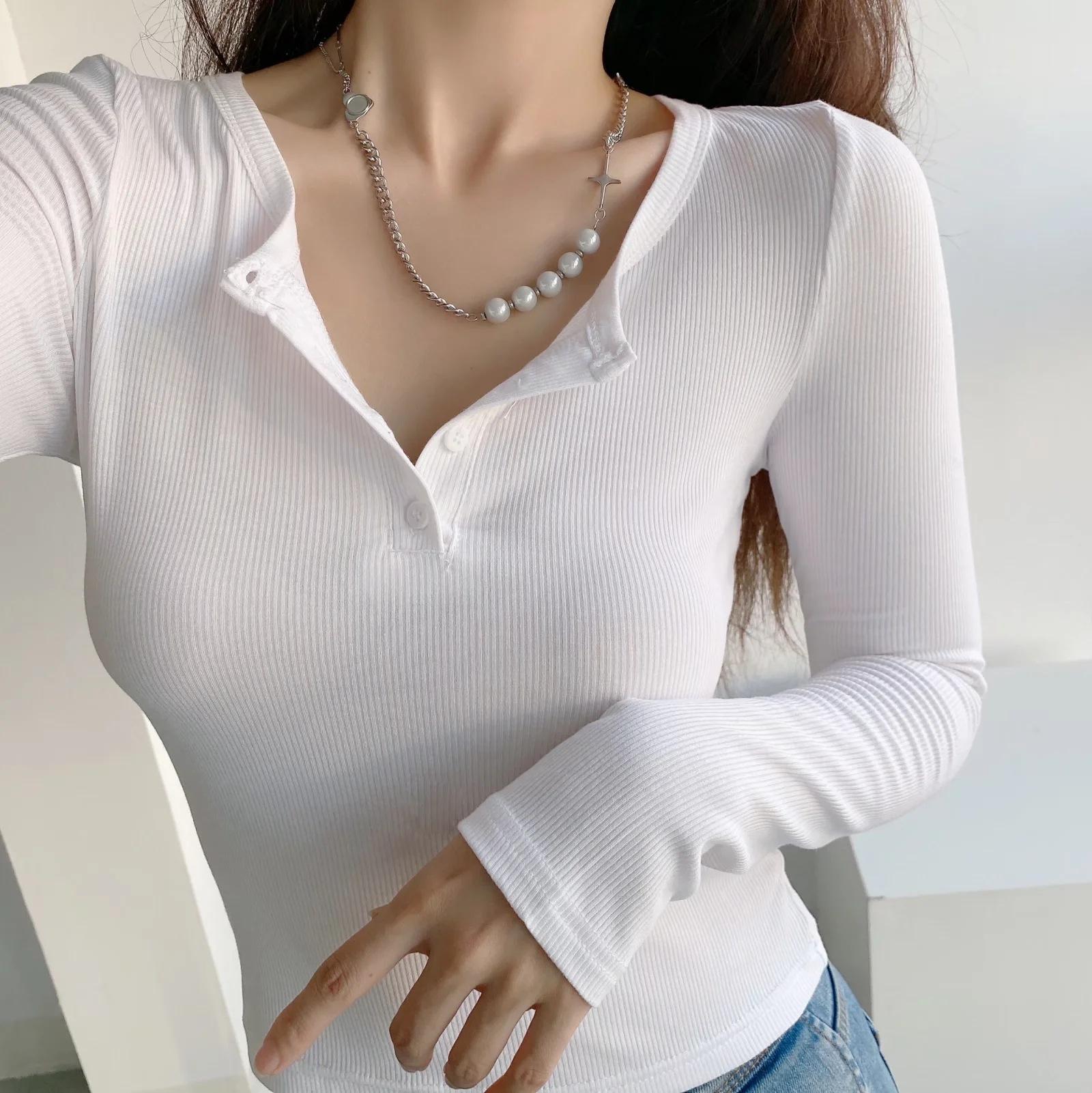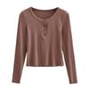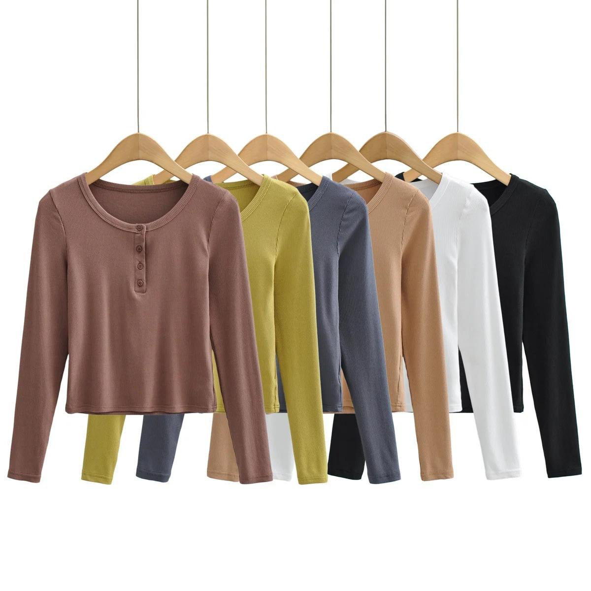 Camiseta sexy de manga larga con cuatro botones para mujer, estilo europeo y americano, de corte corto, entallada, con cuello redondo pequeño, básica, de color liso