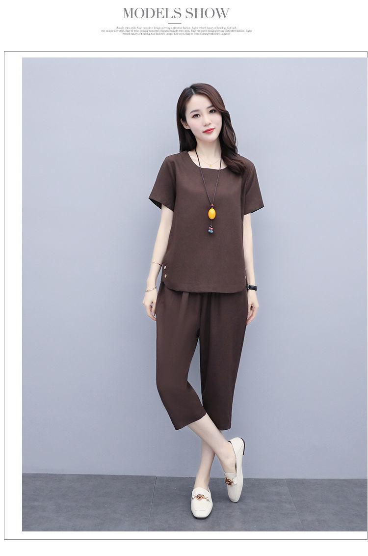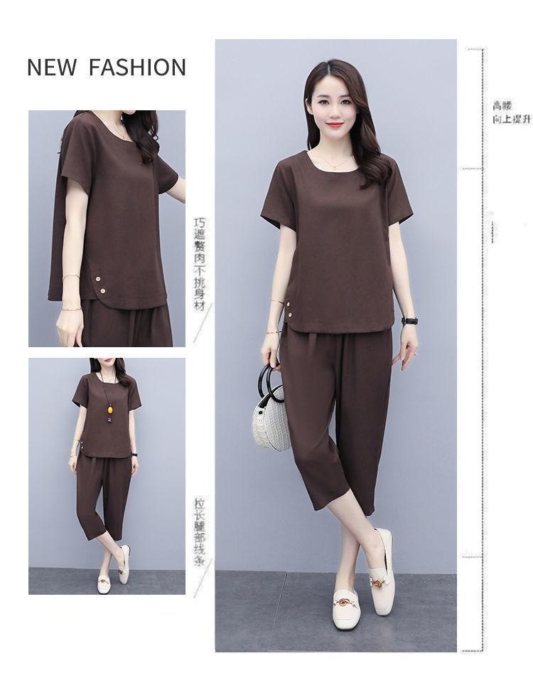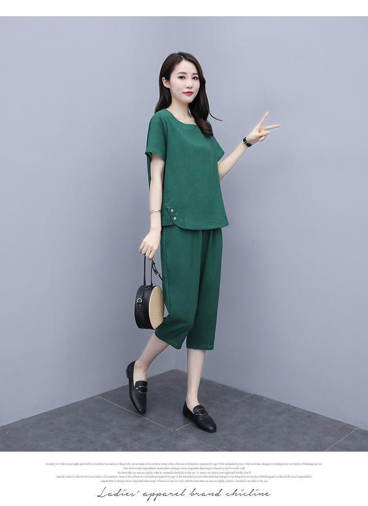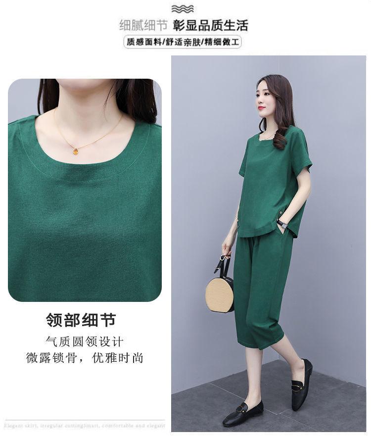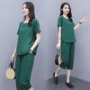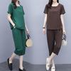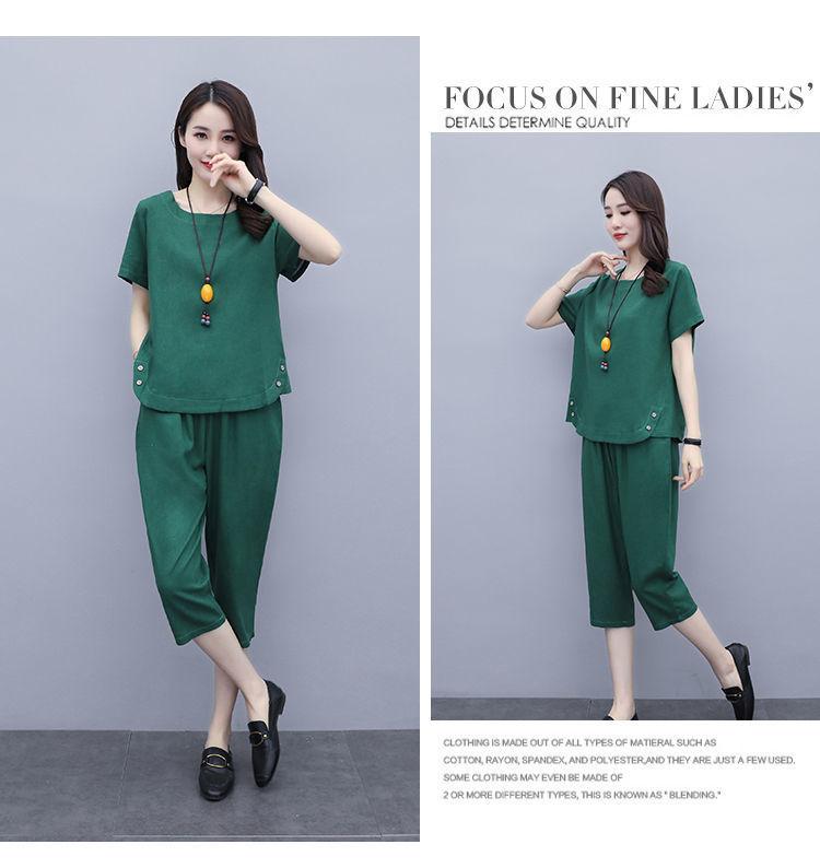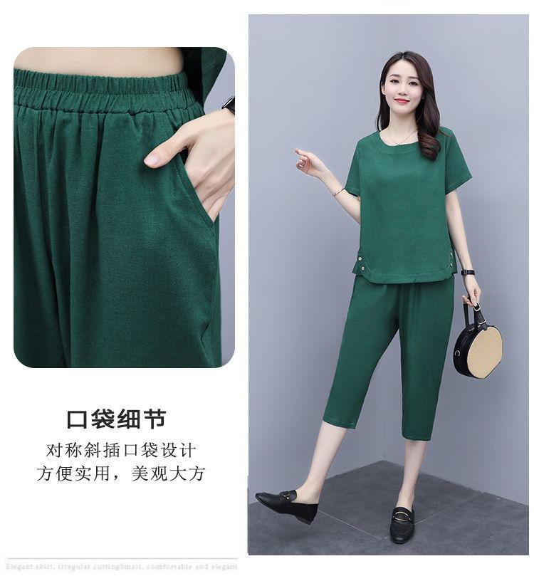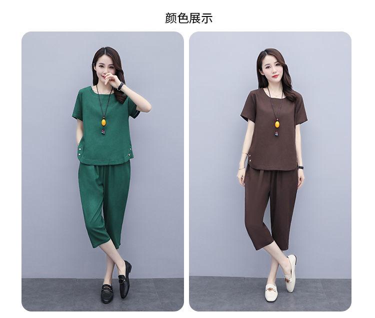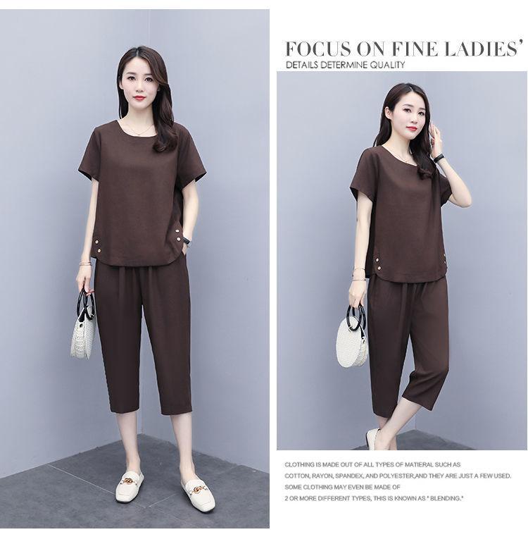 Traje de Algodón y Lino Talla Grande para Mujer Estilo Coreano Moda de Verano Chica Gorda Look Adelgazante Manga Corta Holgado Pantalones Capri Conjunto de Dos Piezas