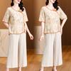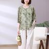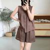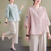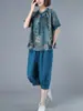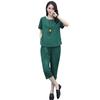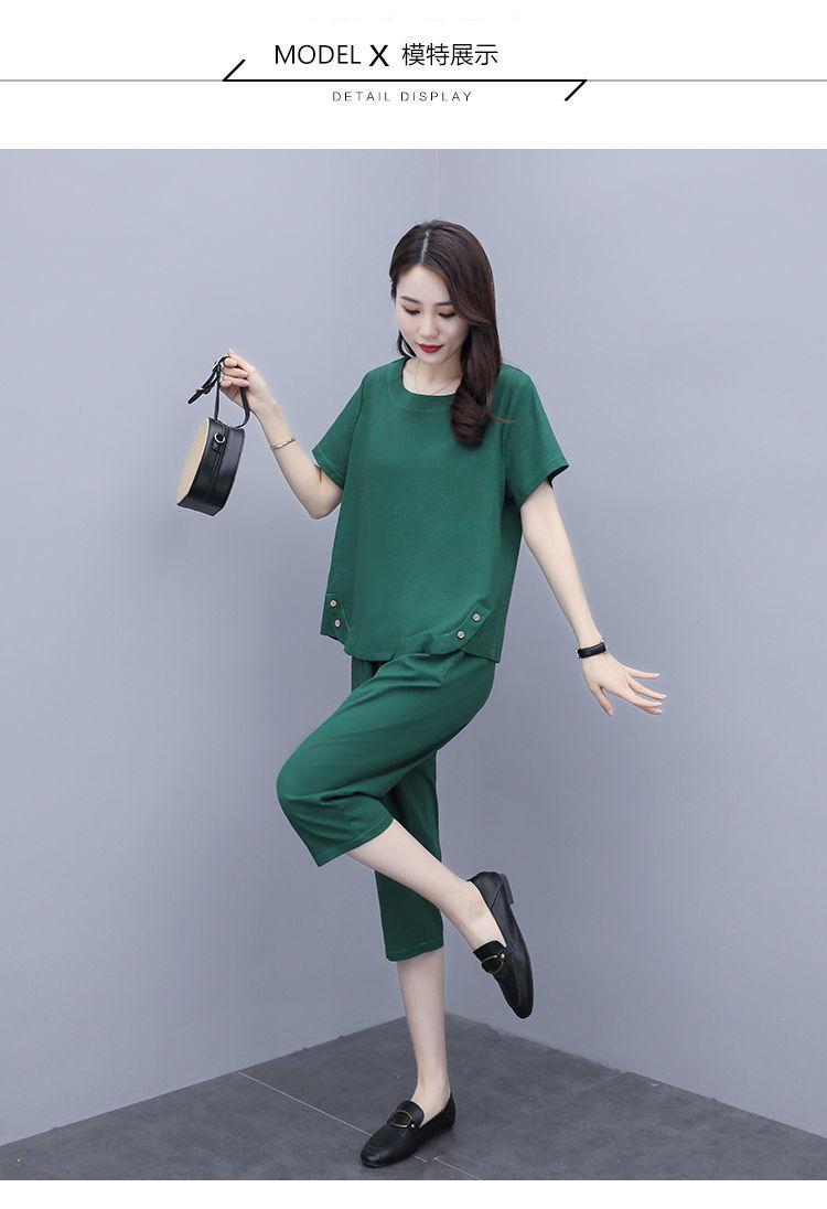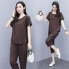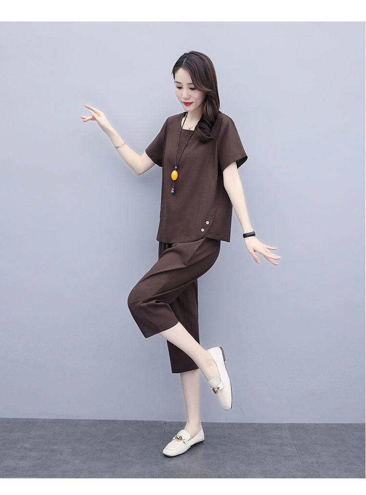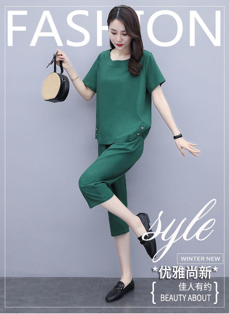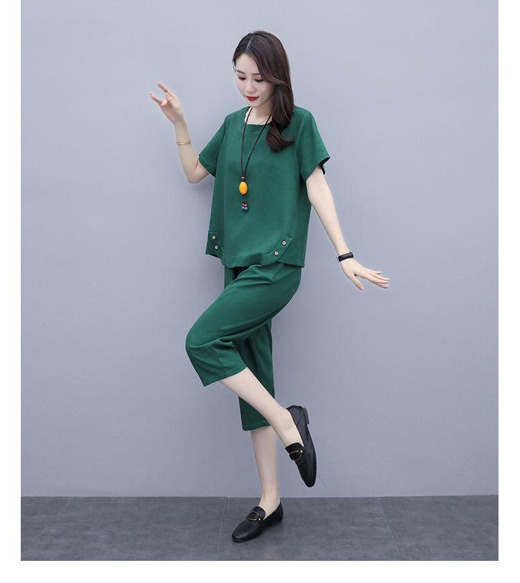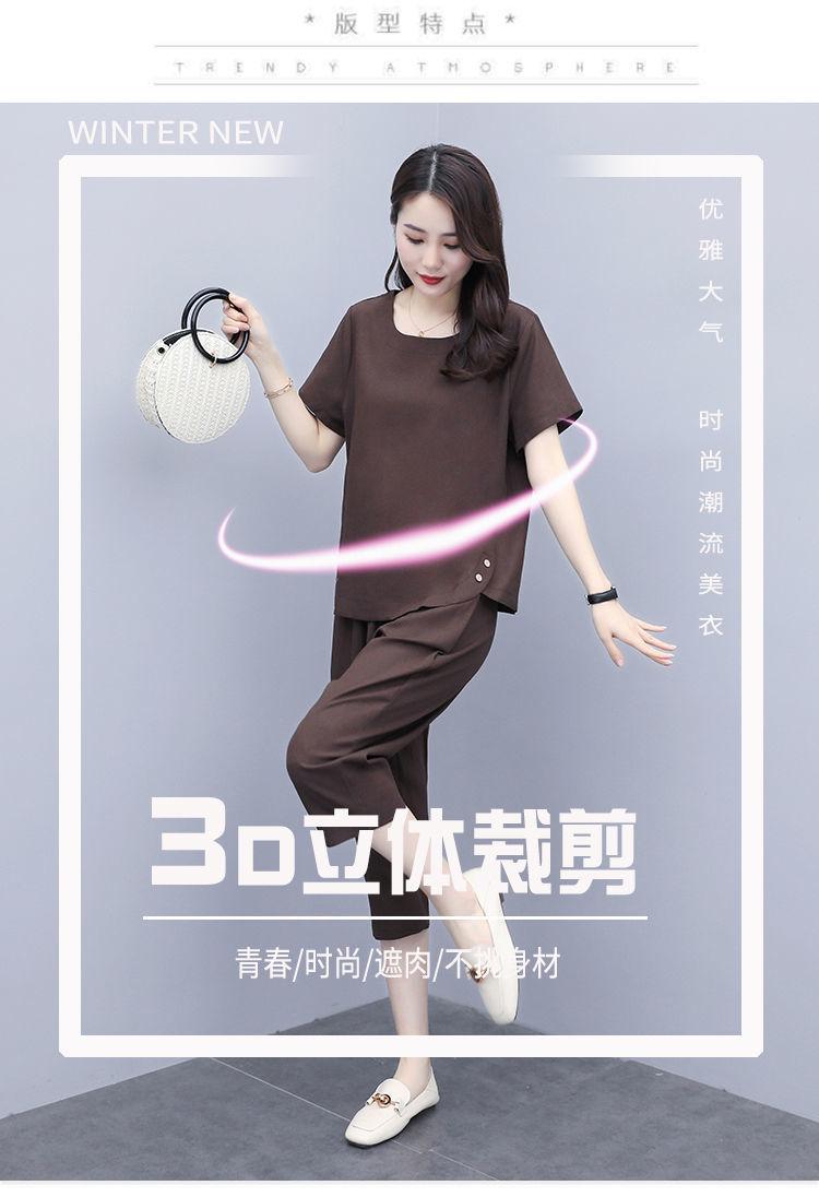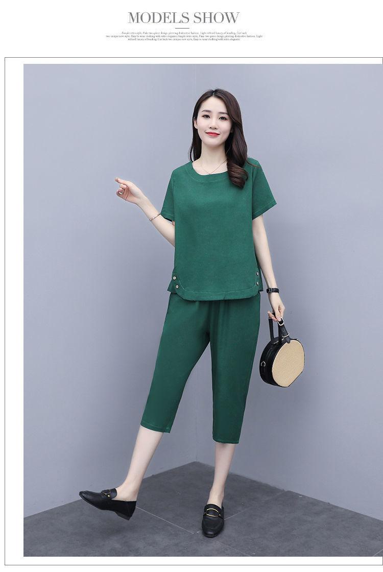 Traje de Algodón y Lino Talla Grande para Mujer Estilo Coreano Moda de Verano Chica Gorda Look Adelgazante Manga Corta Holgado Pantalones Capri Conjunto de Dos Piezas