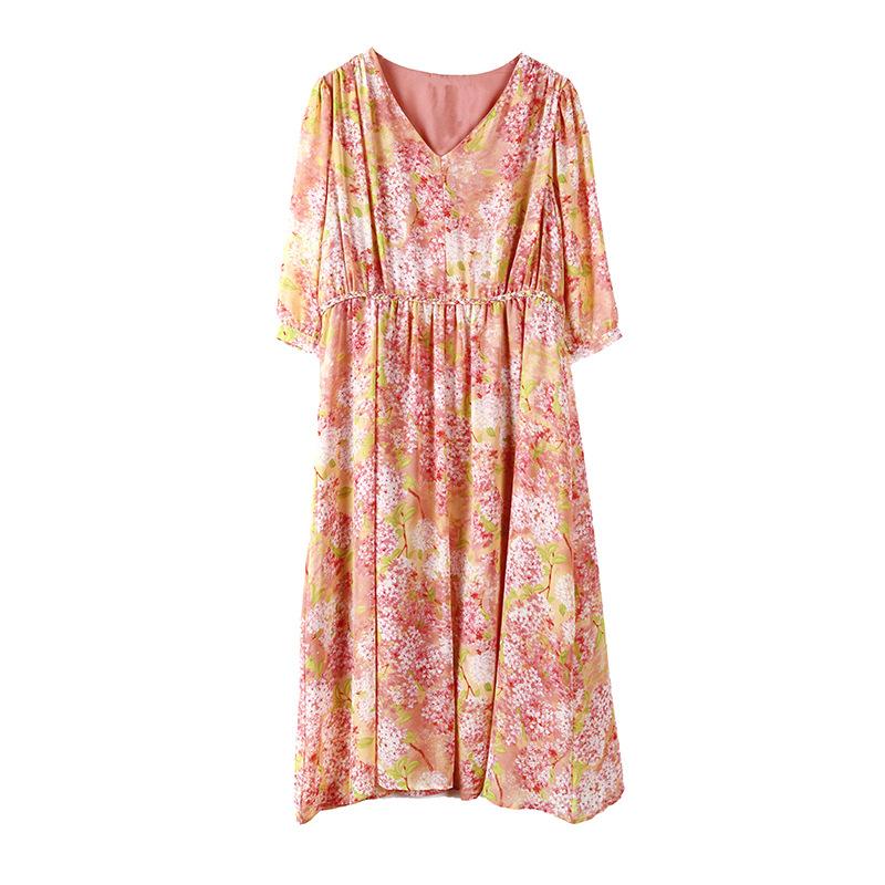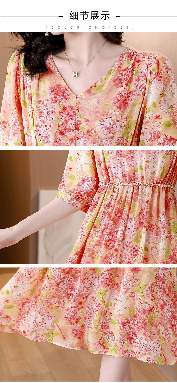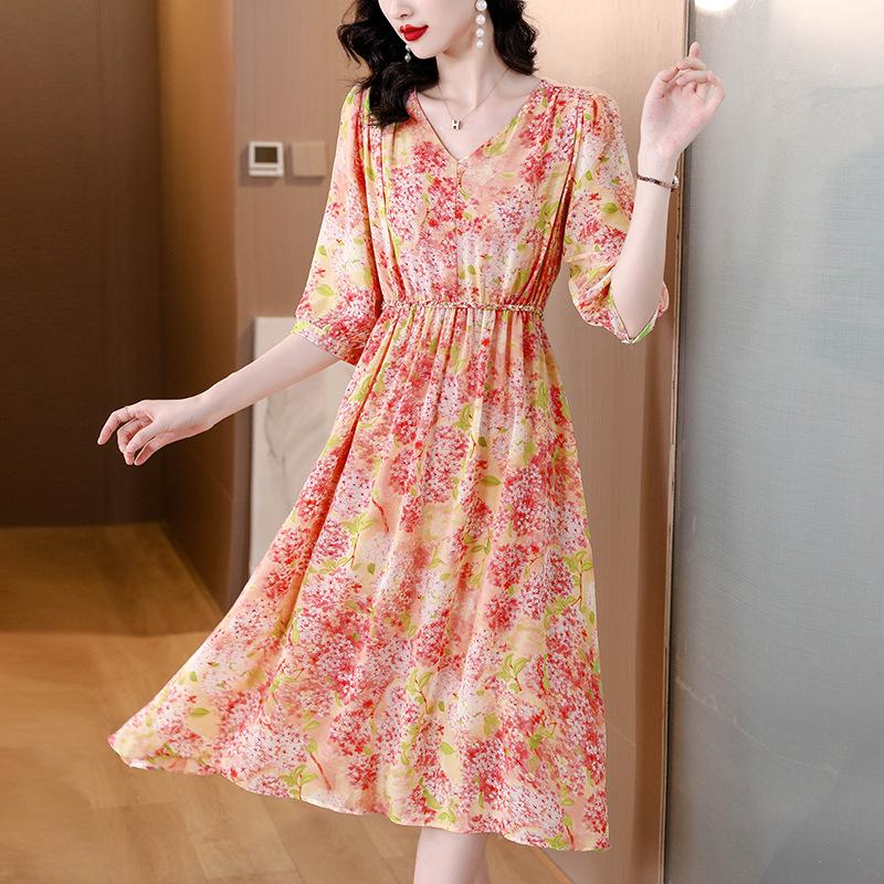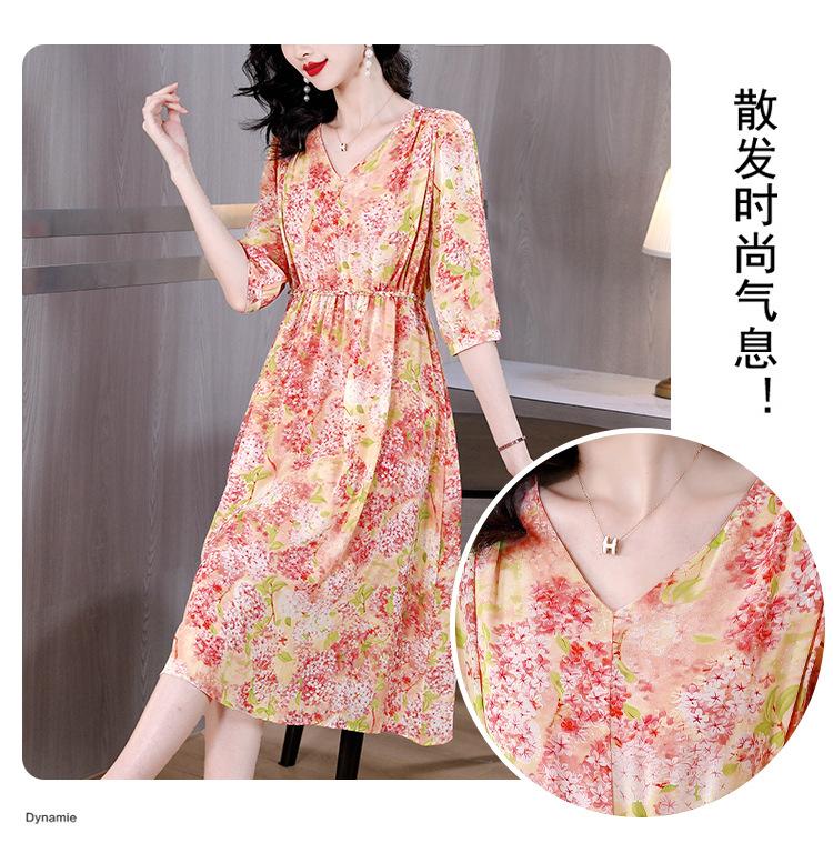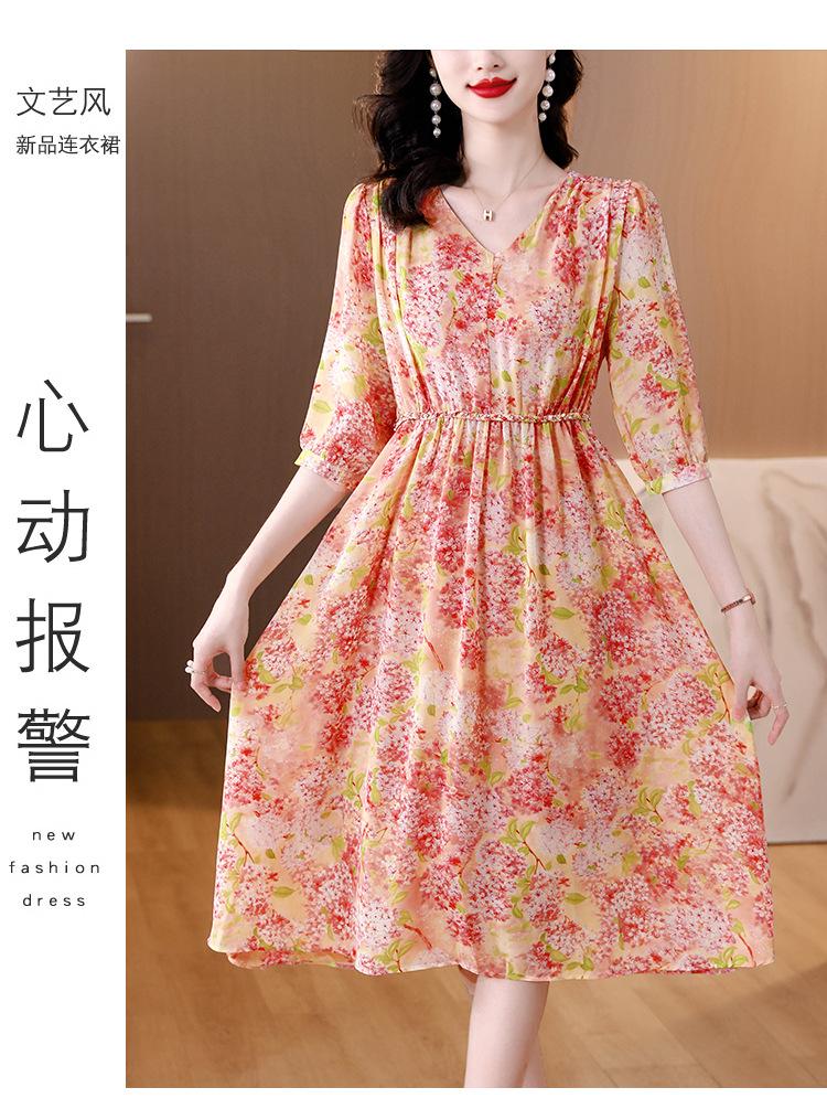 Vestido de seda sintética con escote en V francés para mujer, novedad de verano 2024, vestido rosa dulce antiedad con cintura de longitud media