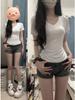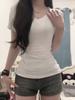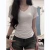 Camiseta básica informal blanca de manga corta con escote en V y hombros descubiertos para mujer, nueva camiseta de verano, top corto ajustado interior.