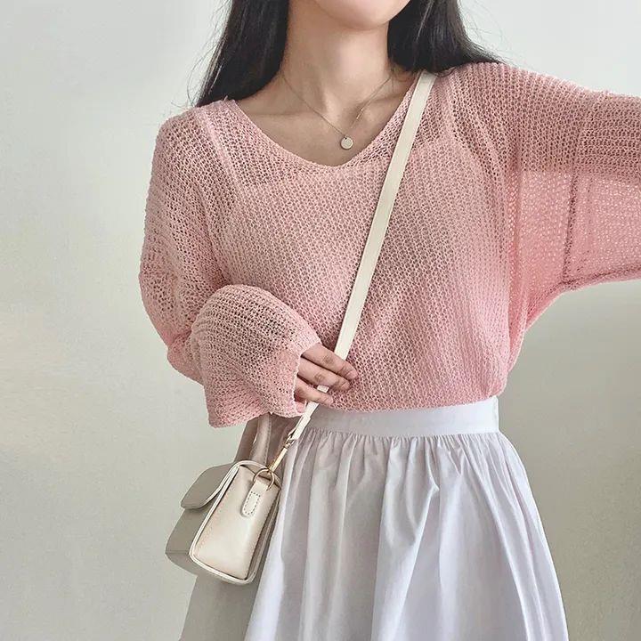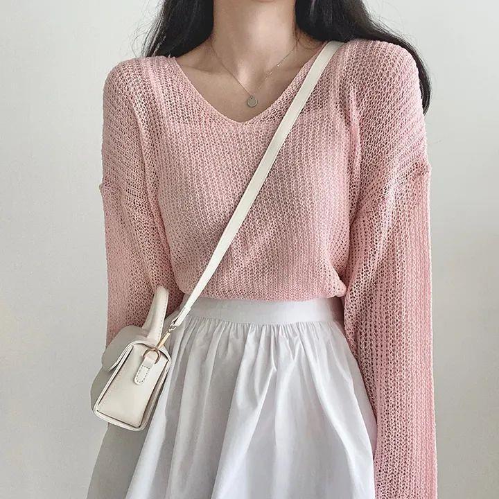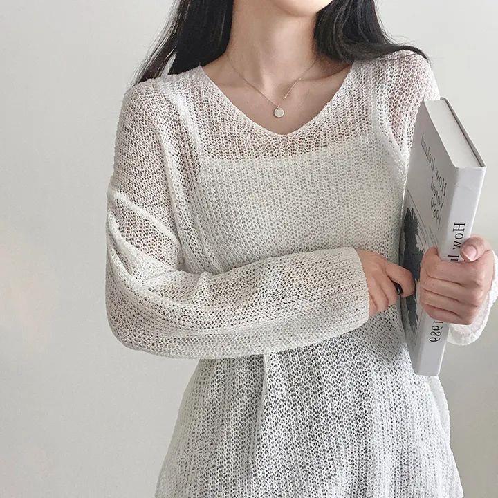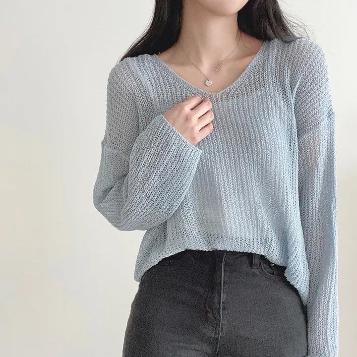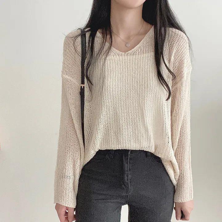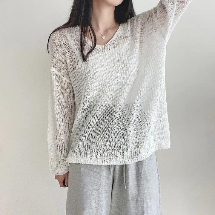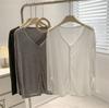 Blusa holgada de seda helada de estilo coreano para verano, fina, con protección solar, cuello en V, color liso, de punto temprano