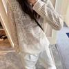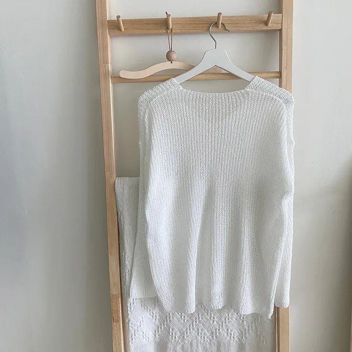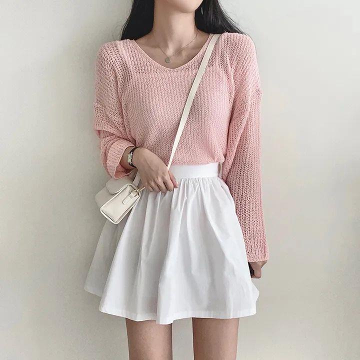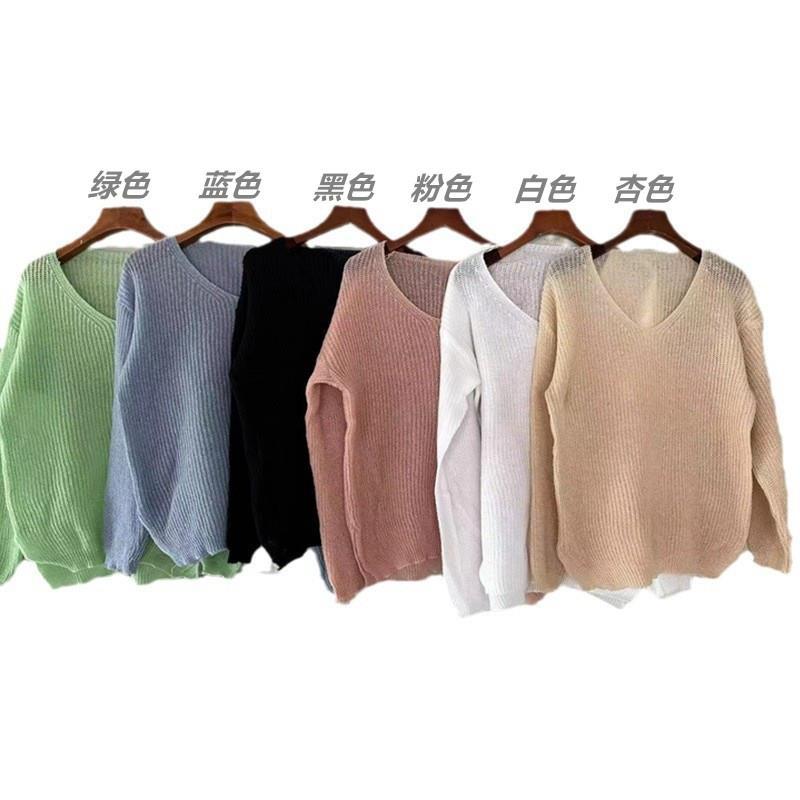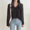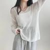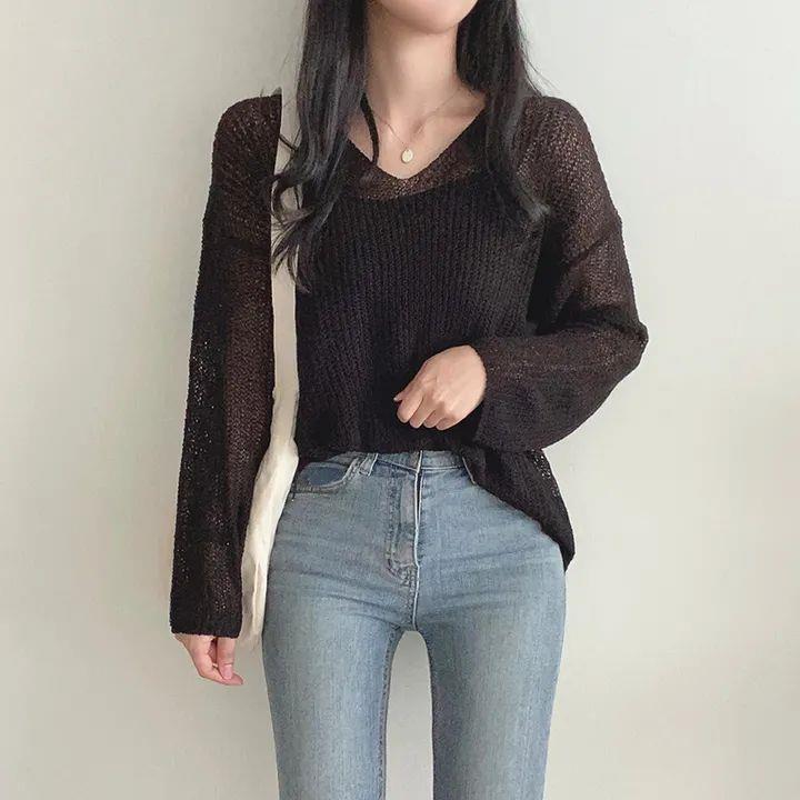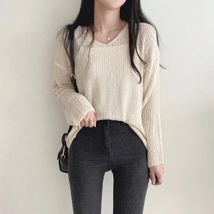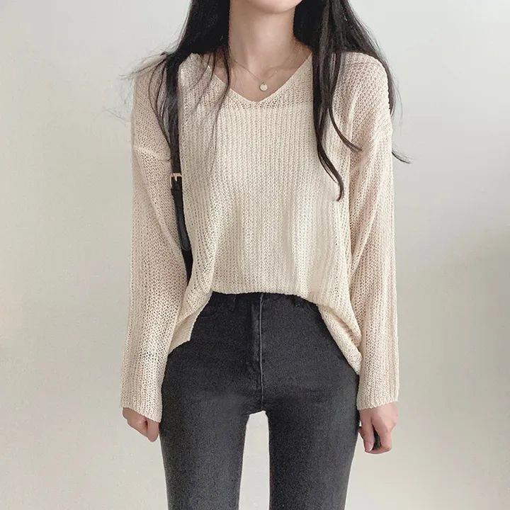 Blusa holgada de seda helada de estilo coreano para verano, fina, con protección solar, cuello en V, color liso, de punto temprano
