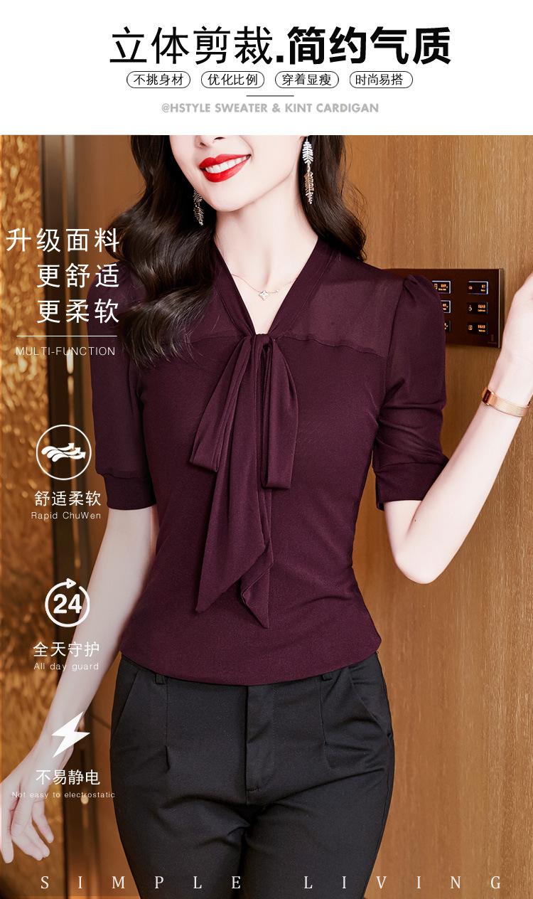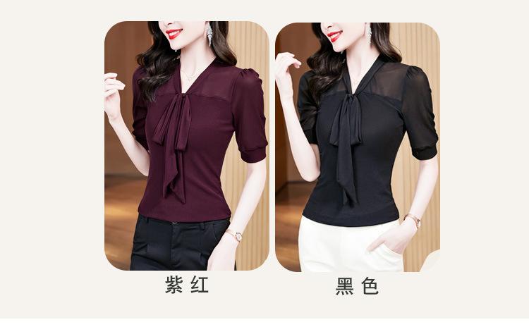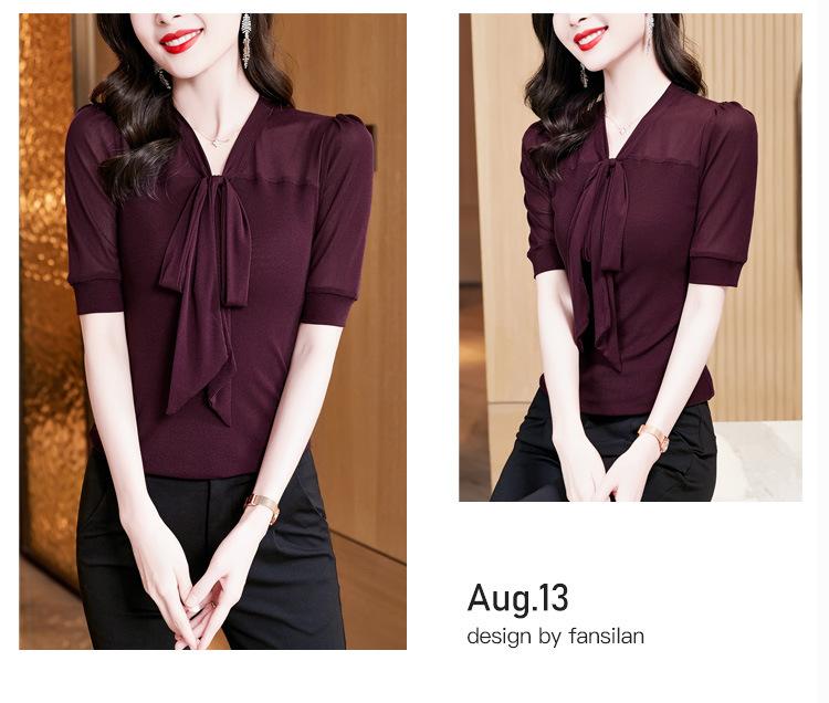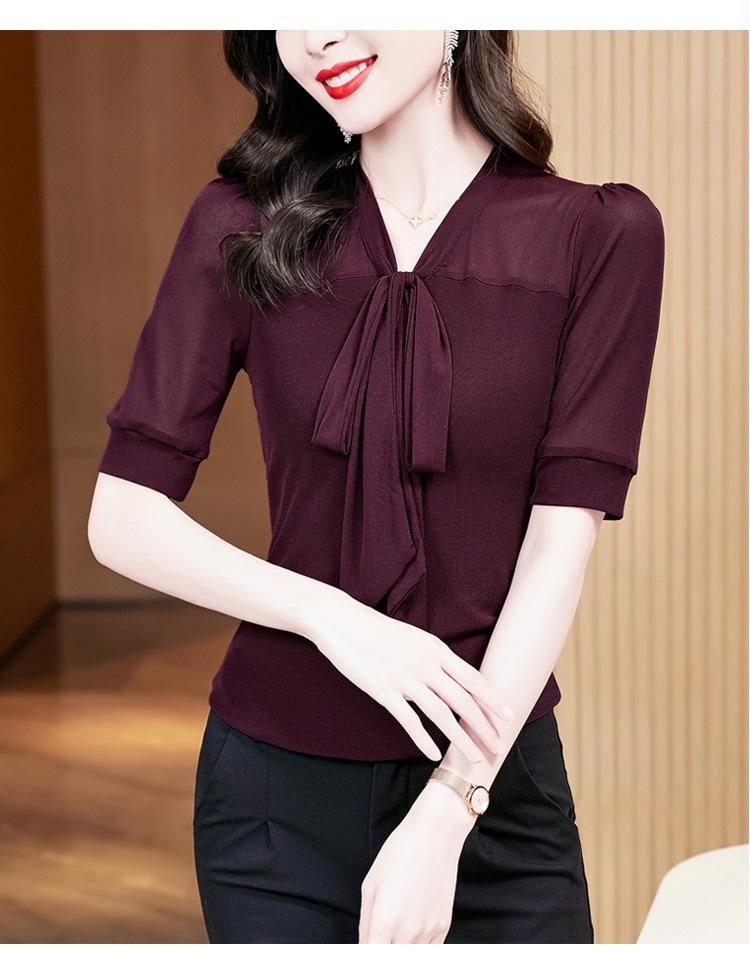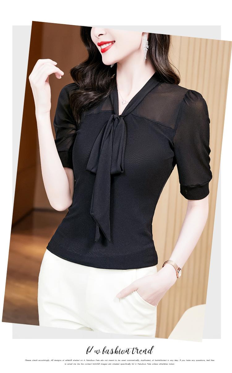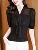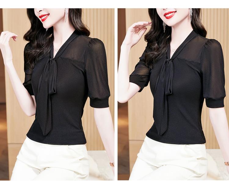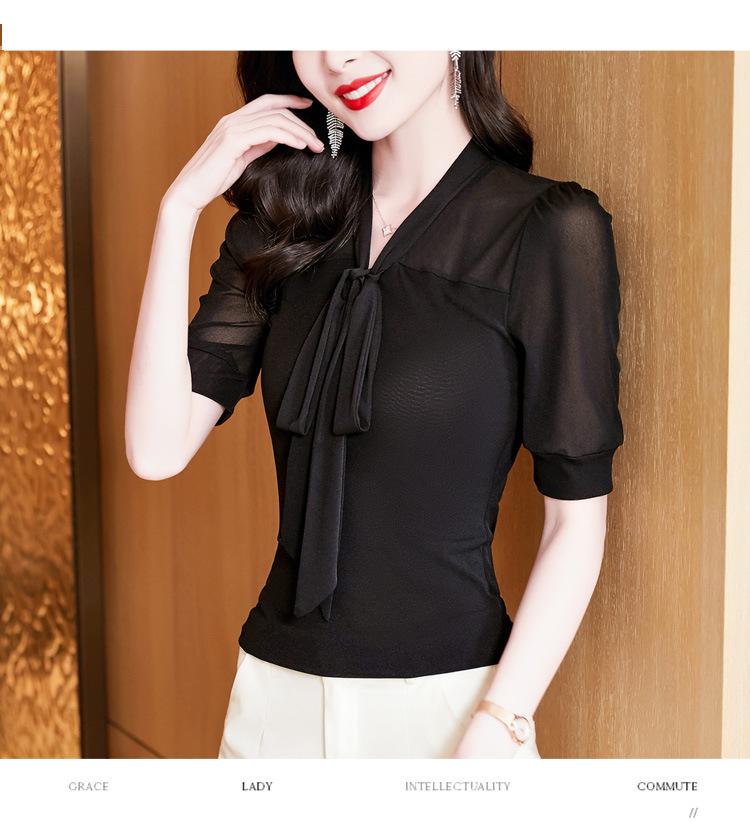 Elegante Versátil Cuello en V Color Puro Malla Encaje Lazo Manga Corta Top Verano 2023 Dulce Camisa Básica para Mujer Trbottomy