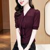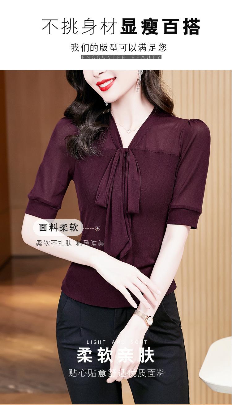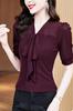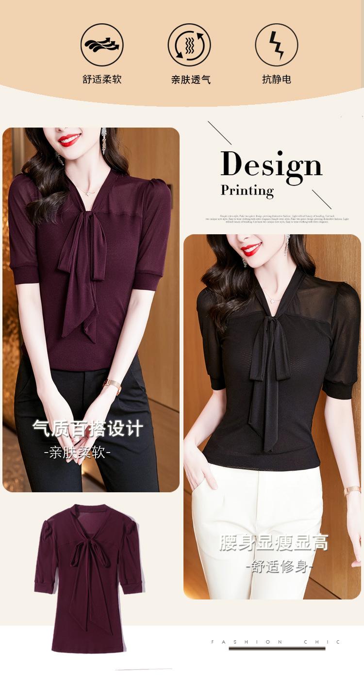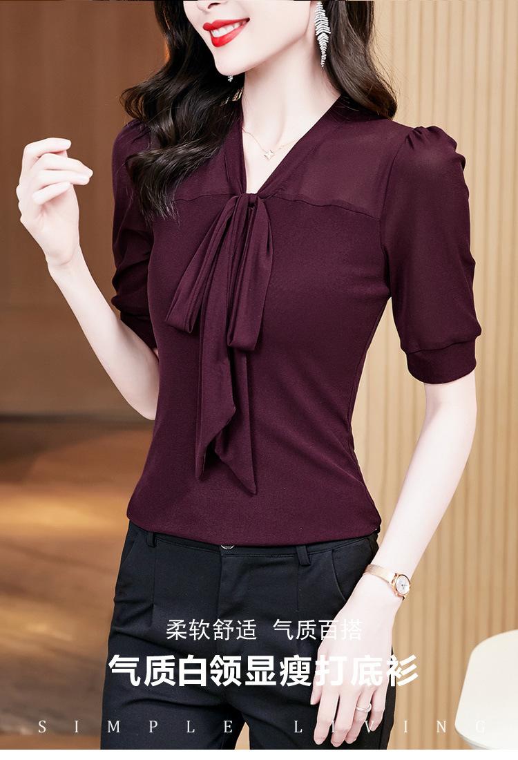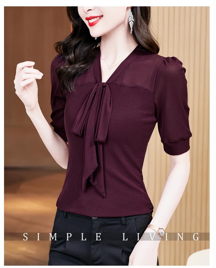 Elegante Versátil Cuello en V Color Puro Malla Encaje Lazo Manga Corta Top Verano 2023 Dulce Camisa Básica para Mujer Trbottomy