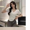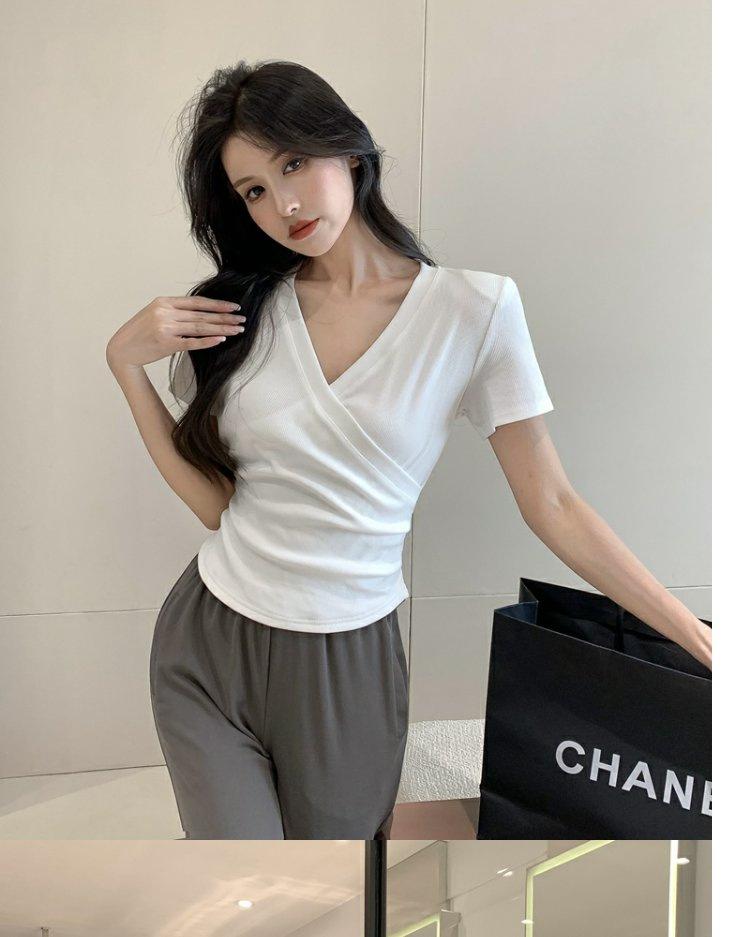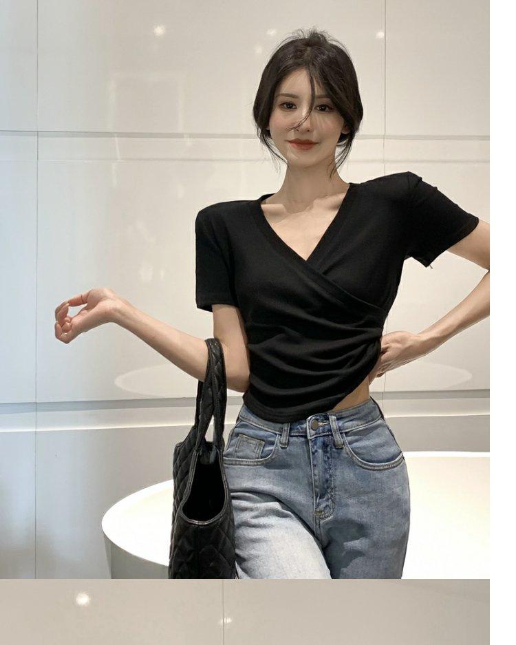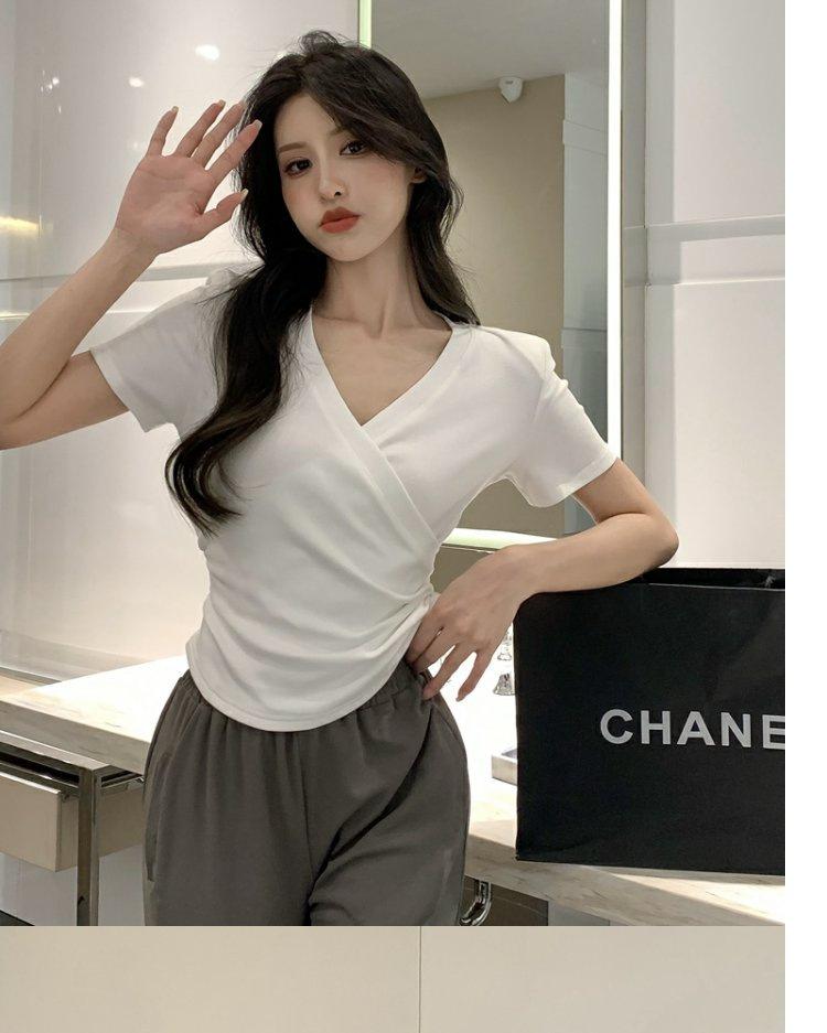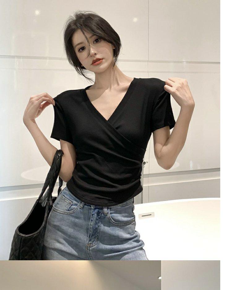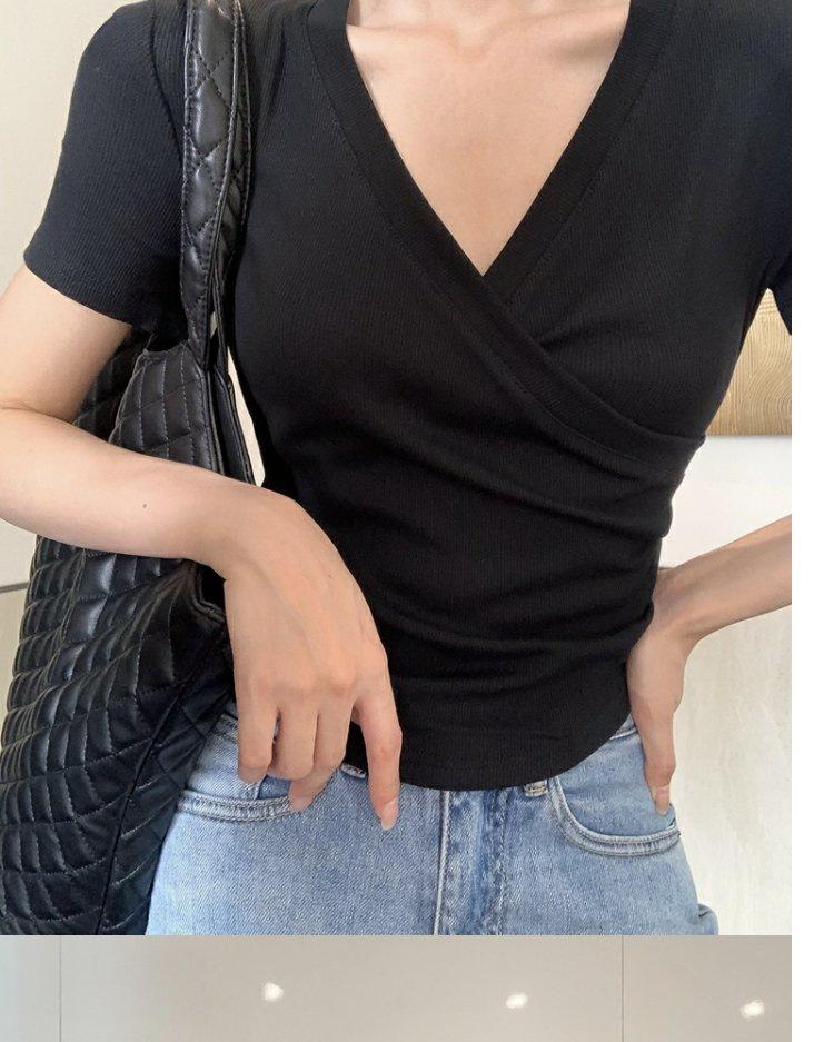 Top corto de color sólido con cuello en V y hombros descubiertos de manga corta para mujer, Verano 2024 Nuevo, camiseta nicho plisada cruzada de deseo puro