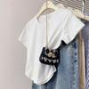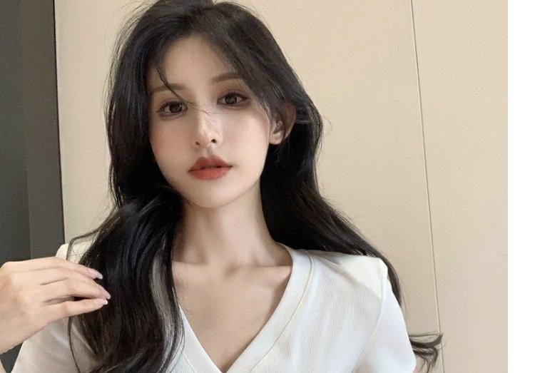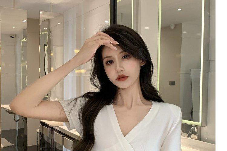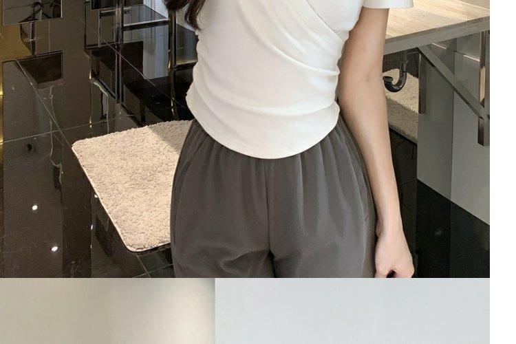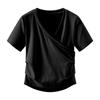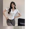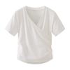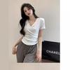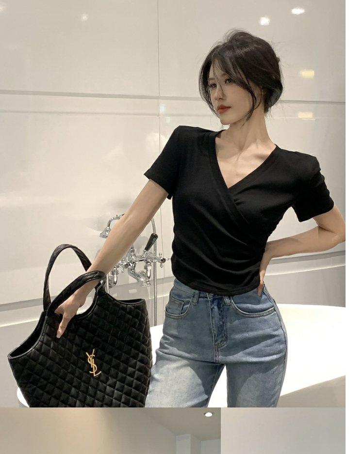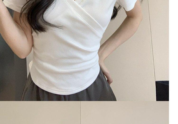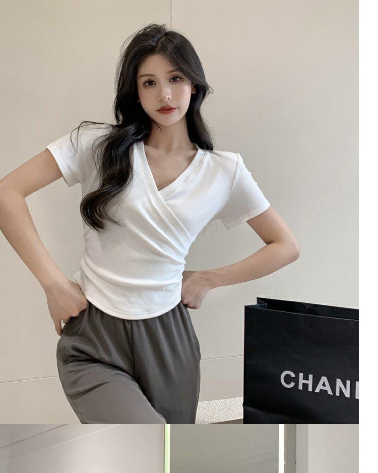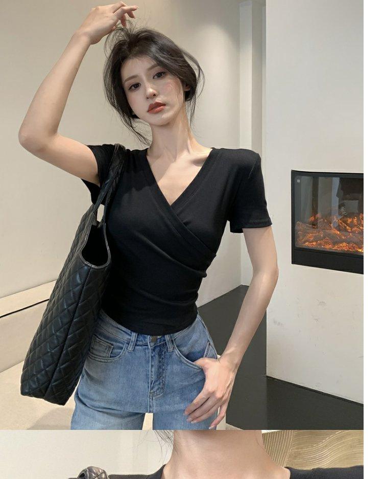 Top corto de color sólido con cuello en V y hombros descubiertos de manga corta para mujer, Verano 2024 Nuevo, camiseta nicho plisada cruzada de deseo puro