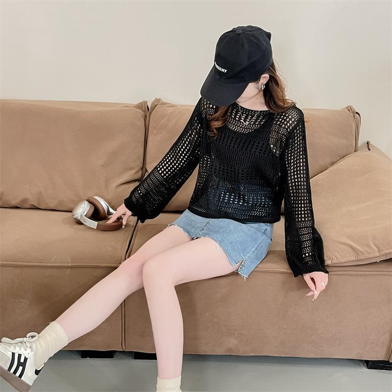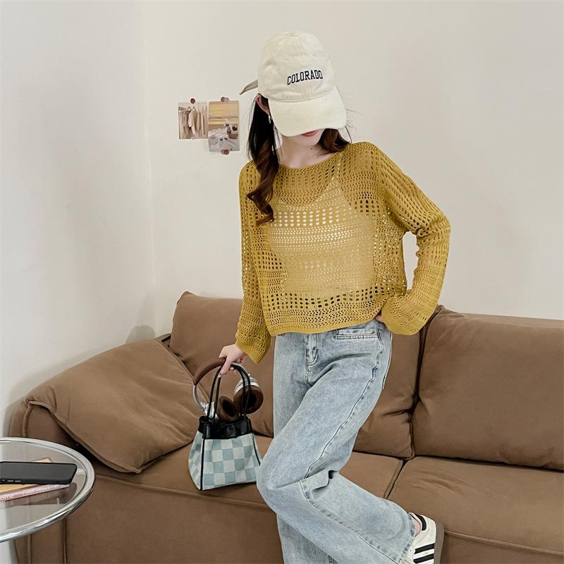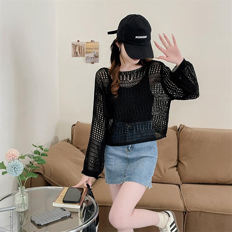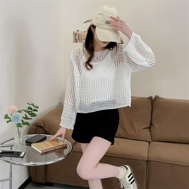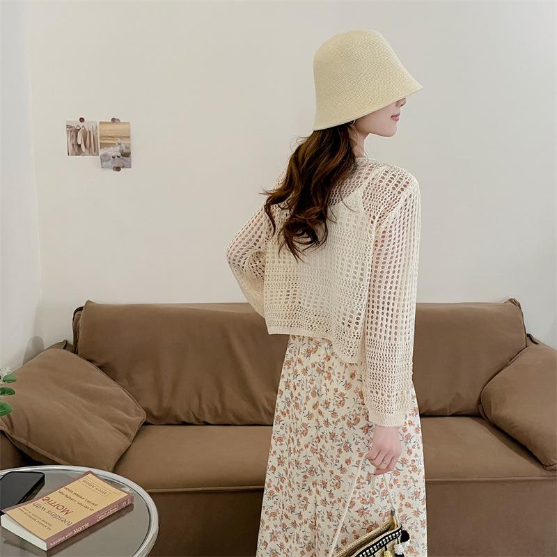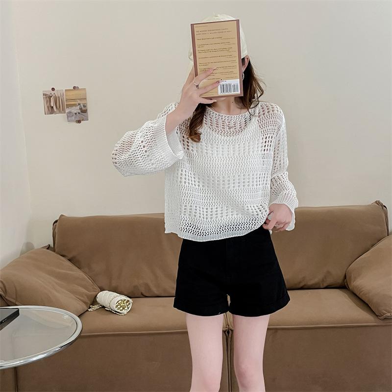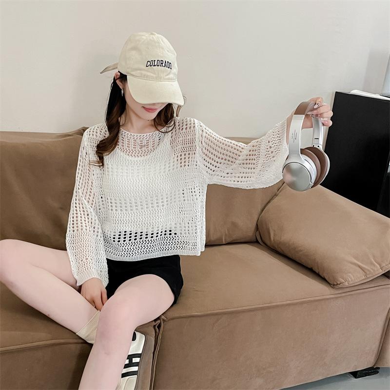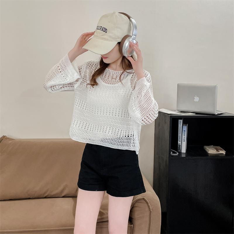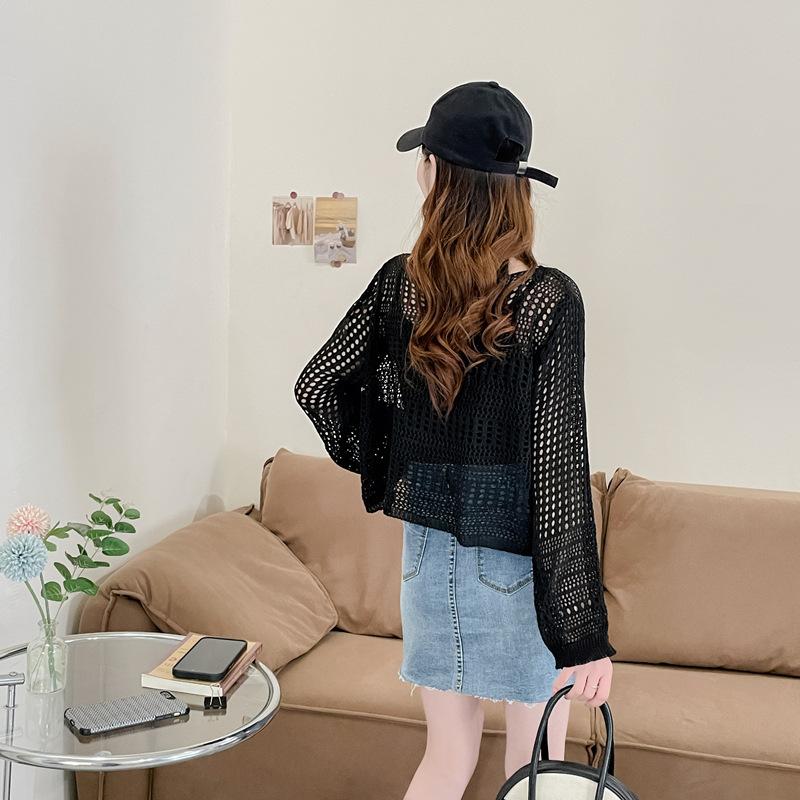 Blusa de Punto Calada Corta Protectora Solar de Tiro Real para Mujer Verano Nuevo Diseño Nicho Top Dulce de Manga Larga