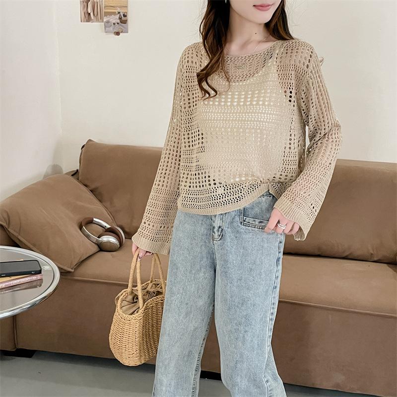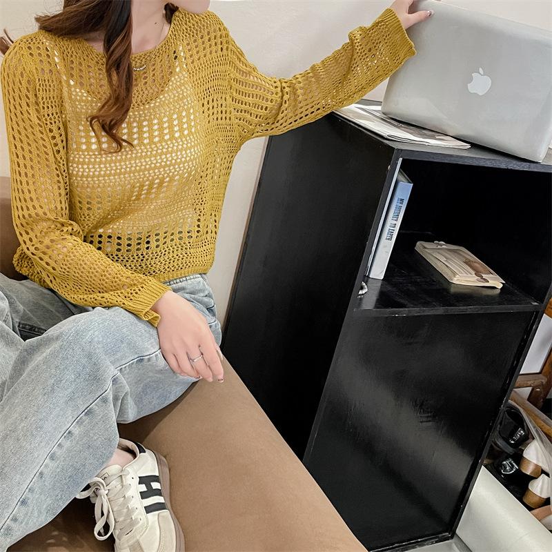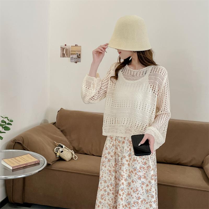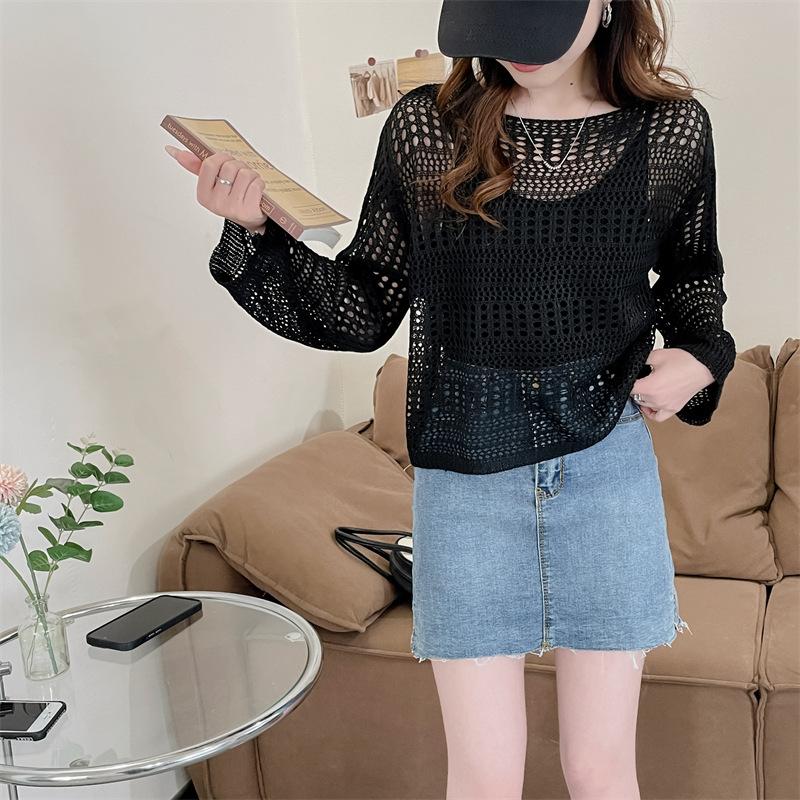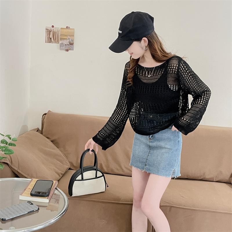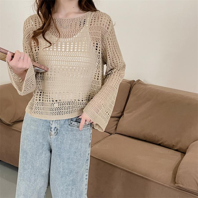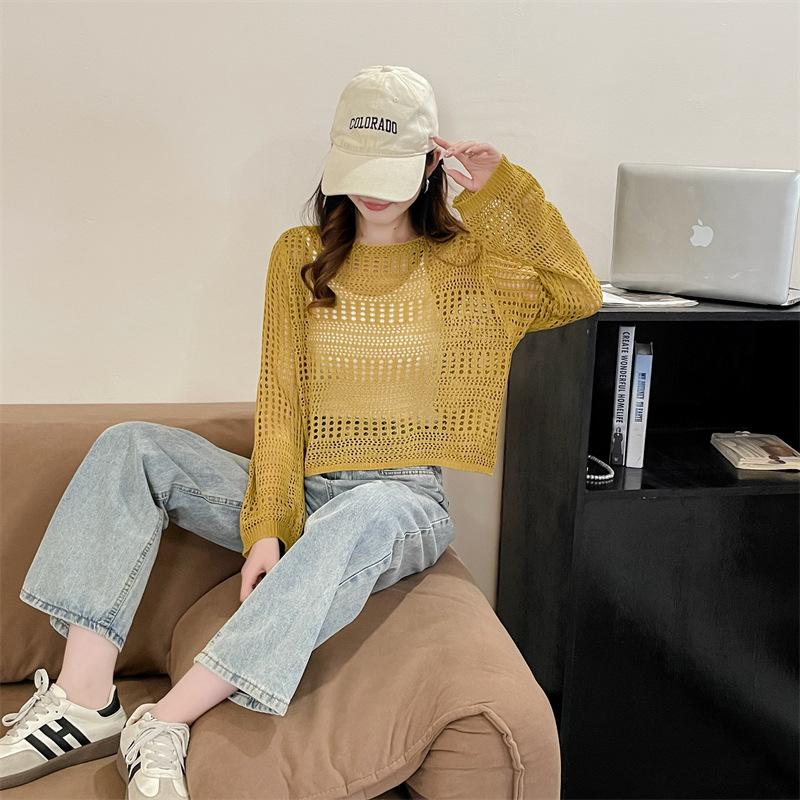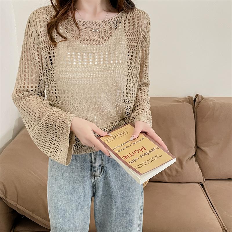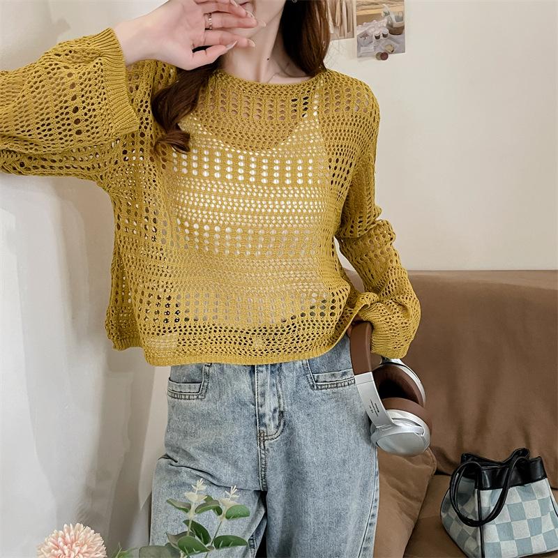 Blusa de Punto Calada Corta Protectora Solar de Tiro Real para Mujer Verano Nuevo Diseño Nicho Top Dulce de Manga Larga