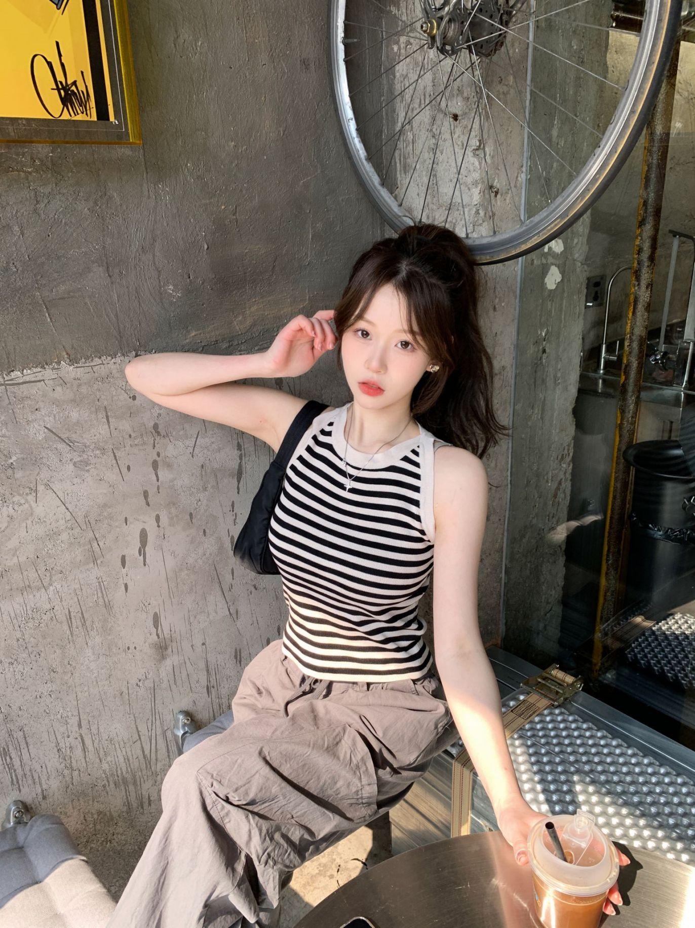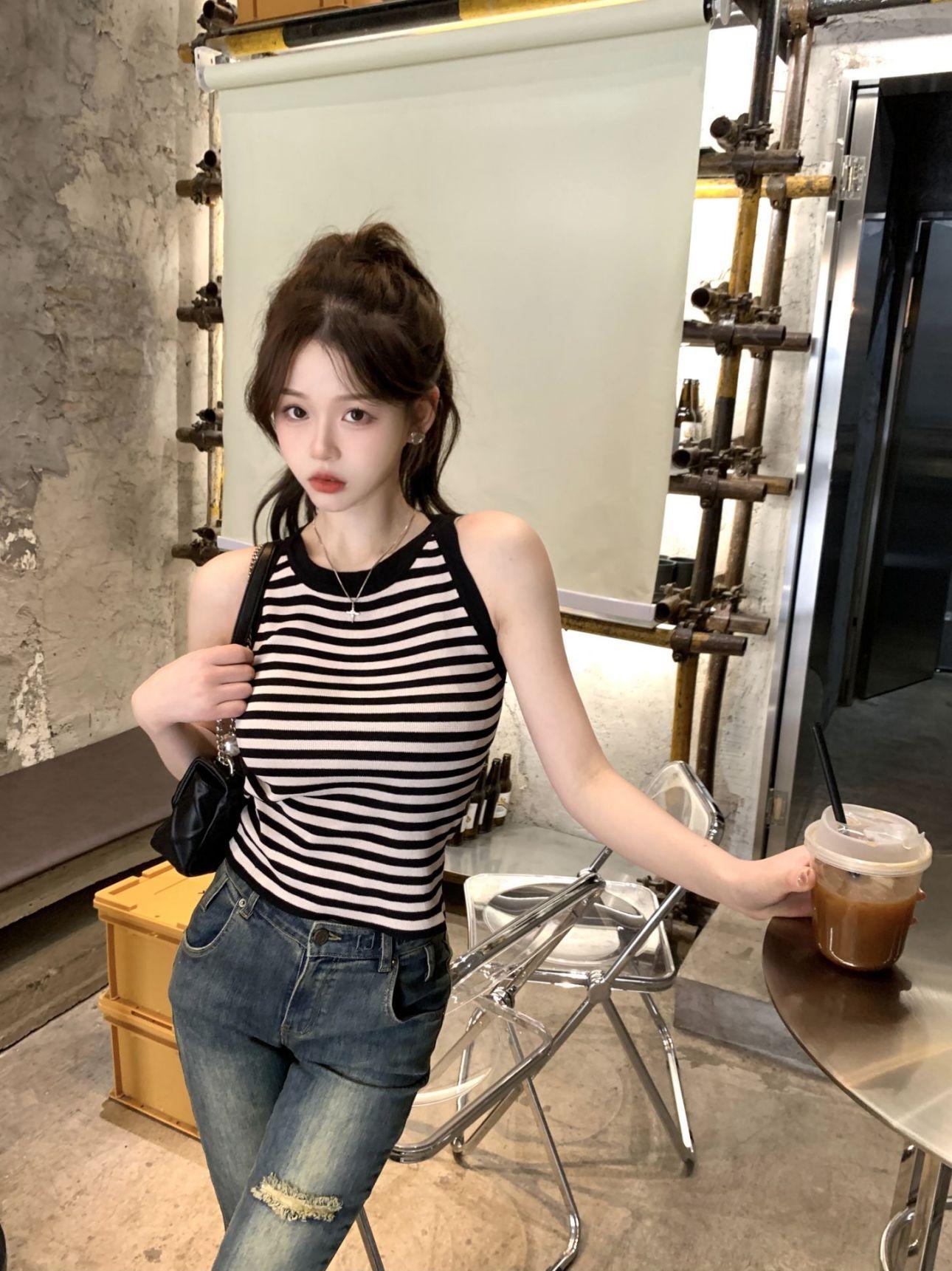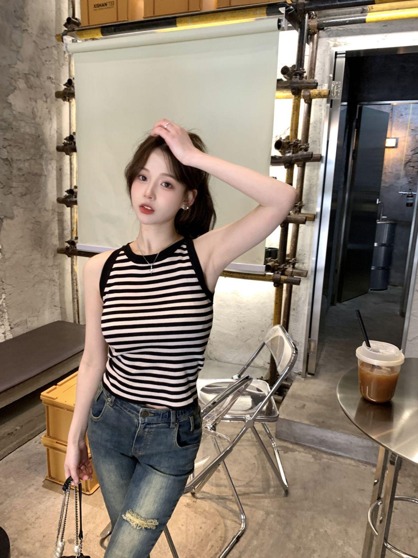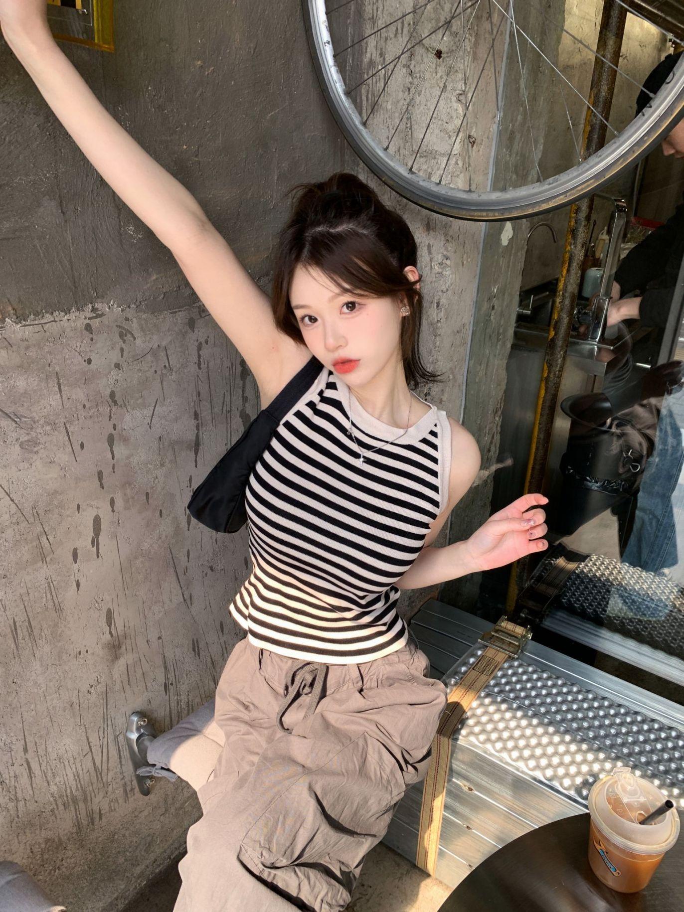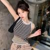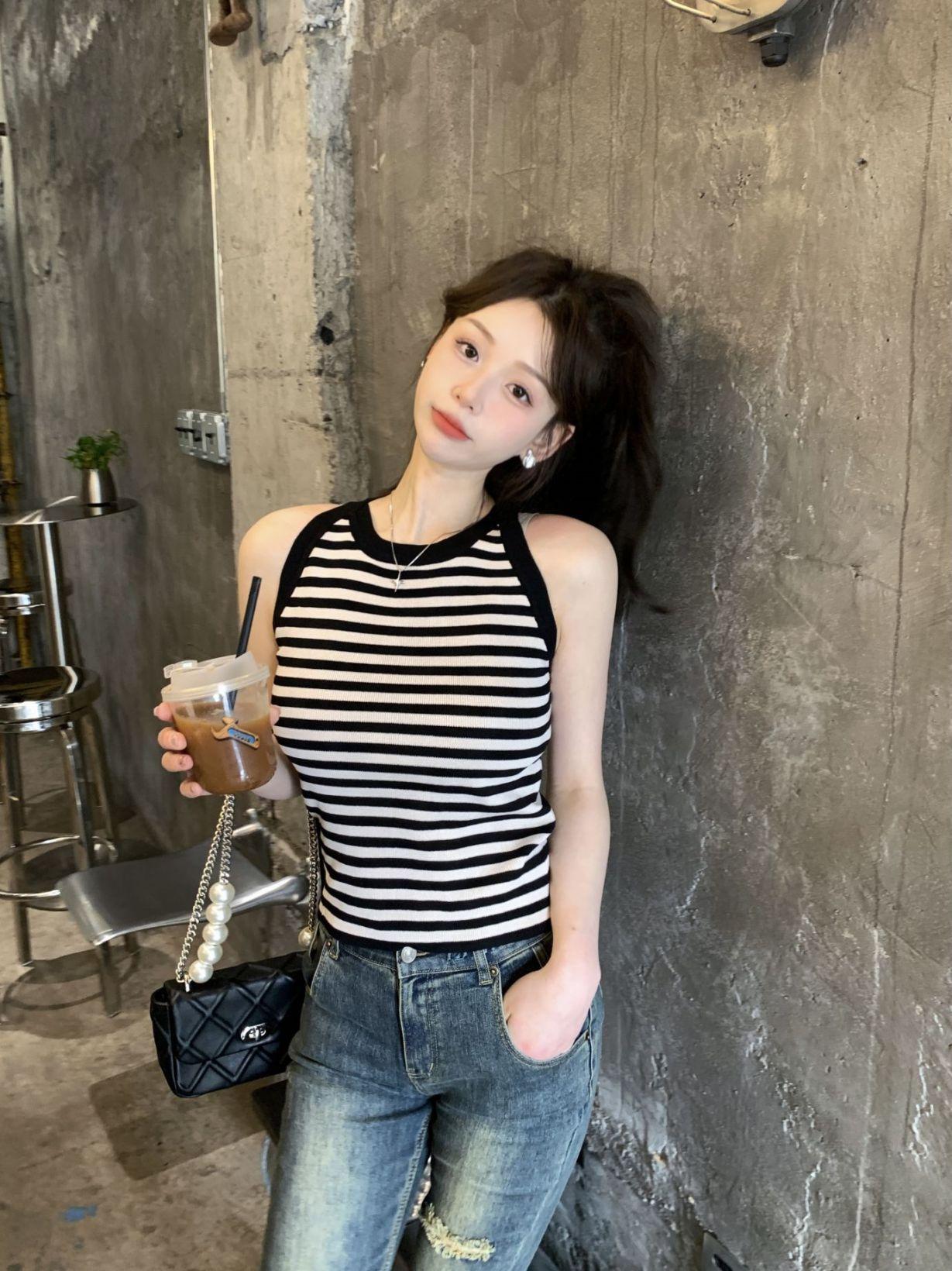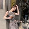 Diseño de top de chica guapa 2023 chaleco de punto a rayas versátil sin mangas delgado adelgazante corto para mujer primavera y verano