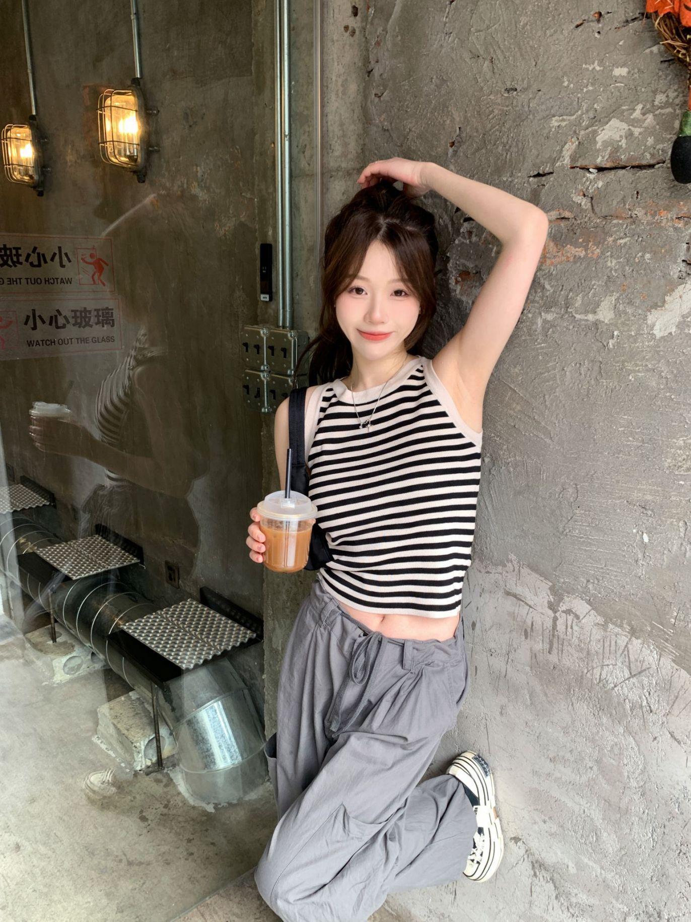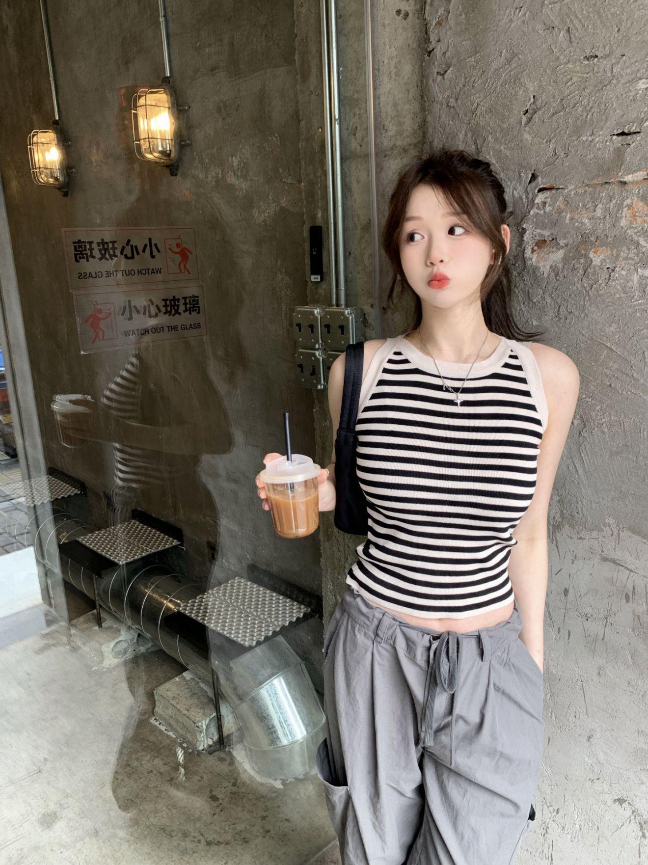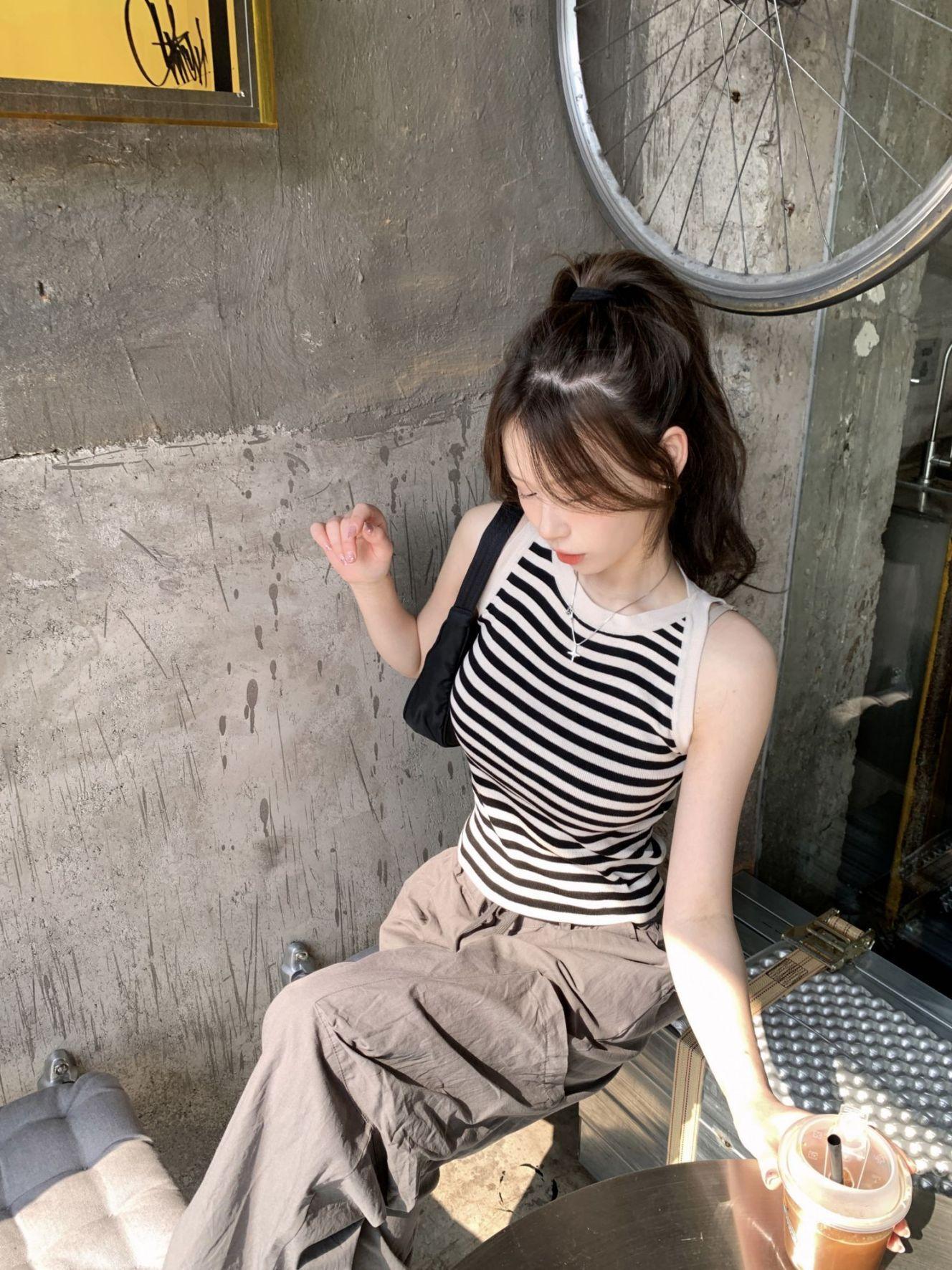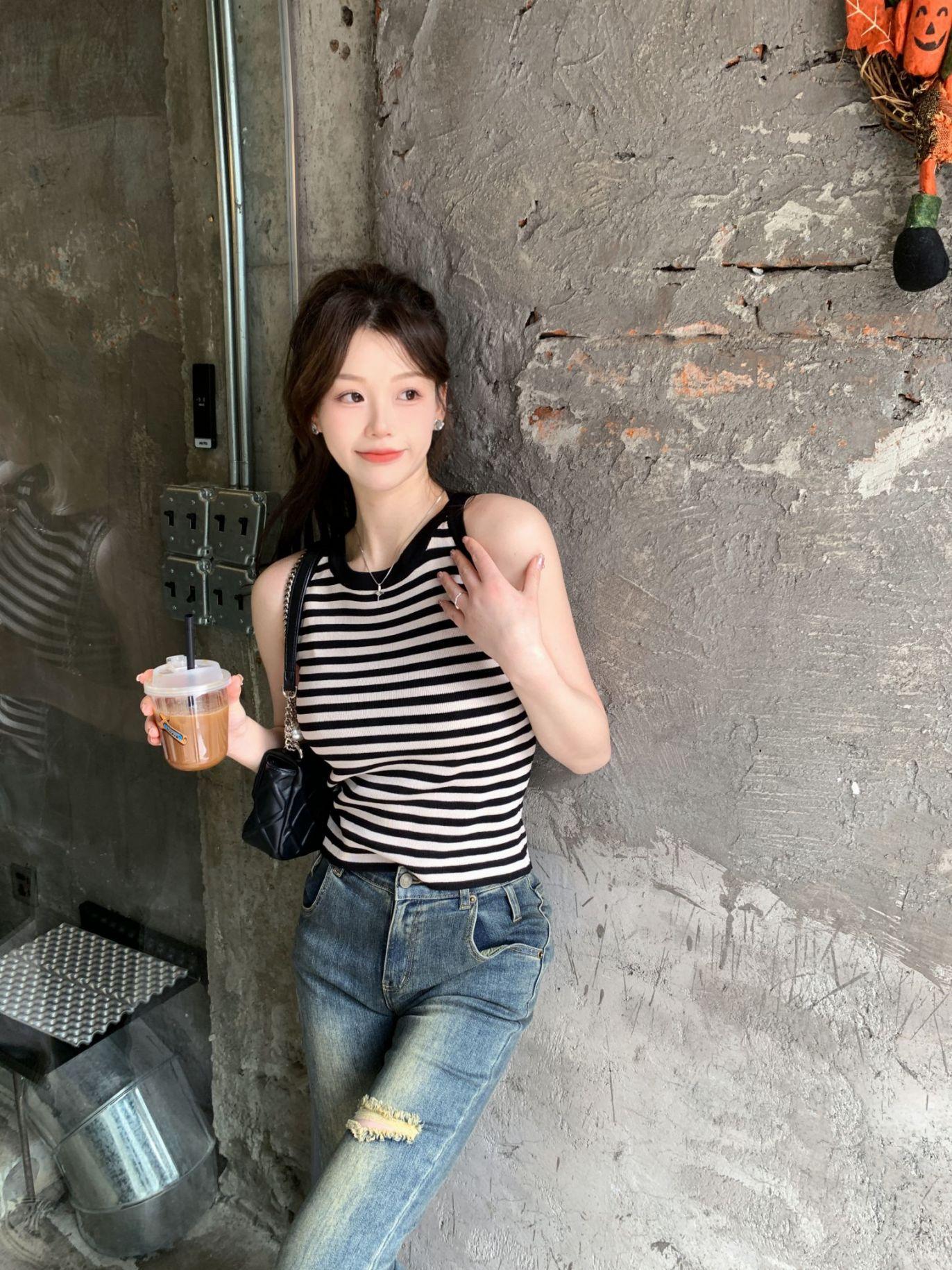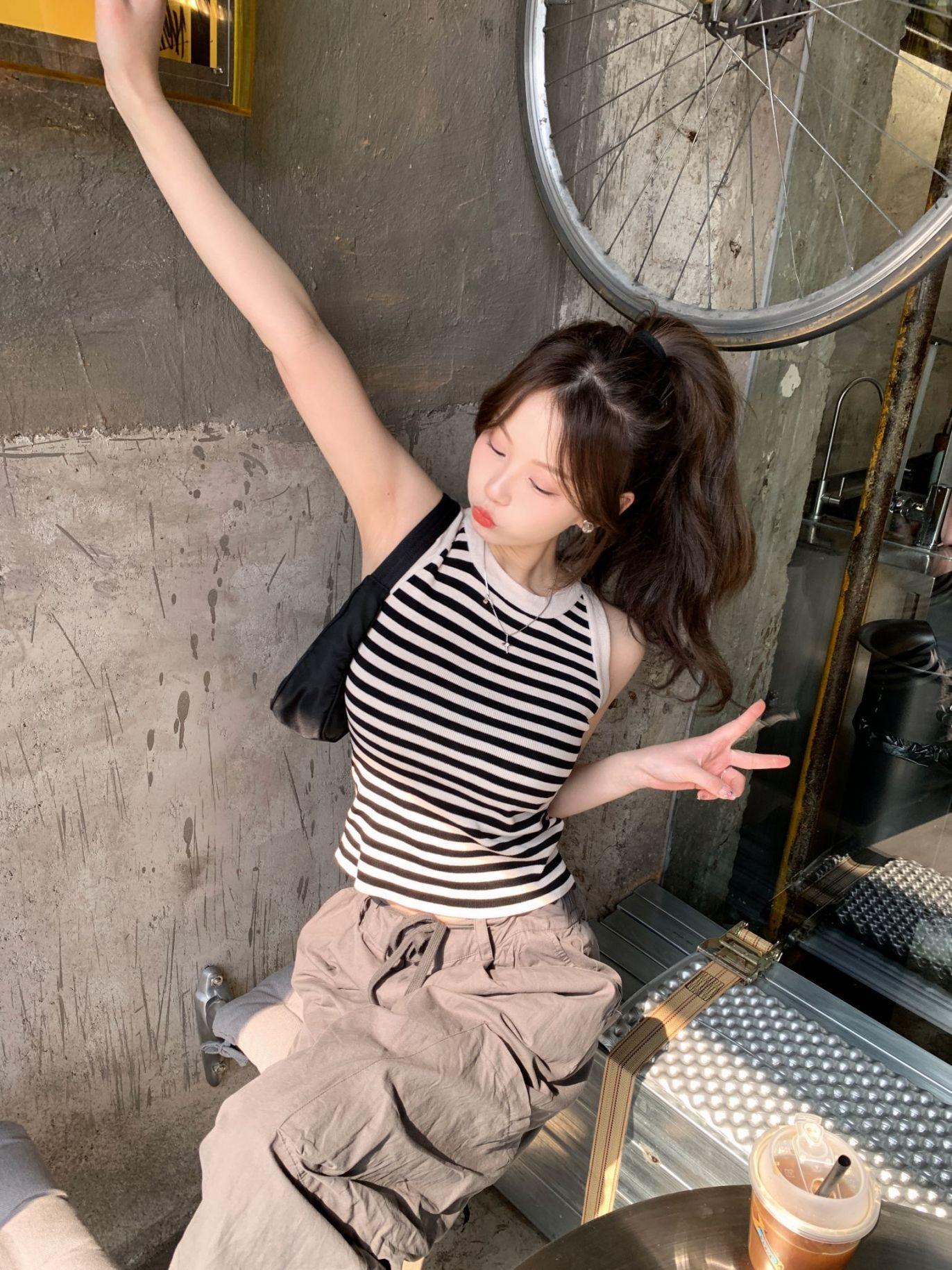 Diseño de top de chica guapa 2023 chaleco de punto a rayas versátil sin mangas delgado adelgazante corto para mujer primavera y verano