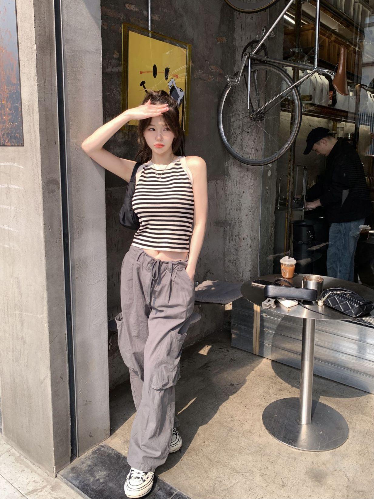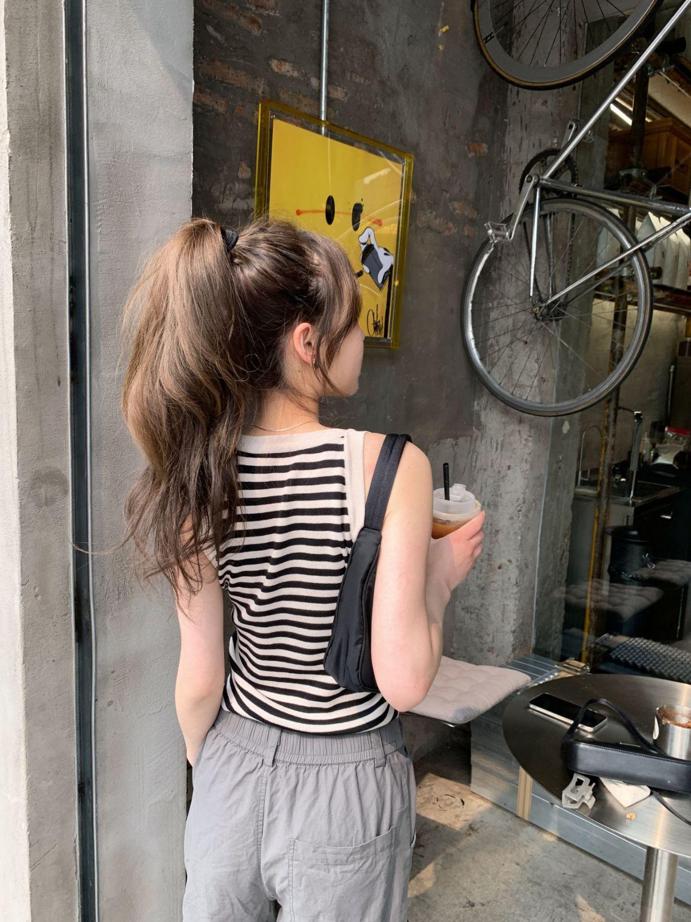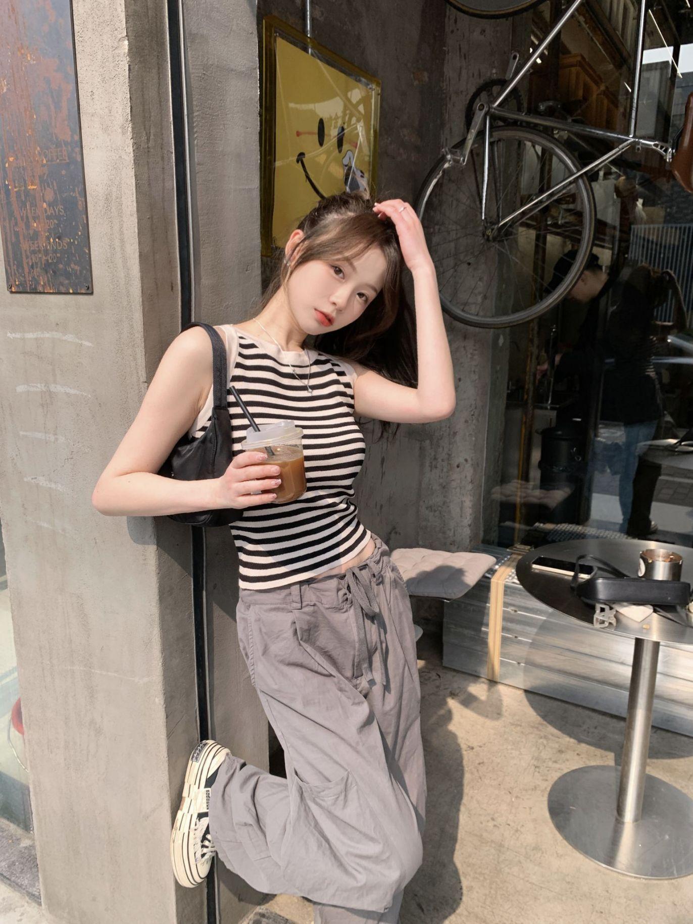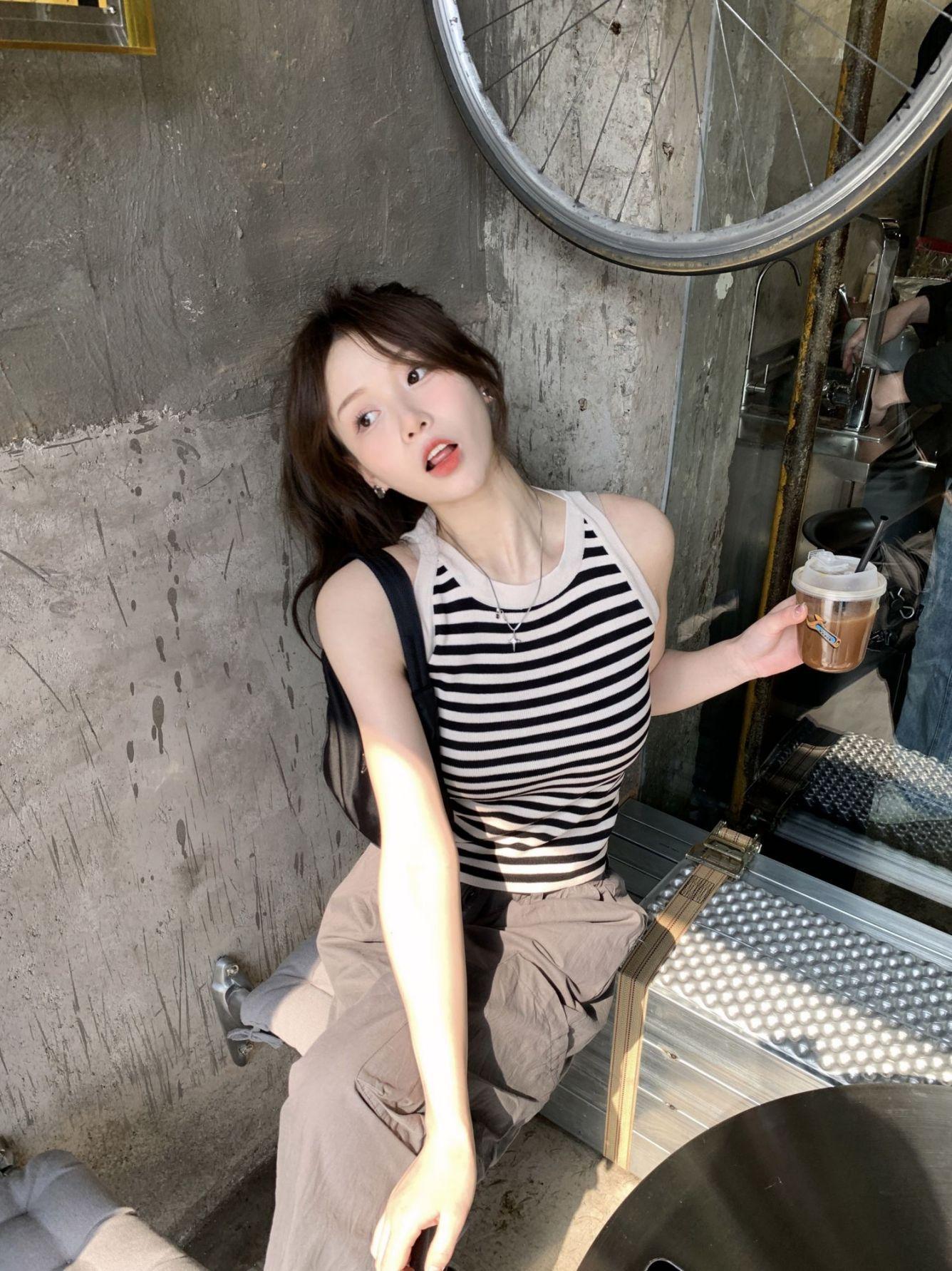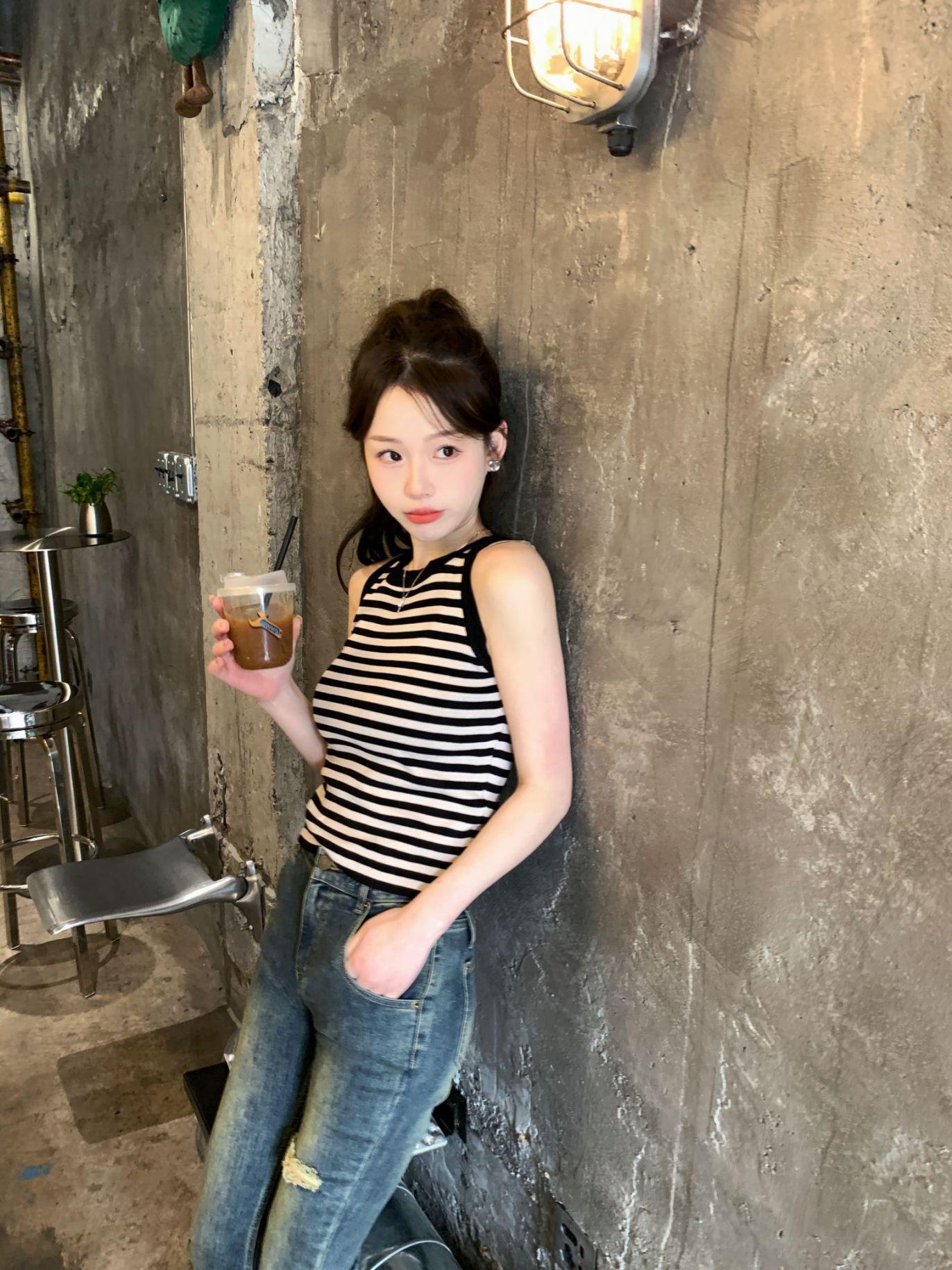Diseño de top de chica guapa 2023 chaleco de punto a rayas versátil sin mangas delgado adelgazante corto para mujer primavera y verano