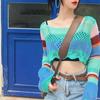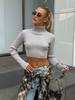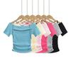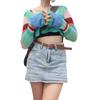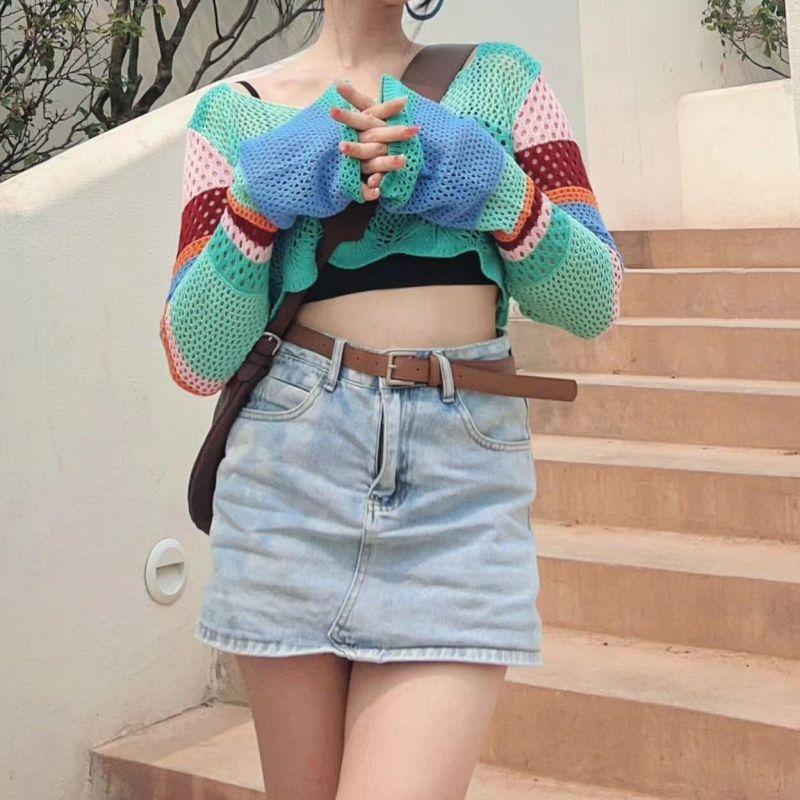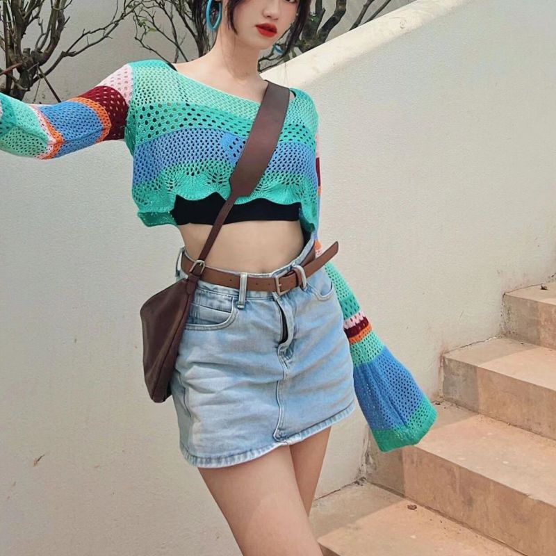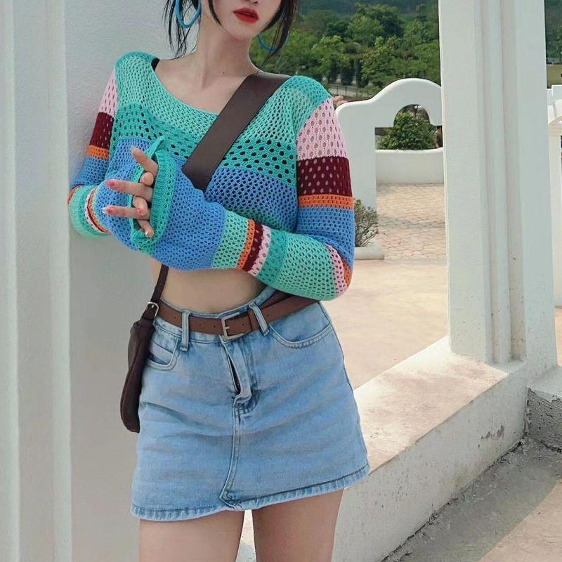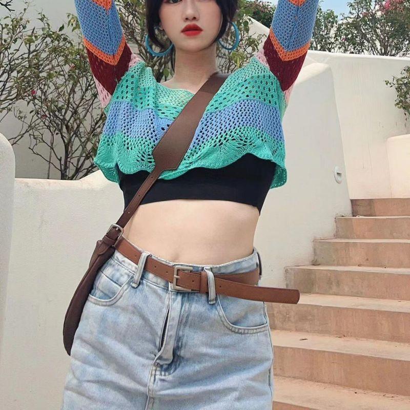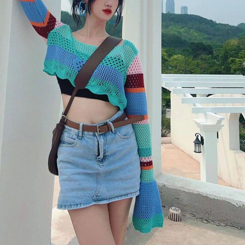 Verano Nuevo Color Calado Corto Ombligo Suéter de Manga Larga para Mujer Elegante Casual Manga Acampanada Top de Vacaciones