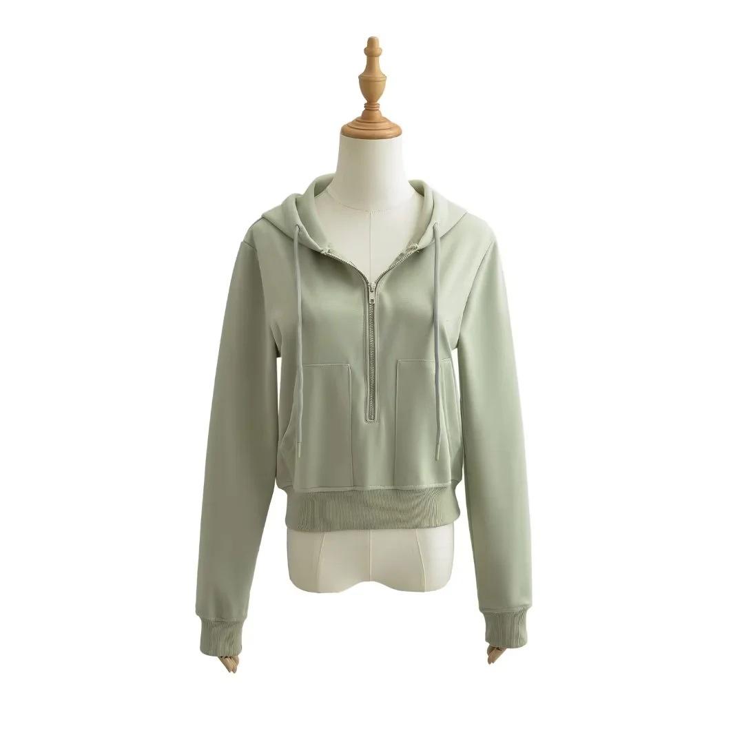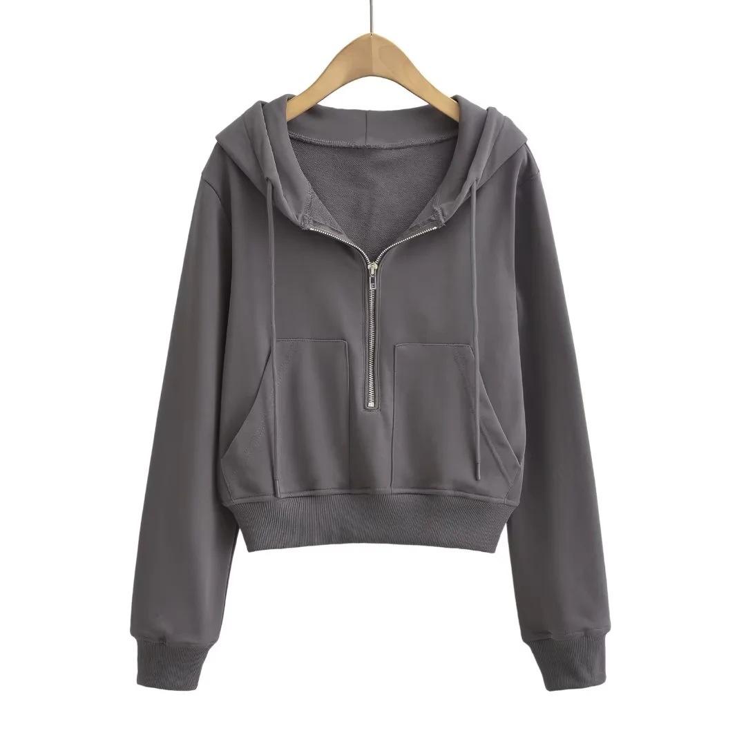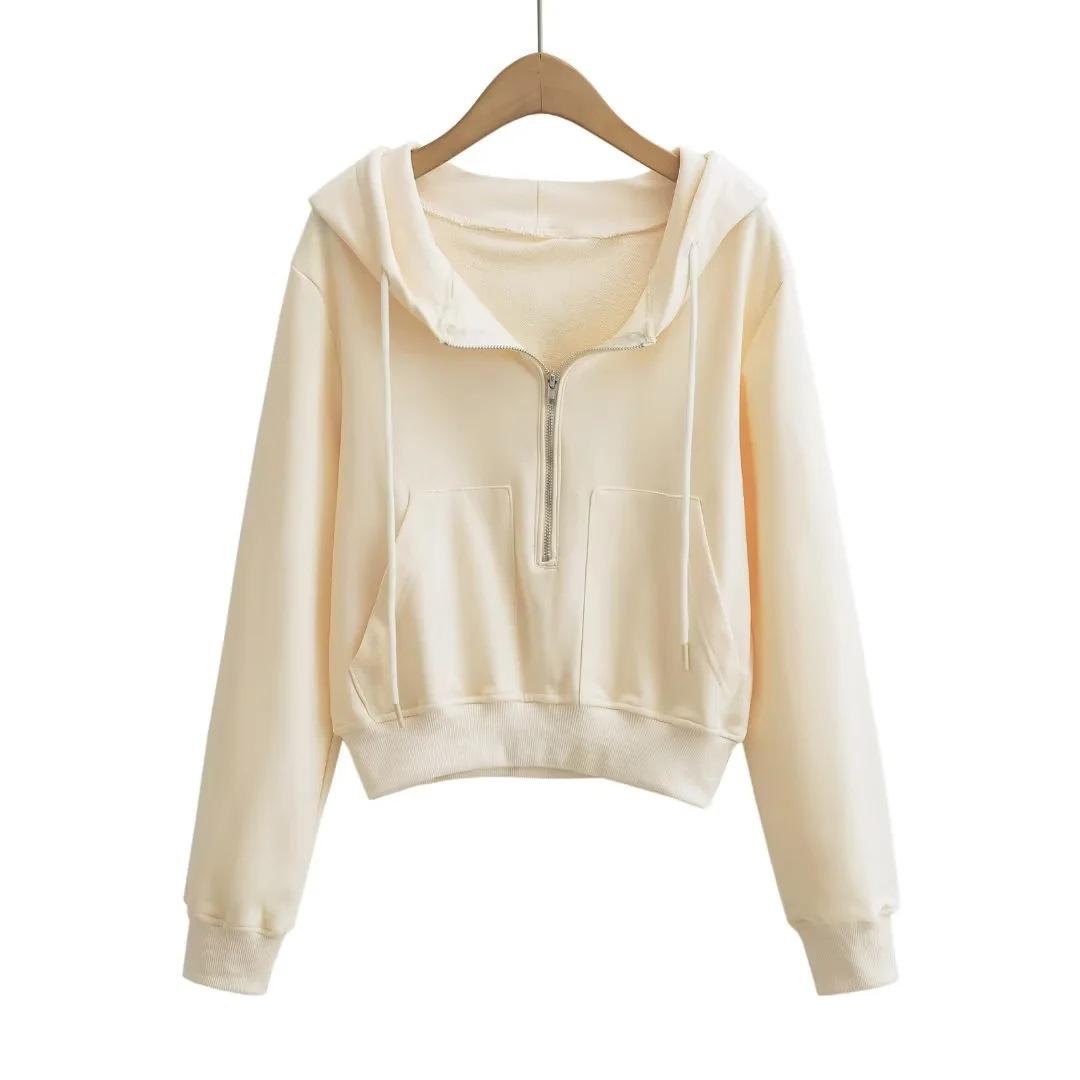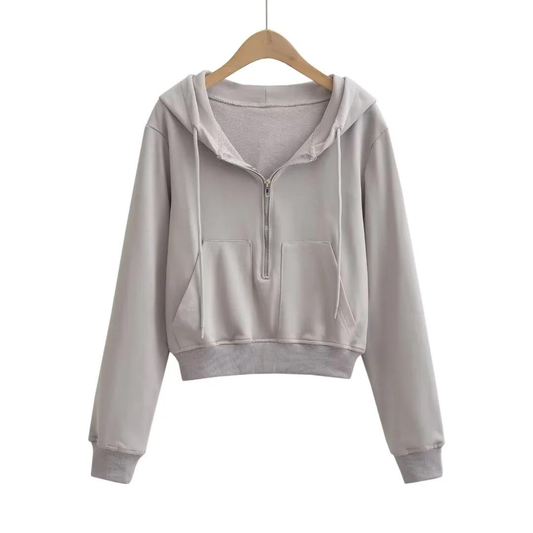 Suéter corto con media cremallera de estilo europeo y americano para mujer, otoño 2023, nuevo abrigo básico holgado con capucha, abrigo de moda para mujer