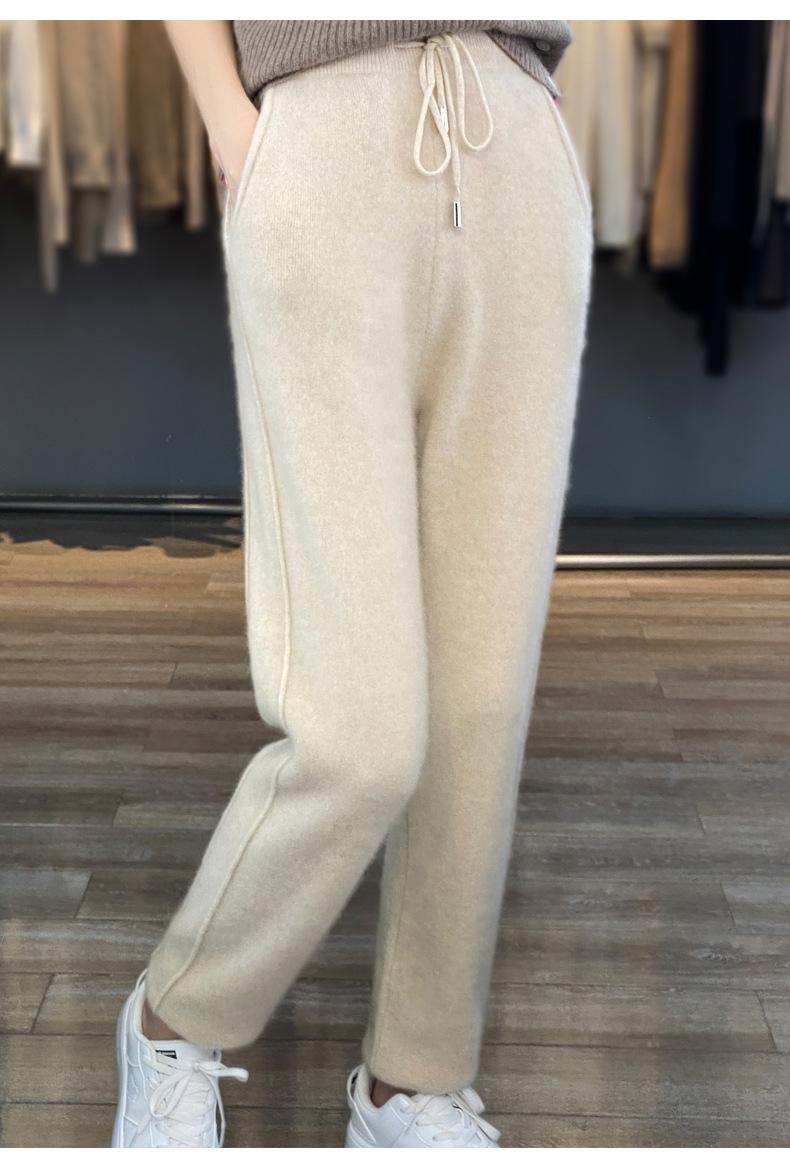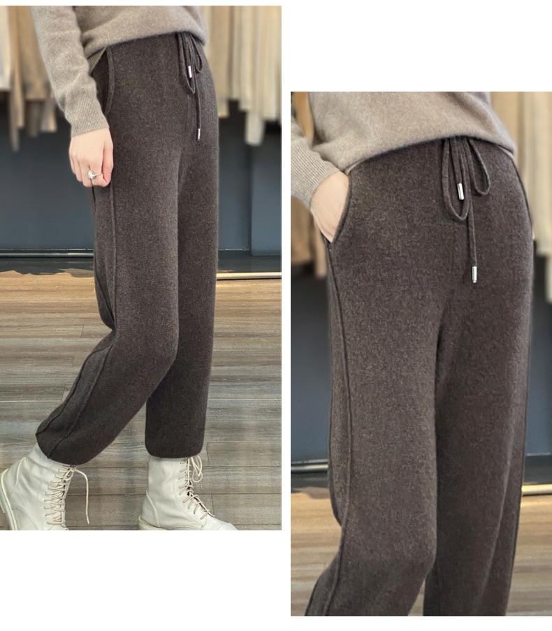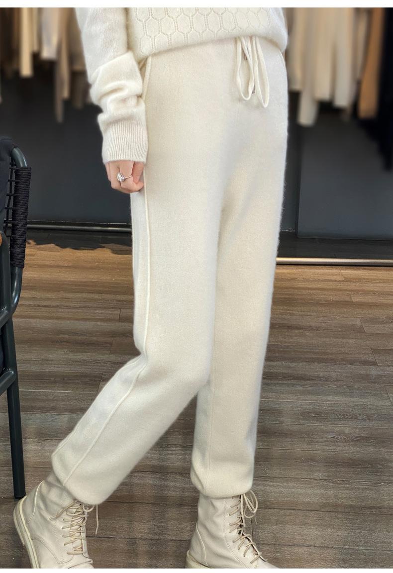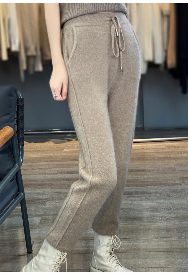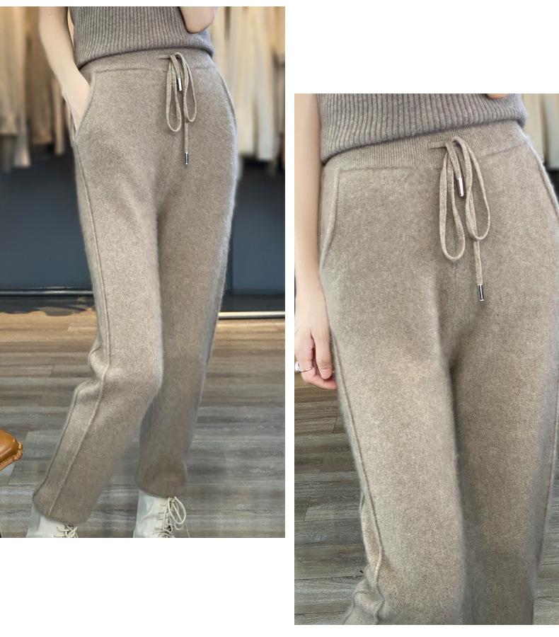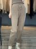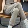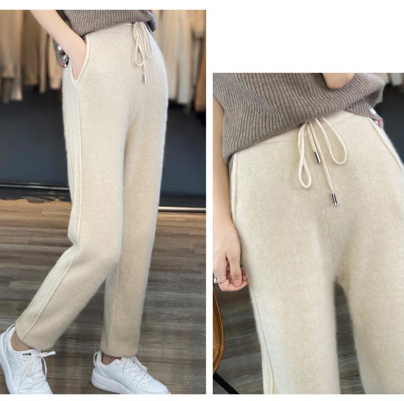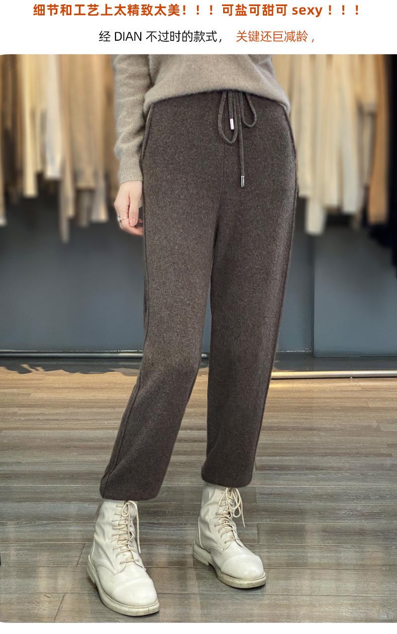 Pantalones ajustados de lana europeos y americanos para mujer, otoño e invierno 2023, nuevos pantalones de cachemira con cintura elástica y cordón de cintura alta en stock, engrosados