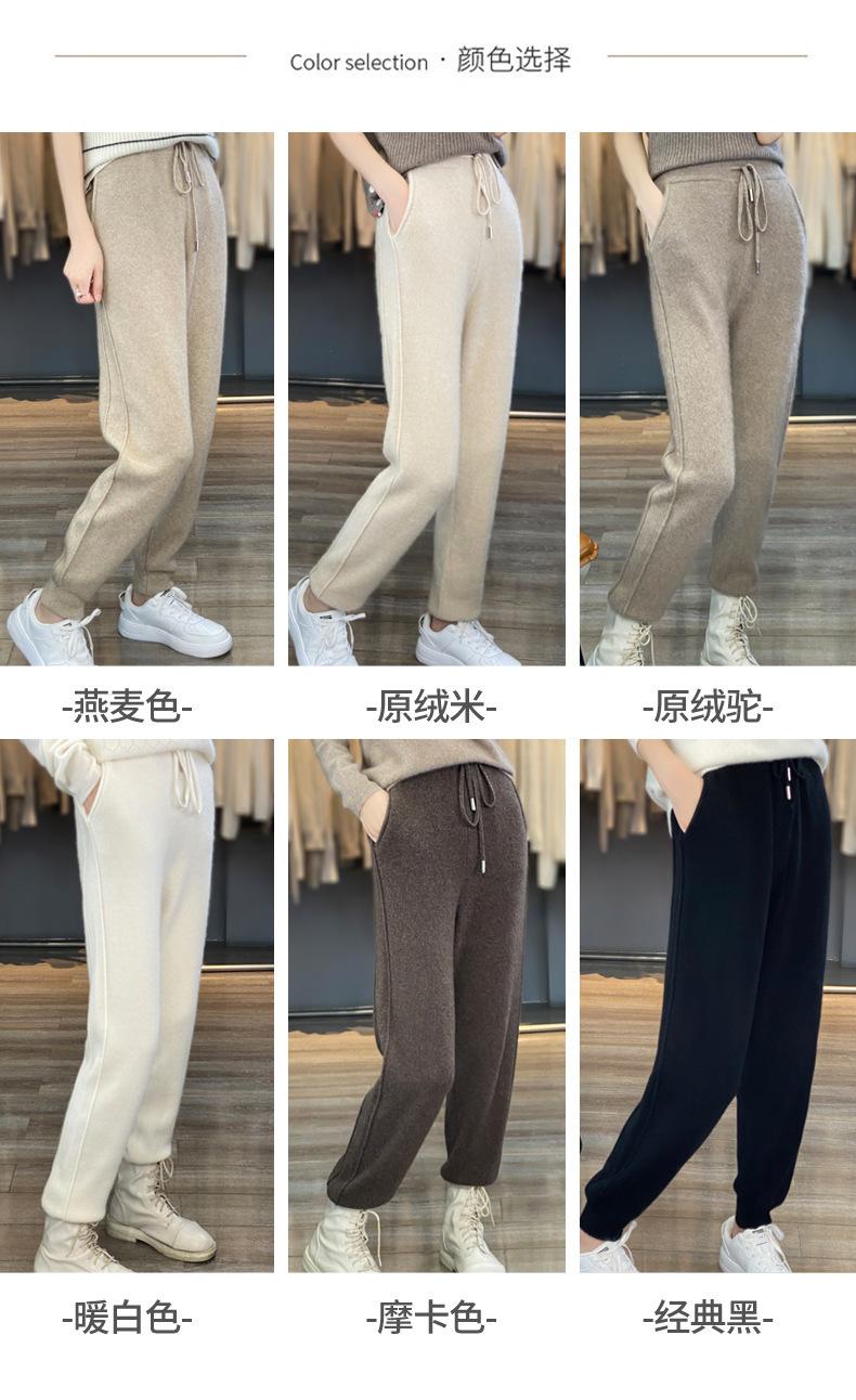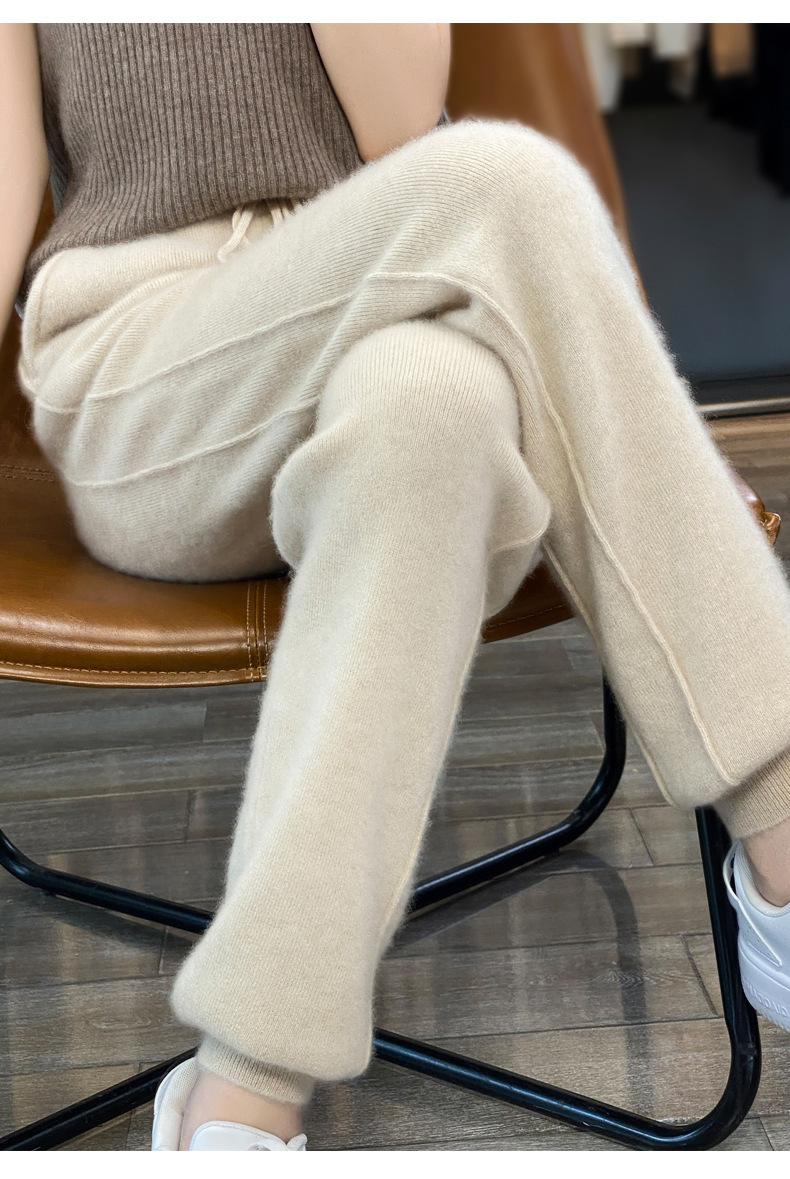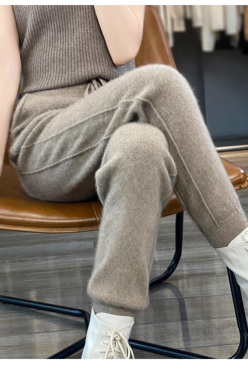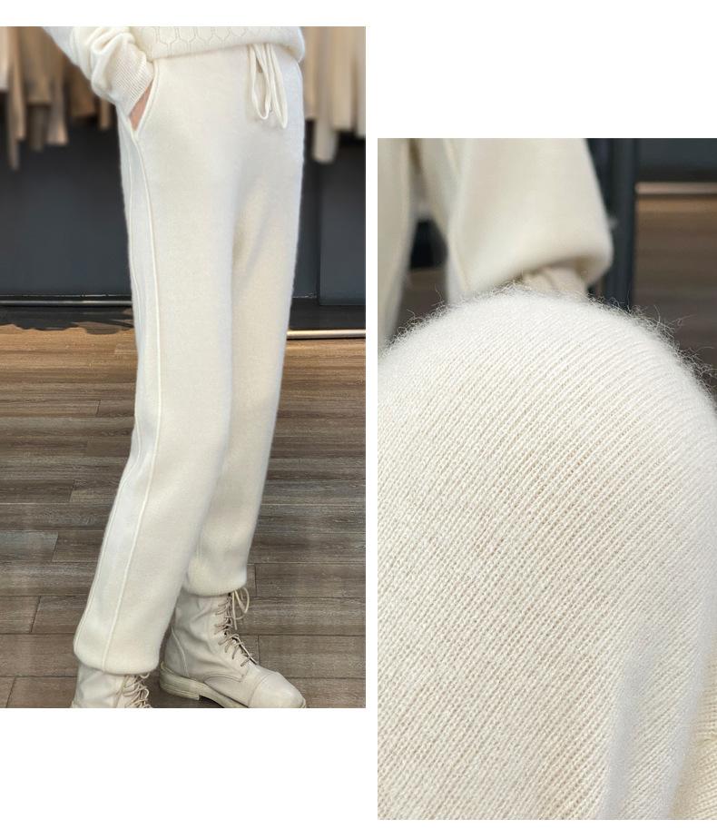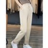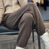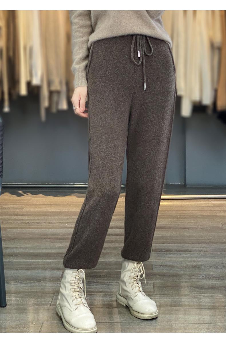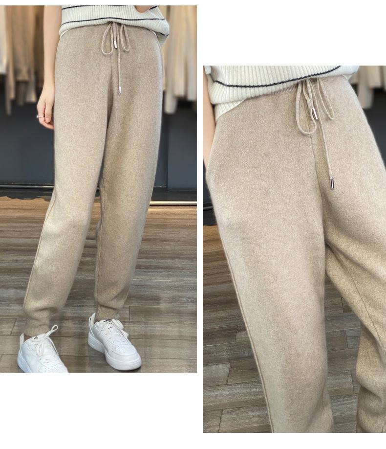 Pantalones ajustados de lana europeos y americanos para mujer, otoño e invierno 2023, nuevos pantalones de cachemira con cintura elástica y cordón de cintura alta en stock, engrosados