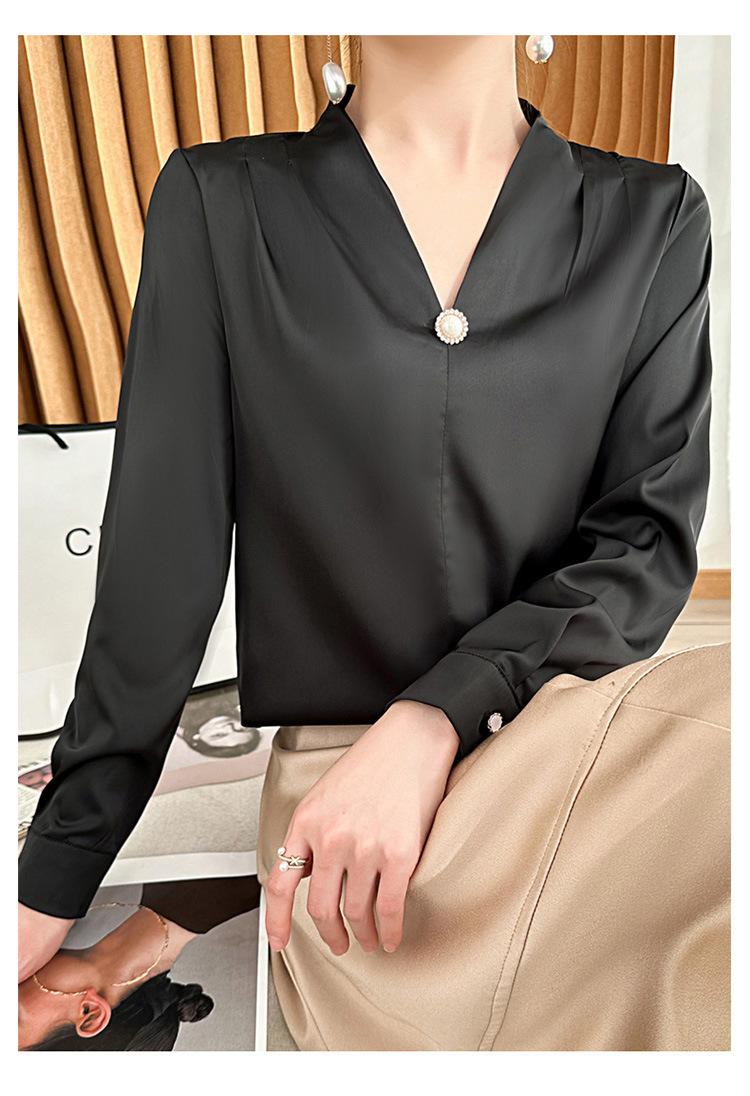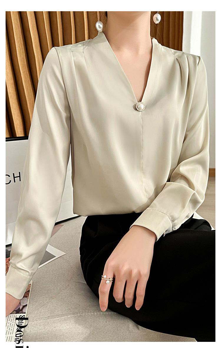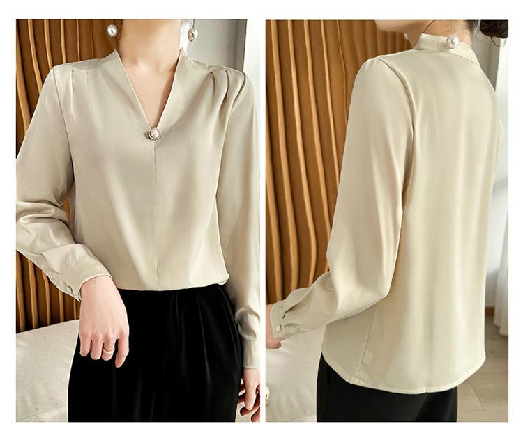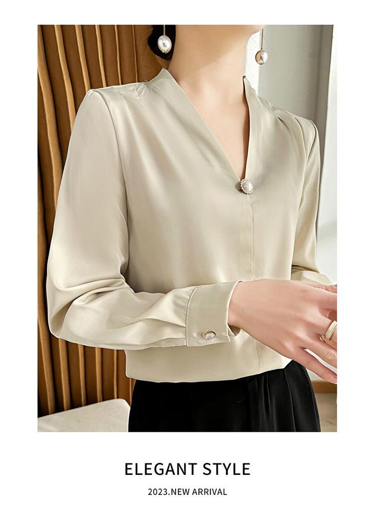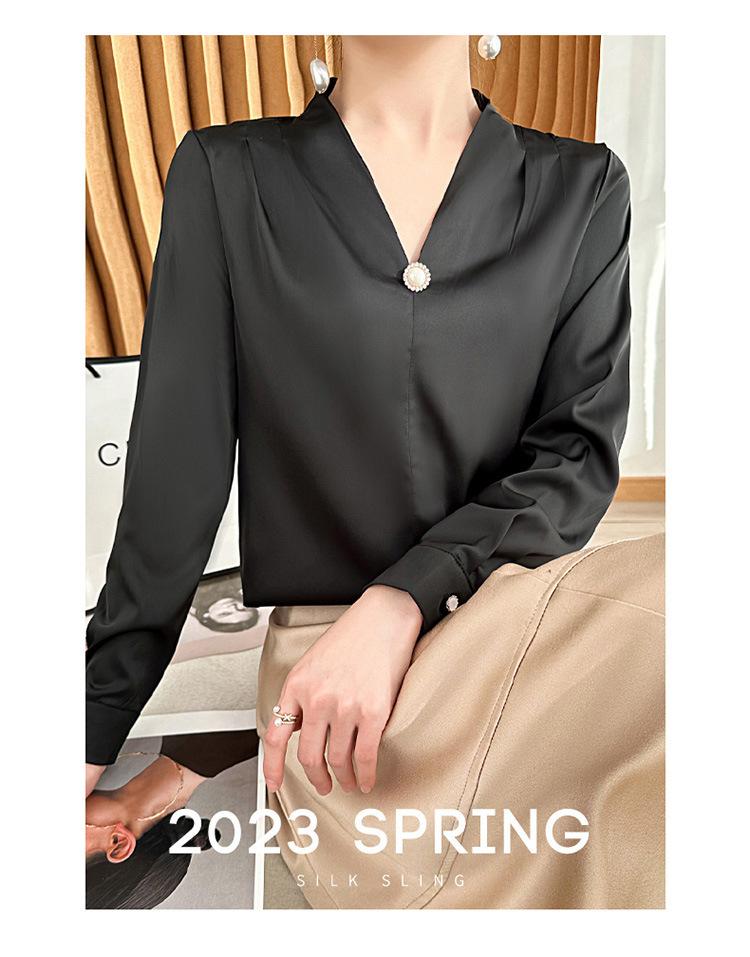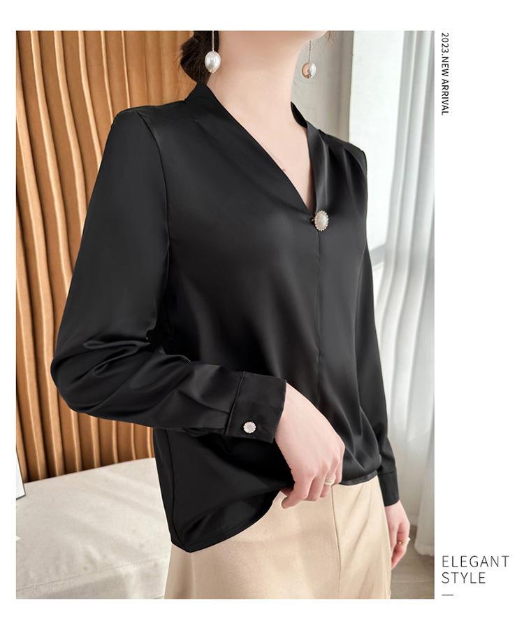 Camisa colgante de satén nueva de primavera y otoño 2023 para mujer, sencilla, delgada, cuello en V, un solo botón, camisa de moda por lote