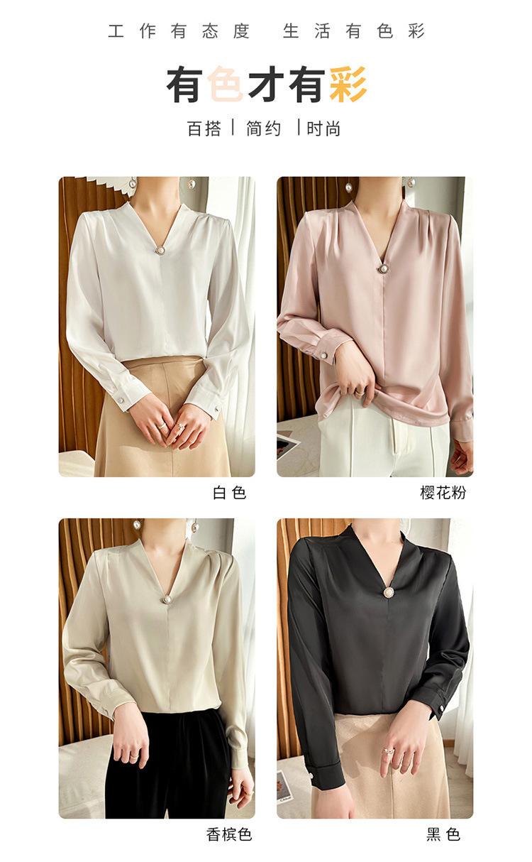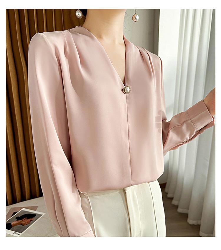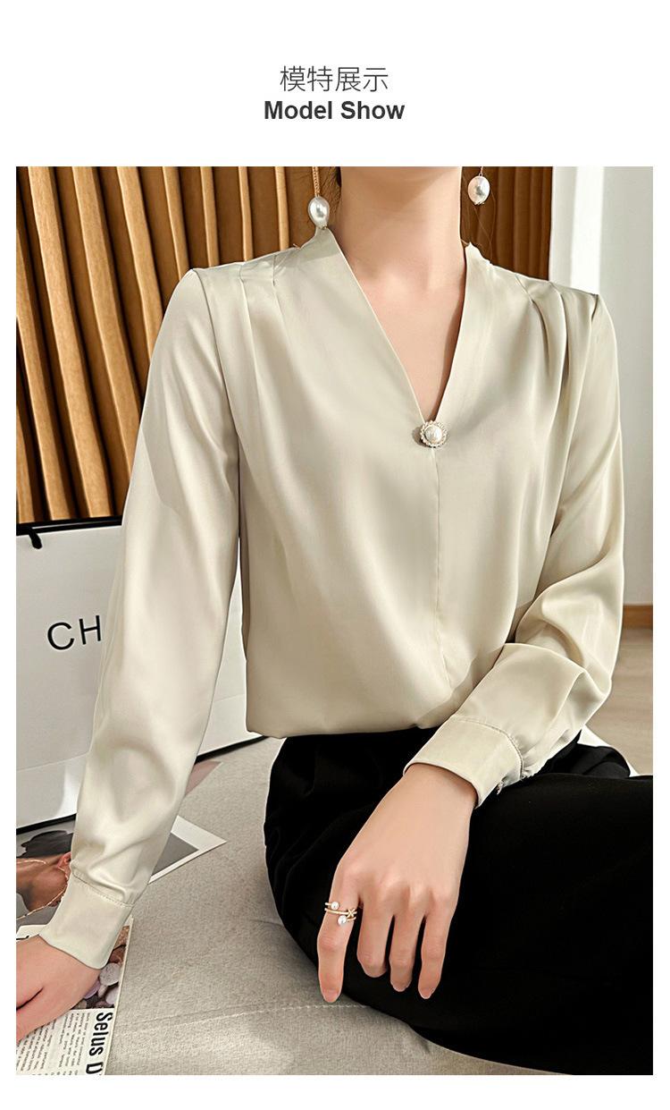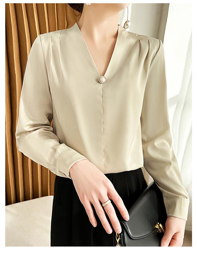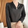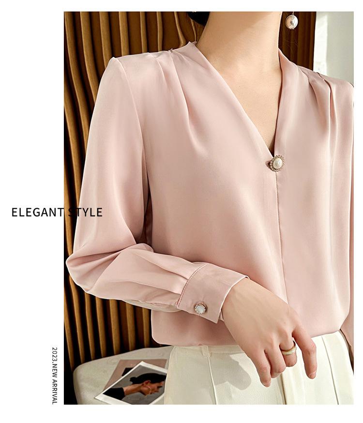 Camisa colgante de satén nueva de primavera y otoño 2023 para mujer, sencilla, delgada, cuello en V, un solo botón, camisa de moda por lote