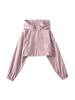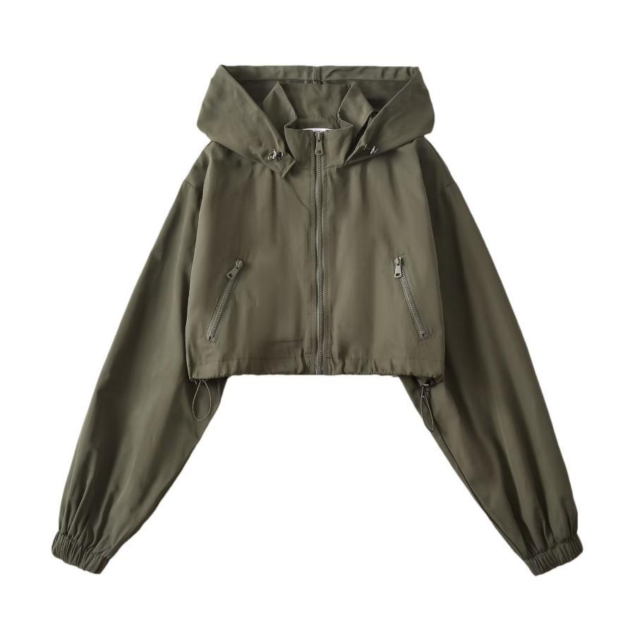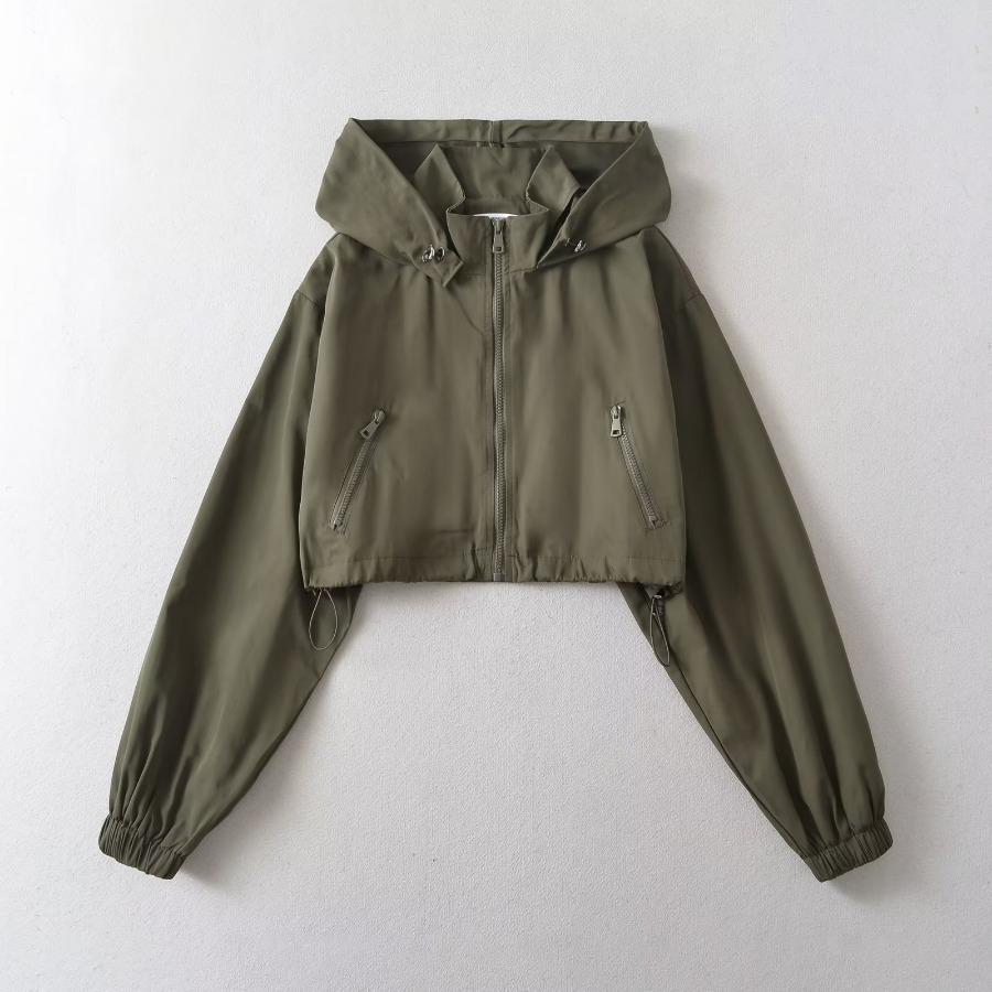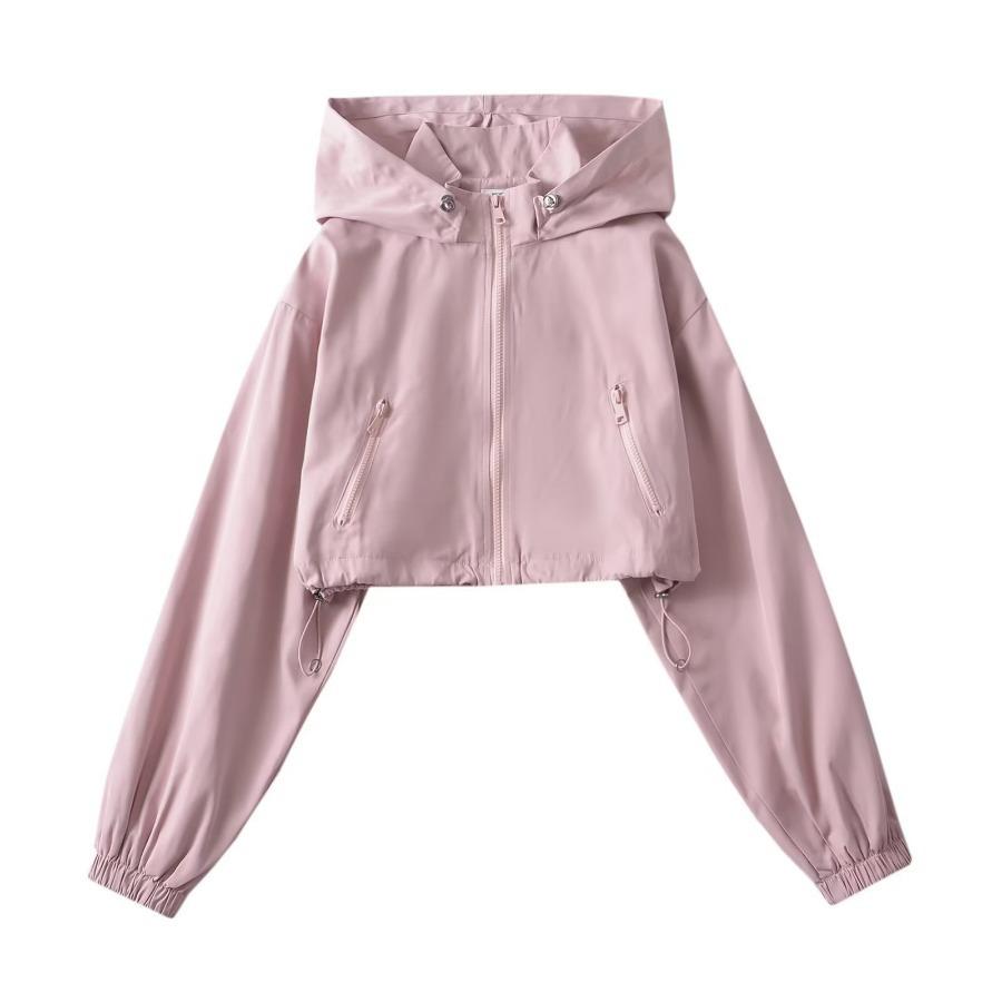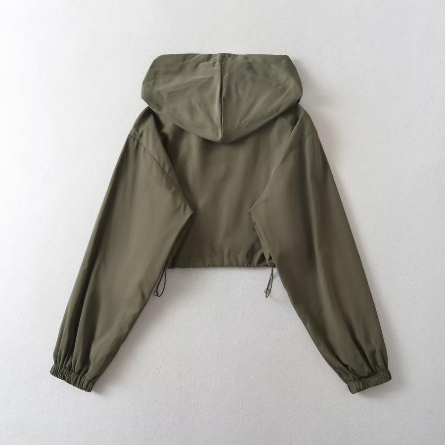 Chaqueta informal estilo americano dulce y fresco para mujer, con capucha, cremallera, holgada, de manga corta y larga