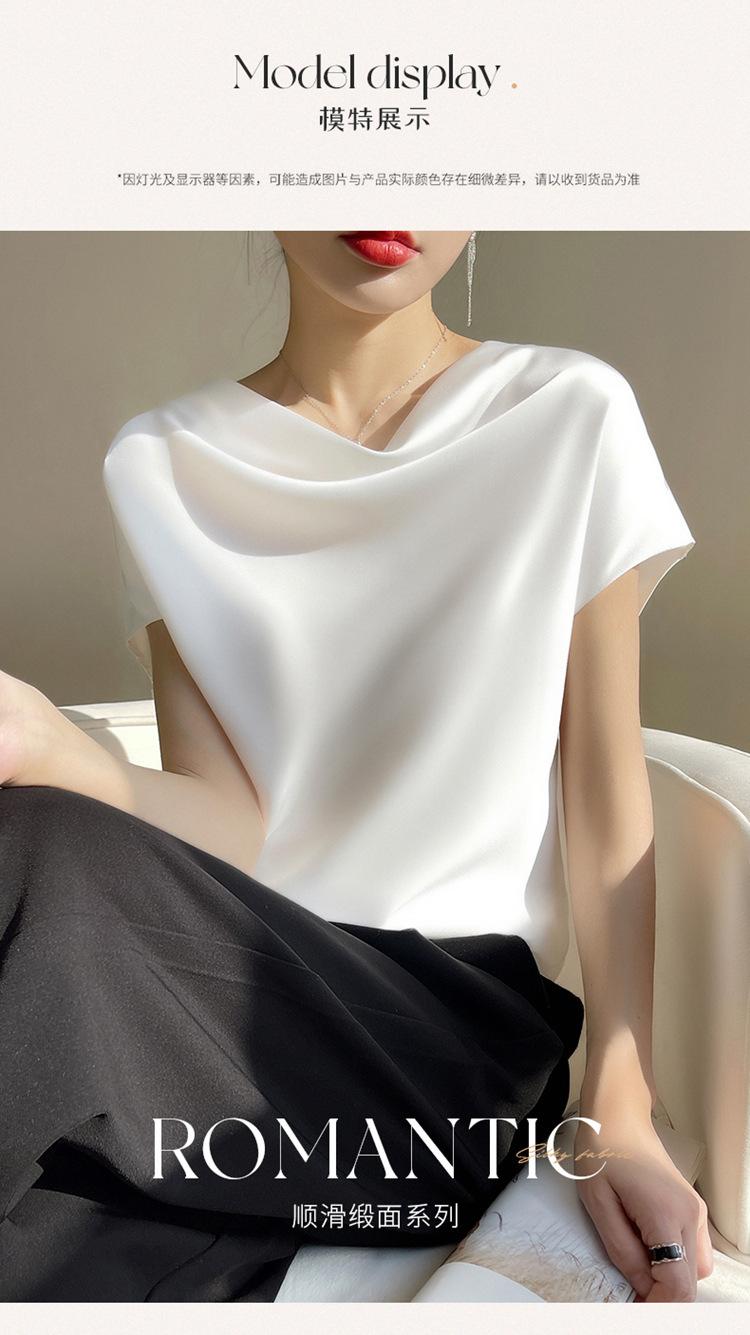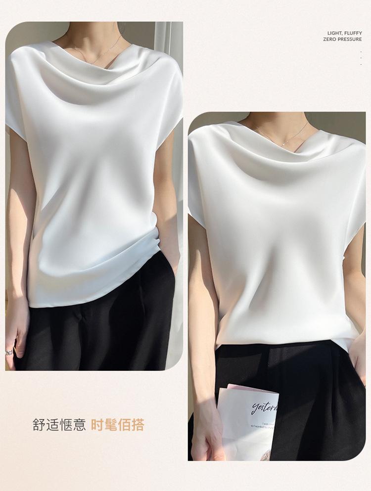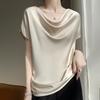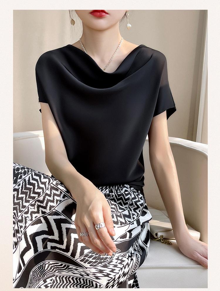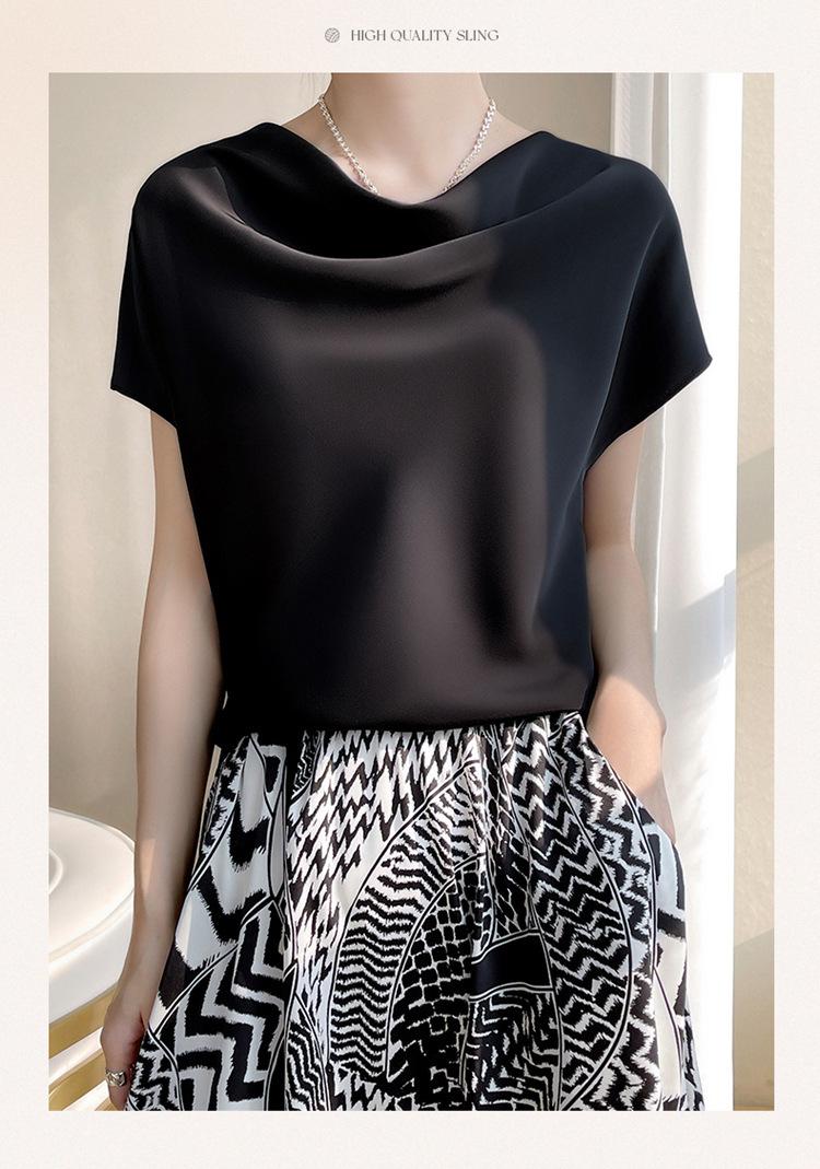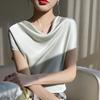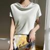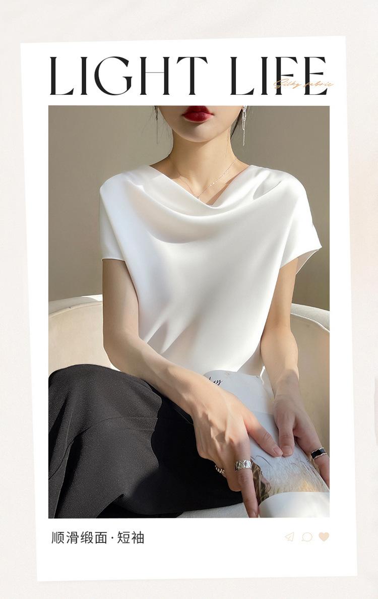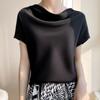 2025 Primavera y Verano Nueva Moda Camiseta de Manga Corta con Cuello Alto para Mujer, Moderna, de Satén, Ajustada, Elegante, Versátil
