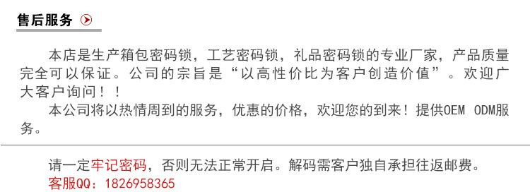 El servicio personalizado está disponible para más de 1000 piezas de un solo color.Cuerpo de candado a color personalizado en ambos ladosSerigrafía disponible. Empaque de doble blíster disponible. Empaque de bolsa OPP con inserto de tarjeta disponible.Por favor contacte al dueño para detallesGerente Lu Tel: 158-621-70687