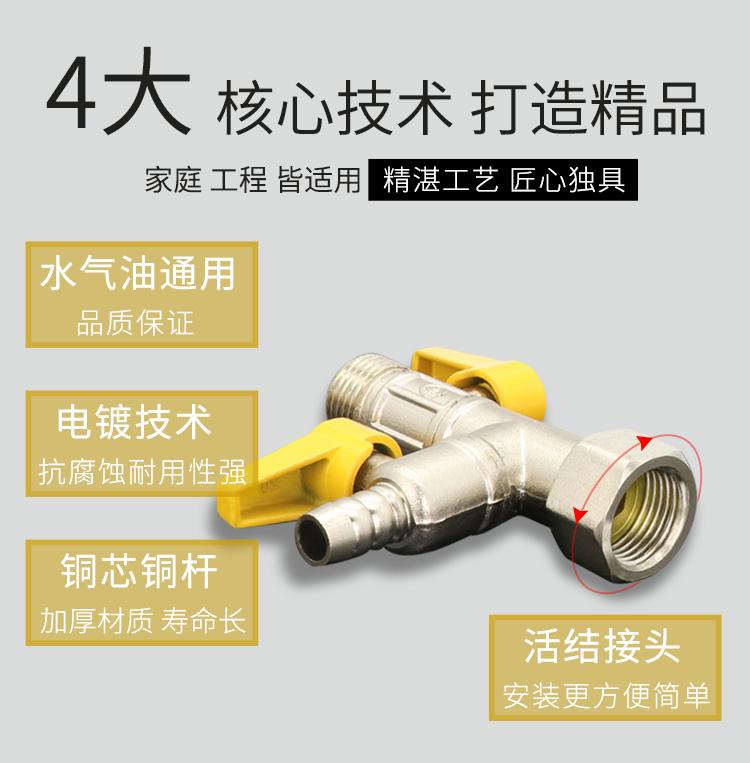 Venta al por mayor de válvula de gas natural engrosada de cobre, tubería de gas, interruptor de válvula de bola de calentador de agua de tres vías, uno de entrada y dos de salida