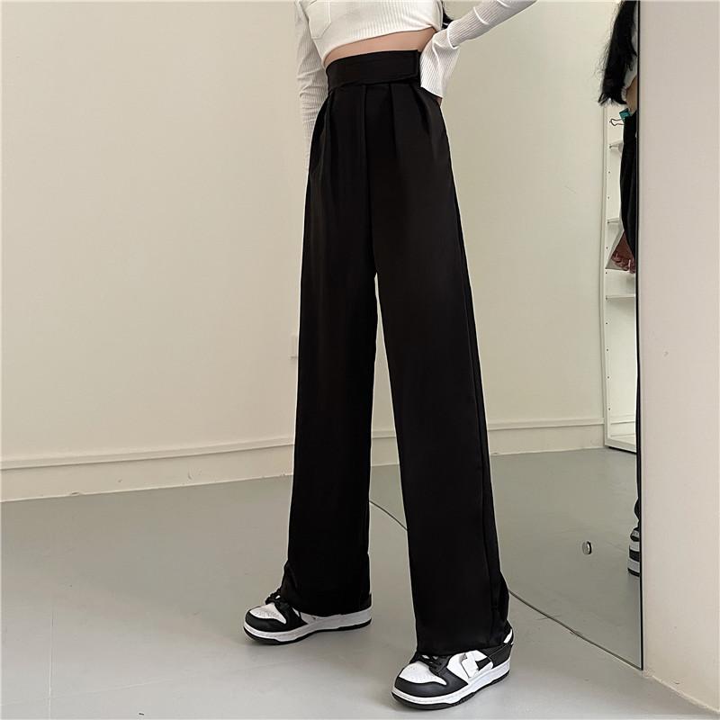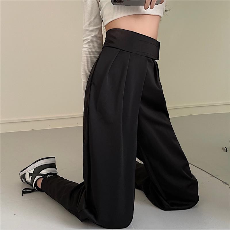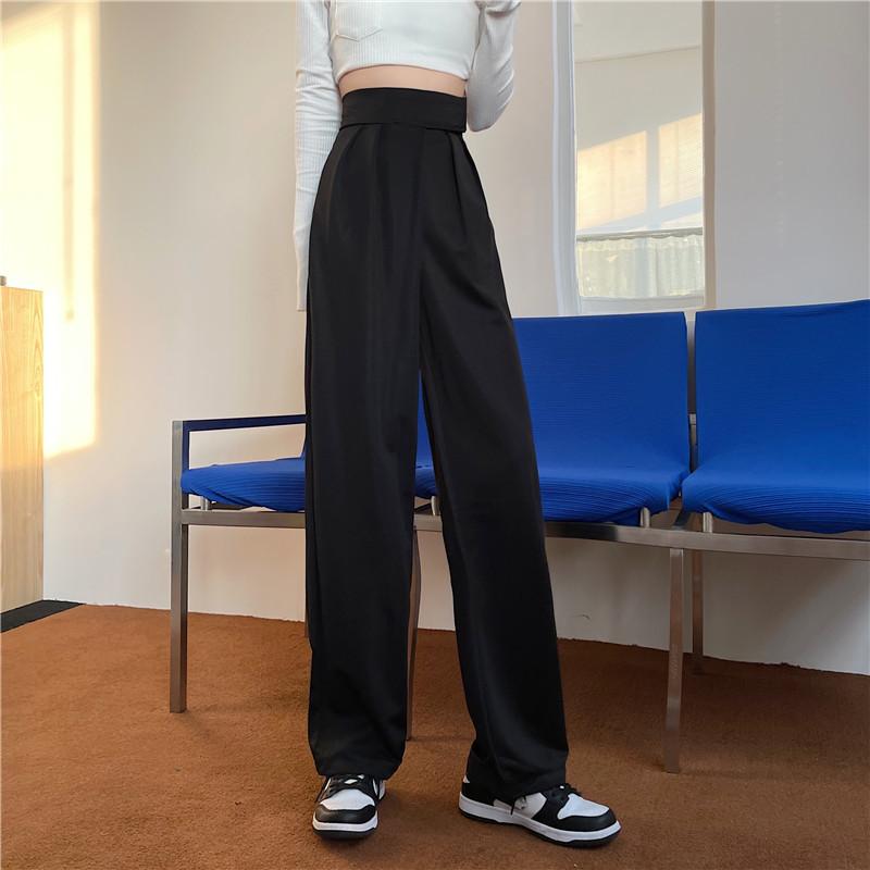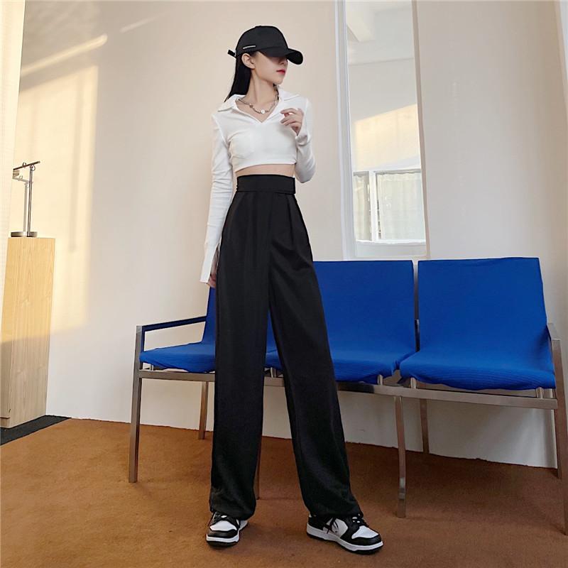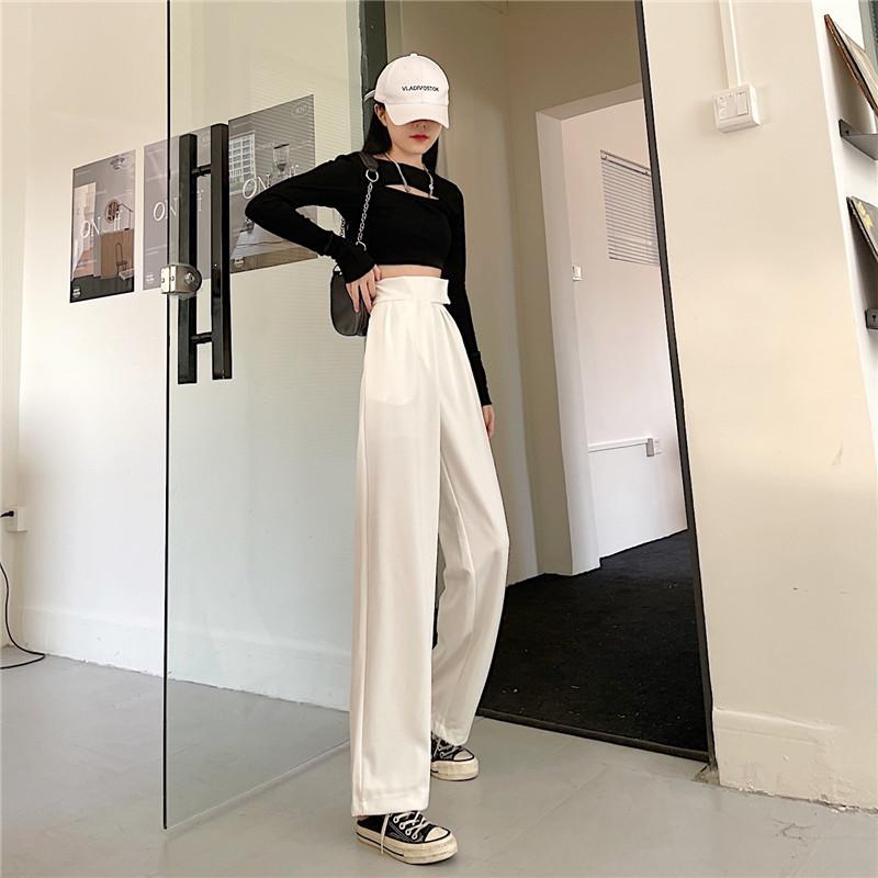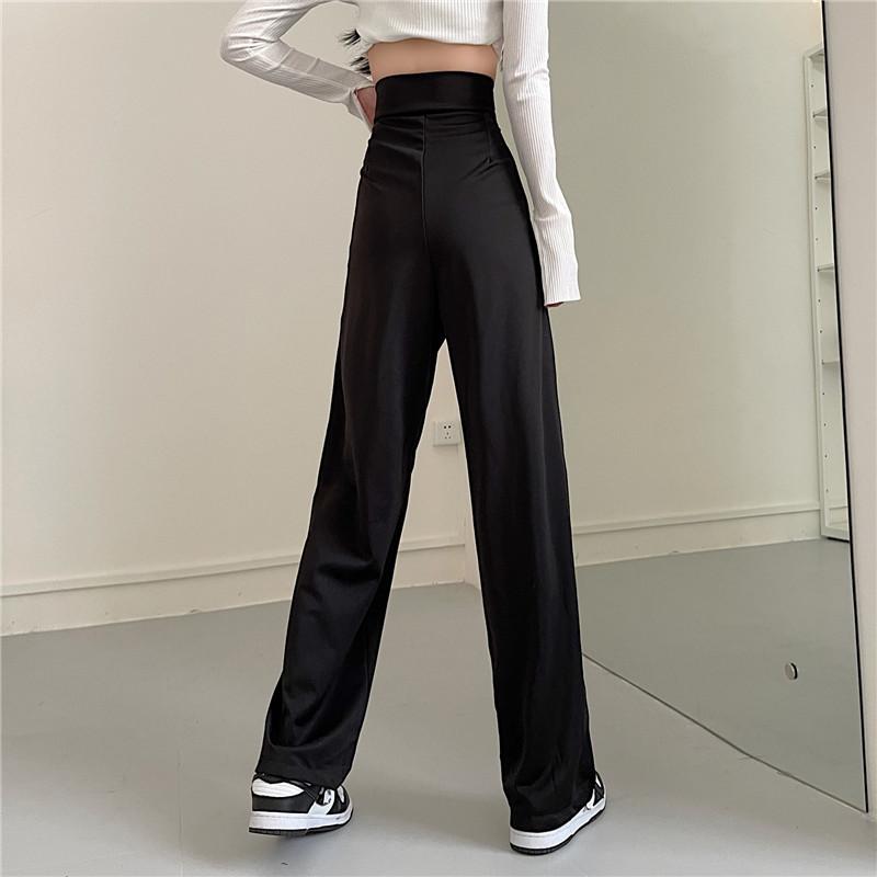 Pantalones de Velcro Estilo High Street para Mujer Cintura Alta Diseño Blanco Sentido Recto Tubo Suelto Seda Helada Pierna Ancha