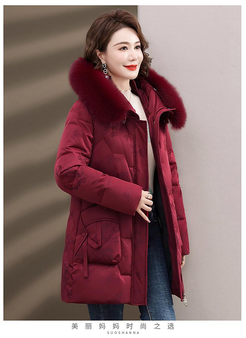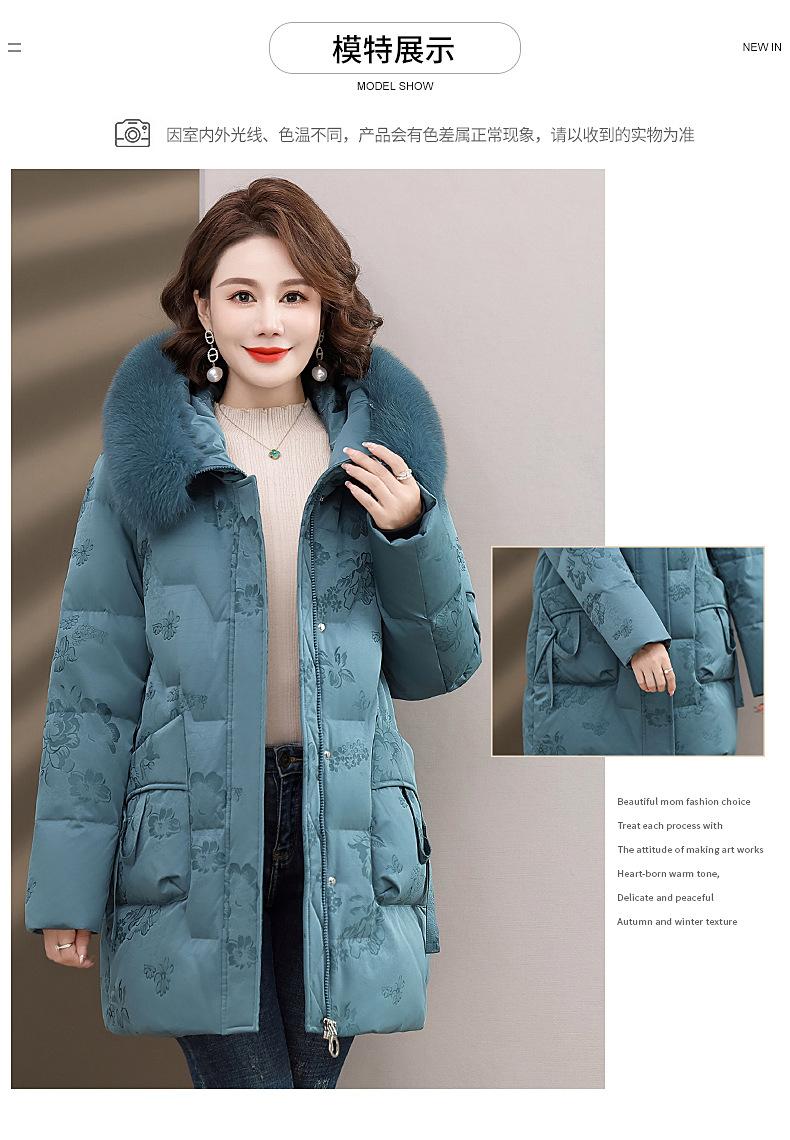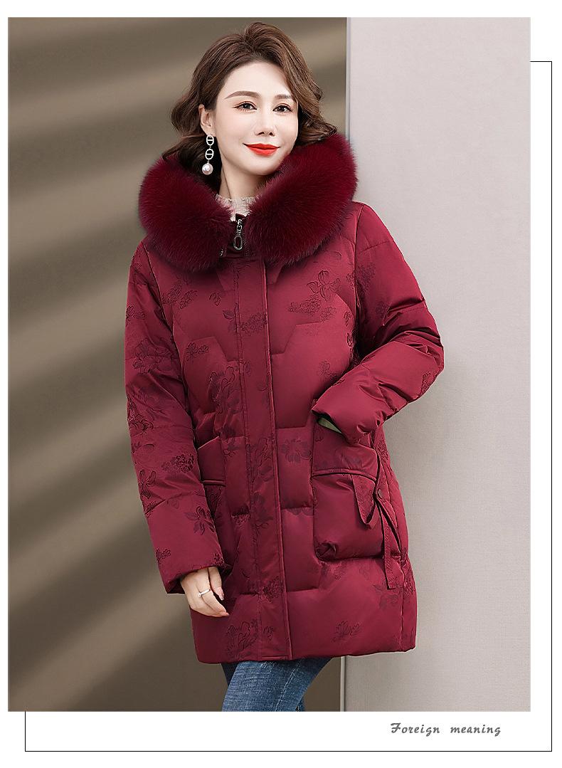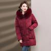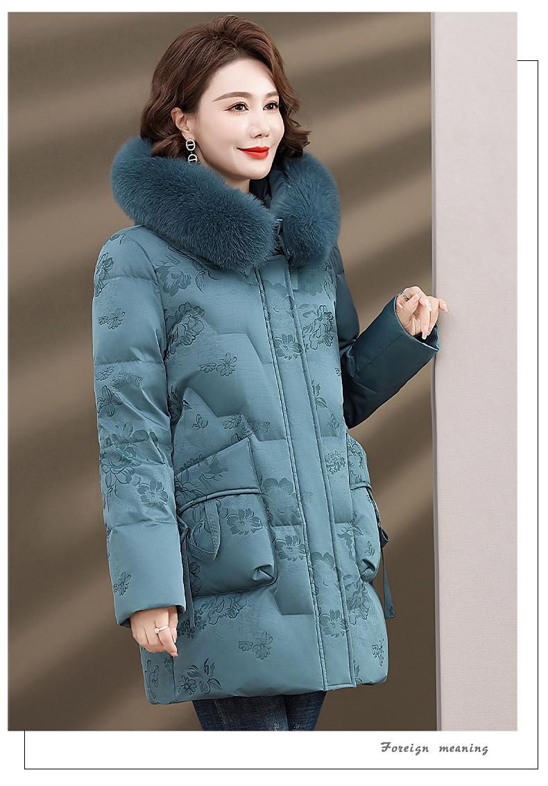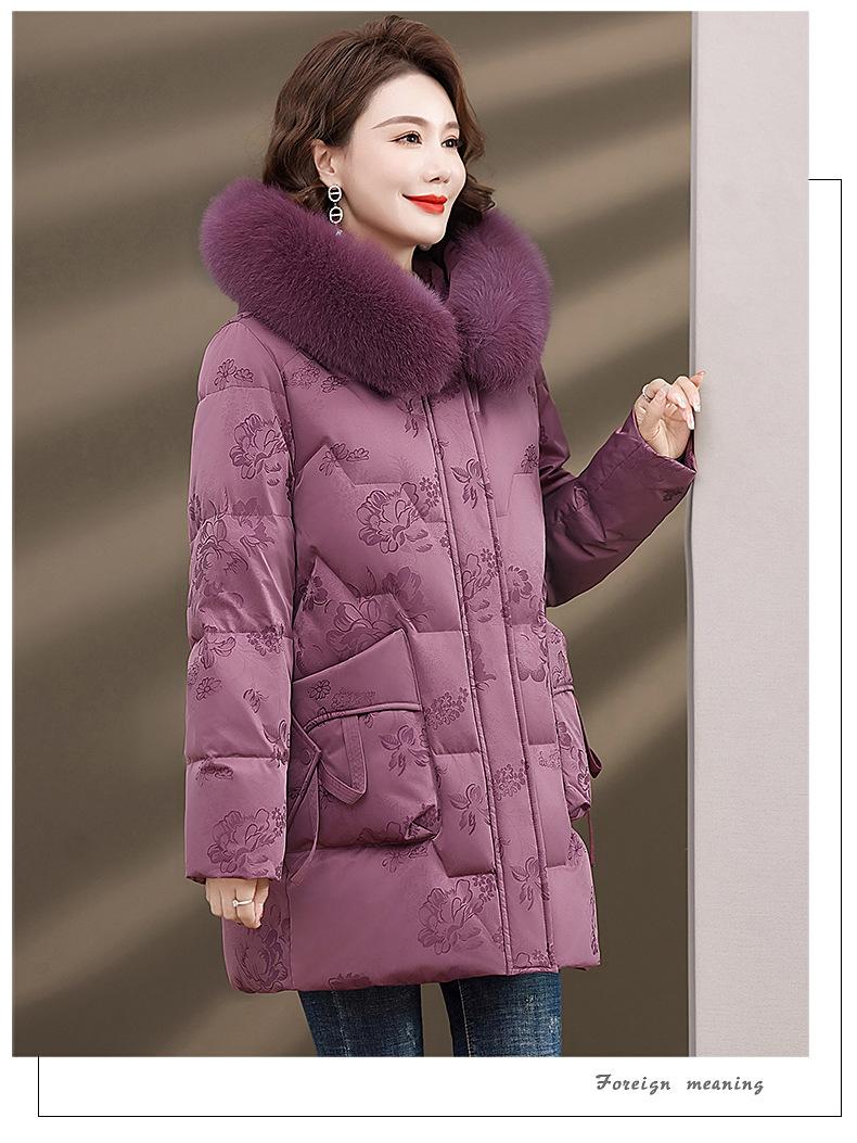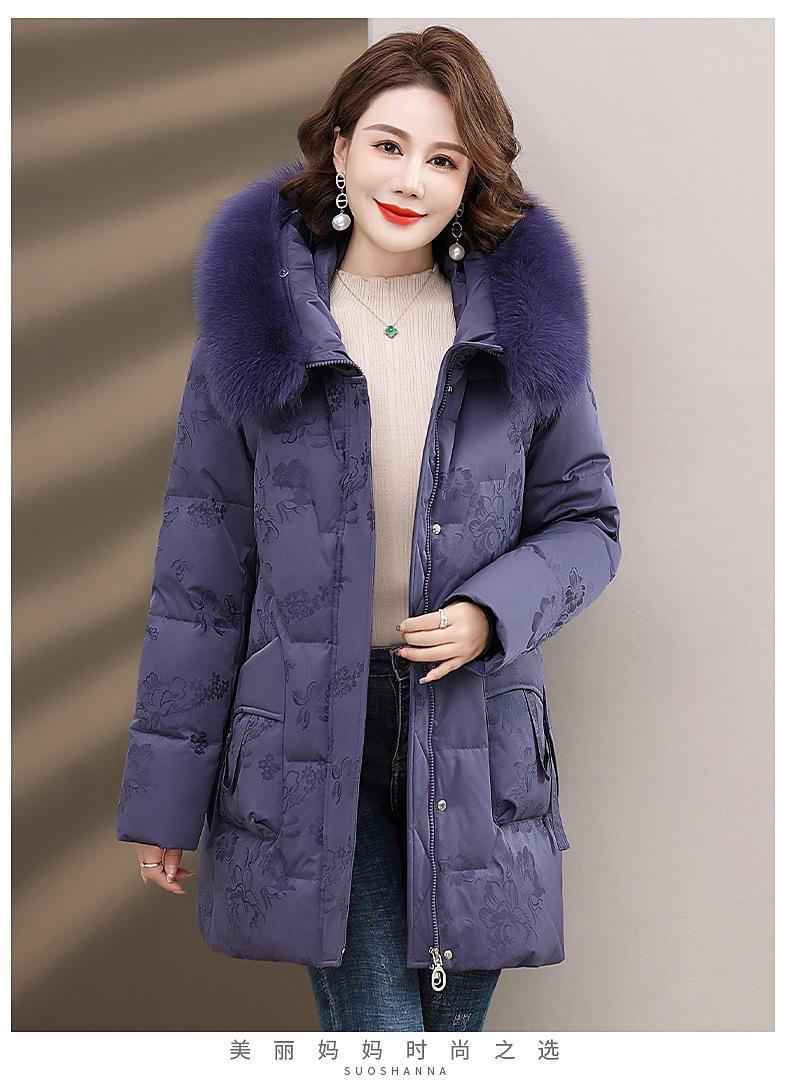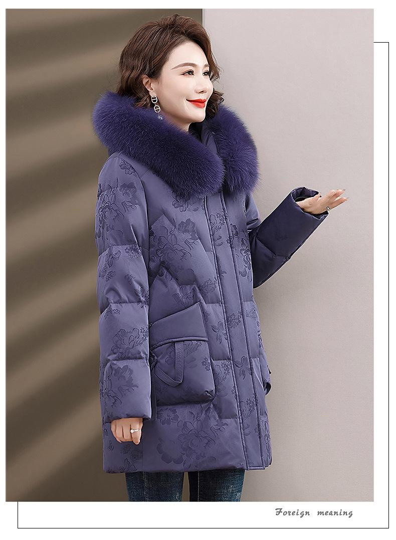 Chaqueta de plumón esponjosa mediana-larga de invierno para madre Cuello de piel de zorro real Cortavientos estilo occidental Ropa para mujeres de mediana edad y ancianas Plumón de pato blanco