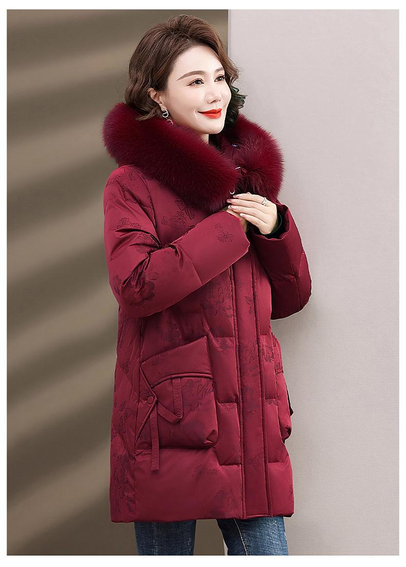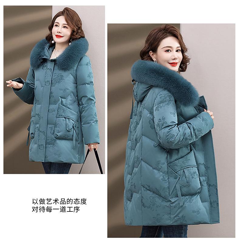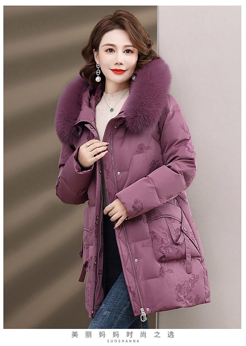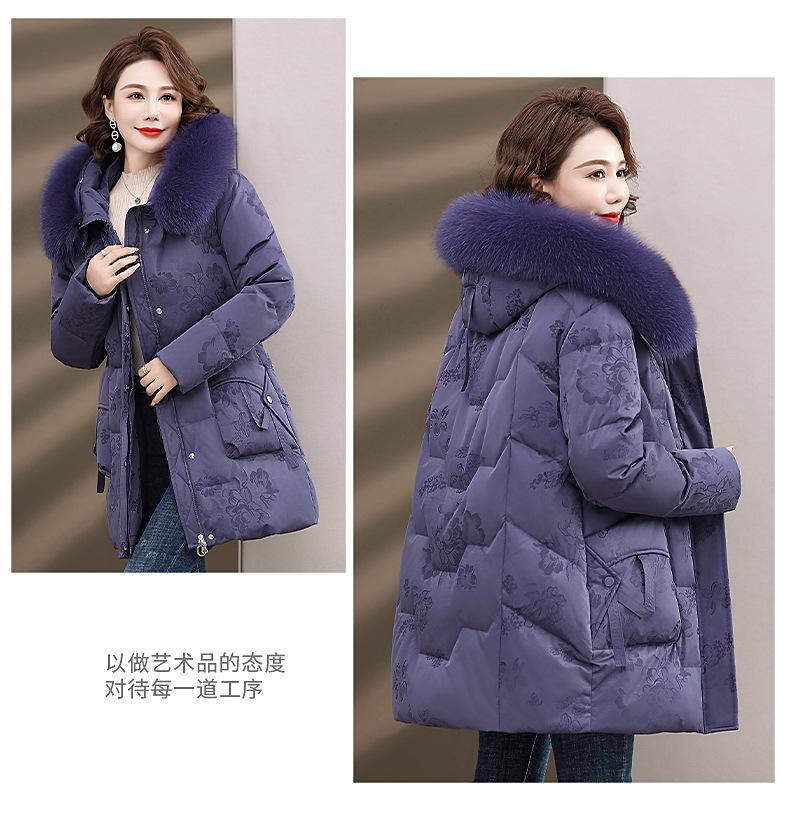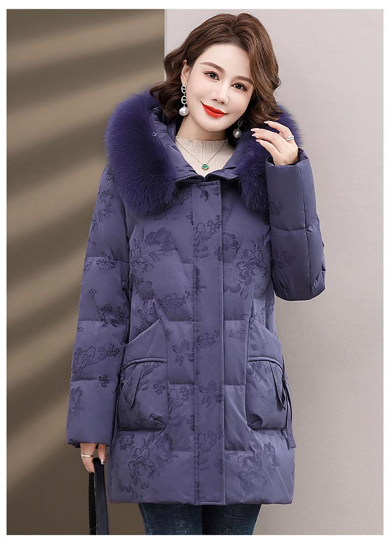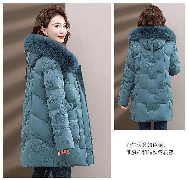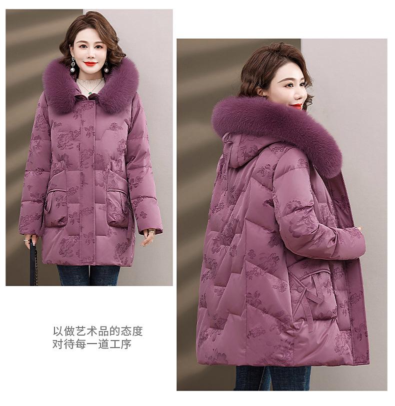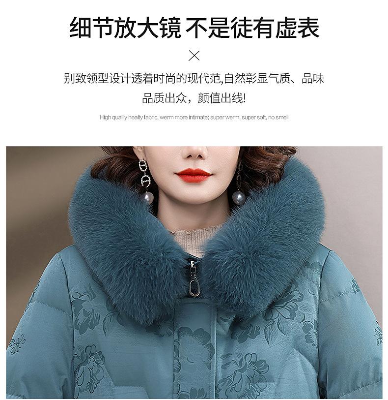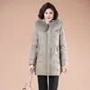 Chaqueta de plumón esponjosa mediana-larga de invierno para madre Cuello de piel de zorro real Cortavientos estilo occidental Ropa para mujeres de mediana edad y ancianas Plumón de pato blanco