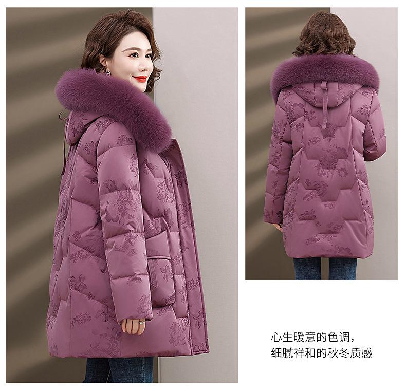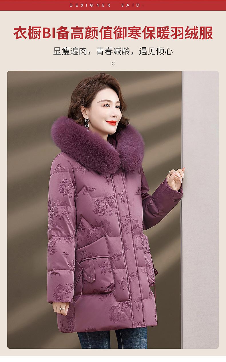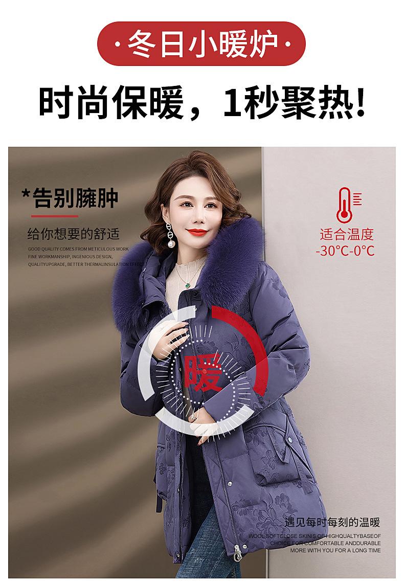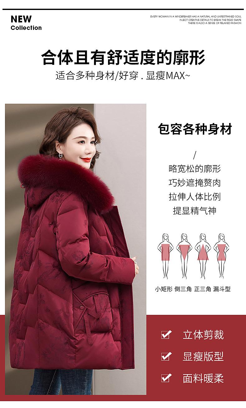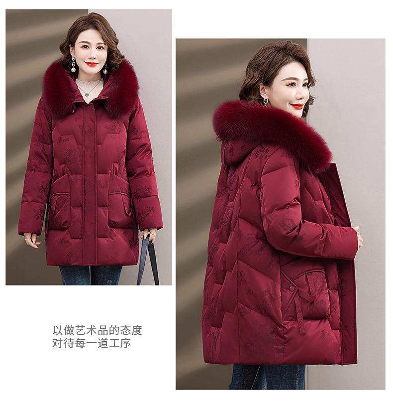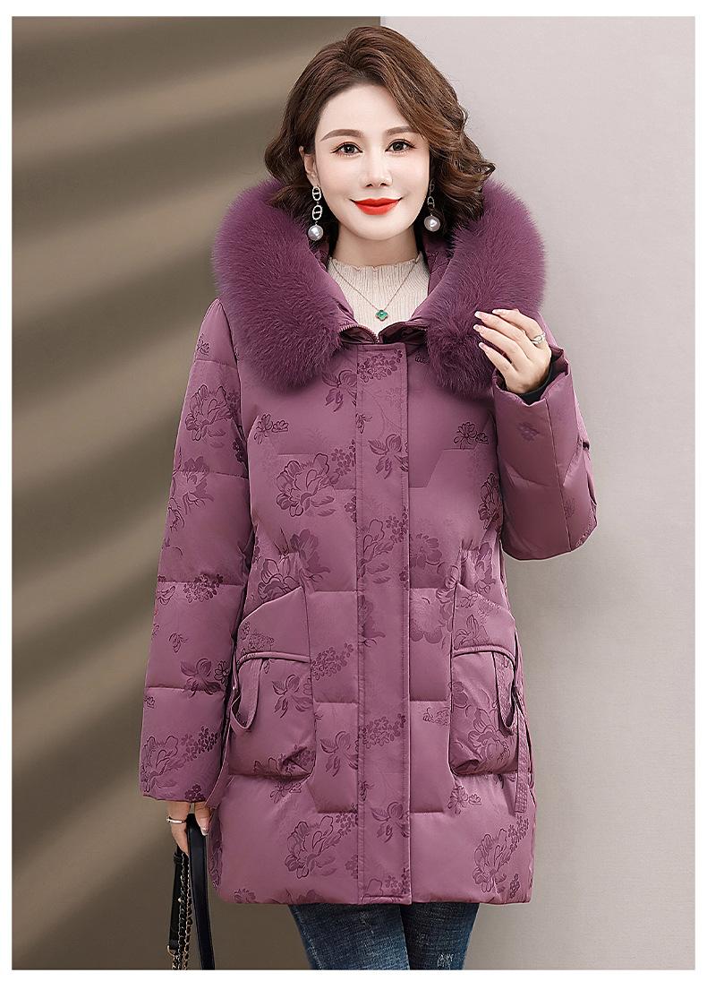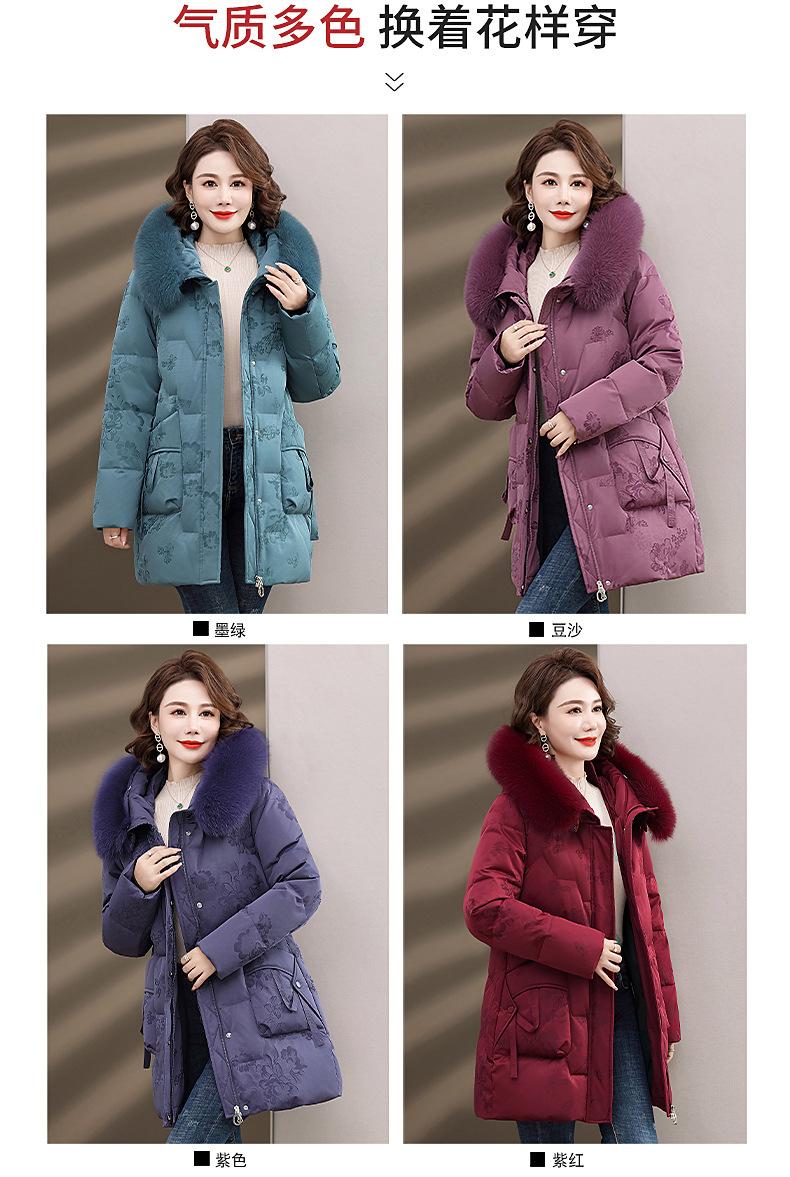 Chaqueta de plumón esponjosa mediana-larga de invierno para madre Cuello de piel de zorro real Cortavientos estilo occidental Ropa para mujeres de mediana edad y ancianas Plumón de pato blanco