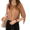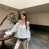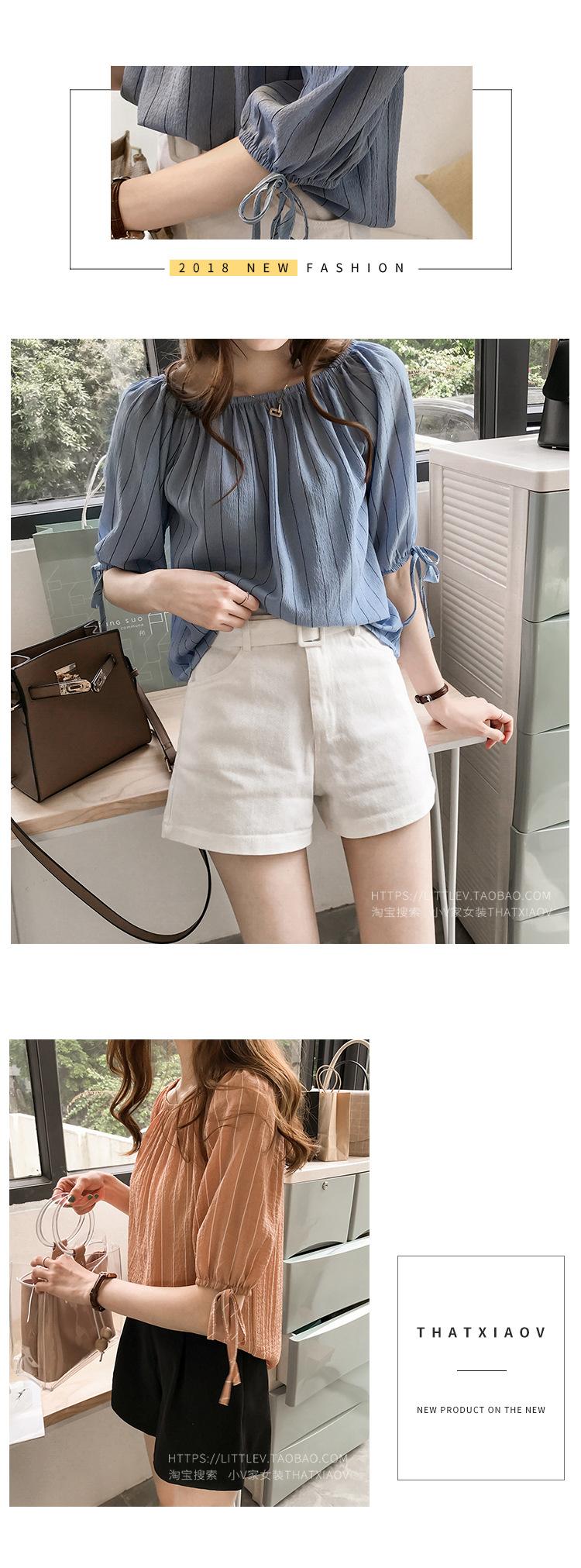 2 023 Verano Nuevo Temperamento Cuello de Un Carácter Camisa de Gasa a Rayas con Hombros Descubiertos Camisa de Base Superior de Mangas de Linterna Sueltas para Mujer de Moda