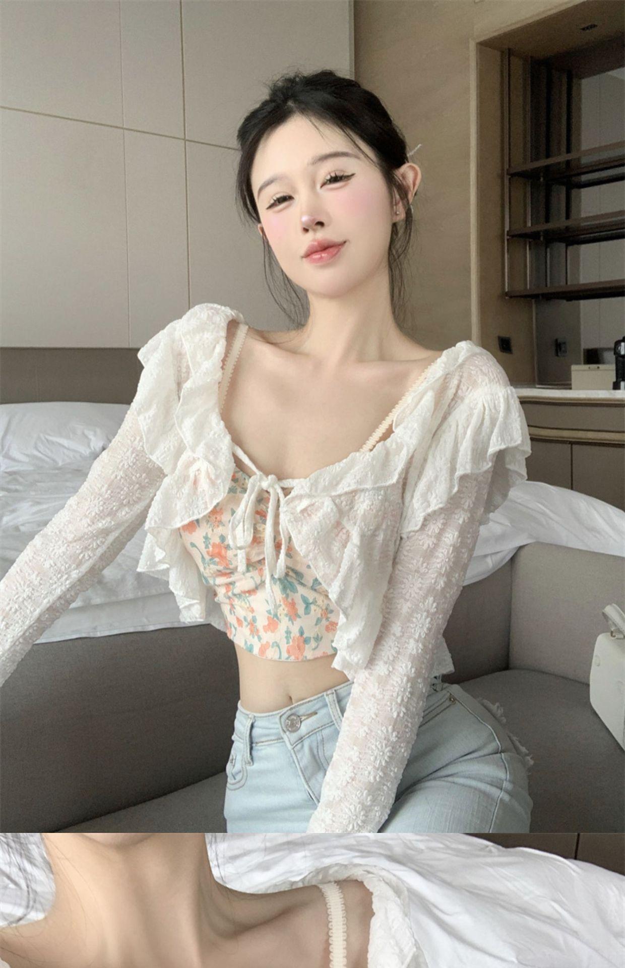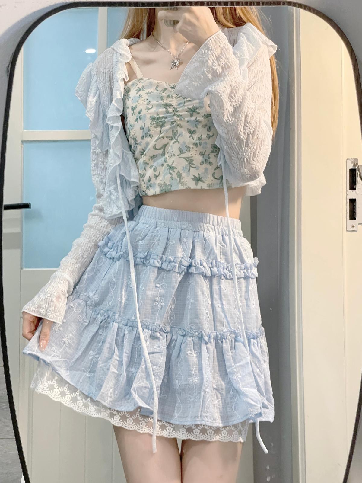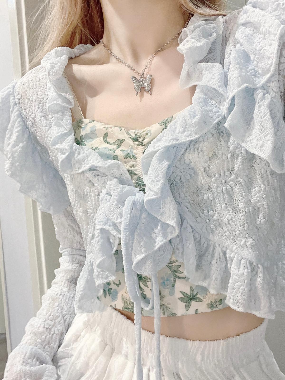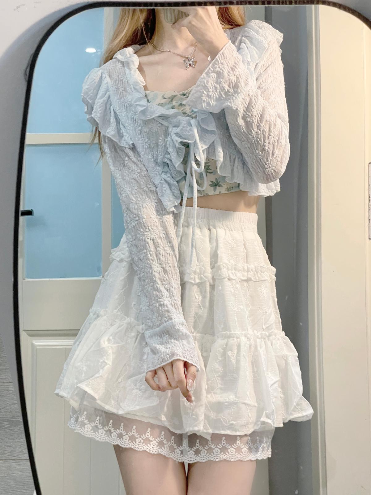 Cárdigan protector solar, blusa fina tipo chal, cárdigan corto de encaje con mangas abullonadas para mujer, conjunto de verano, falda con tirantes para mujer