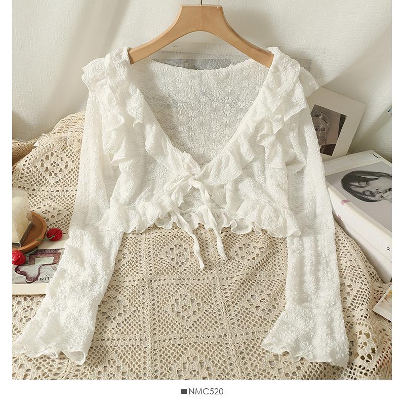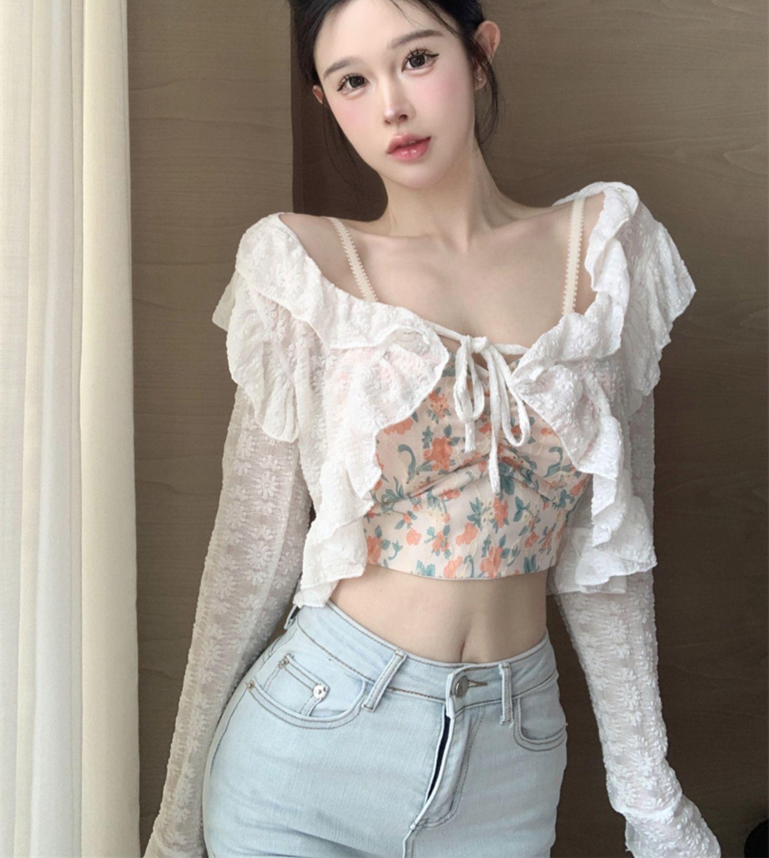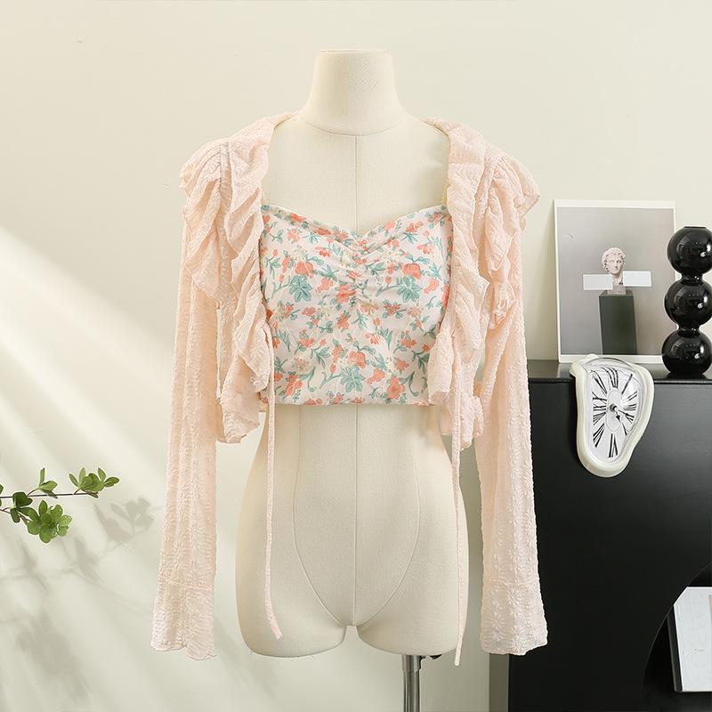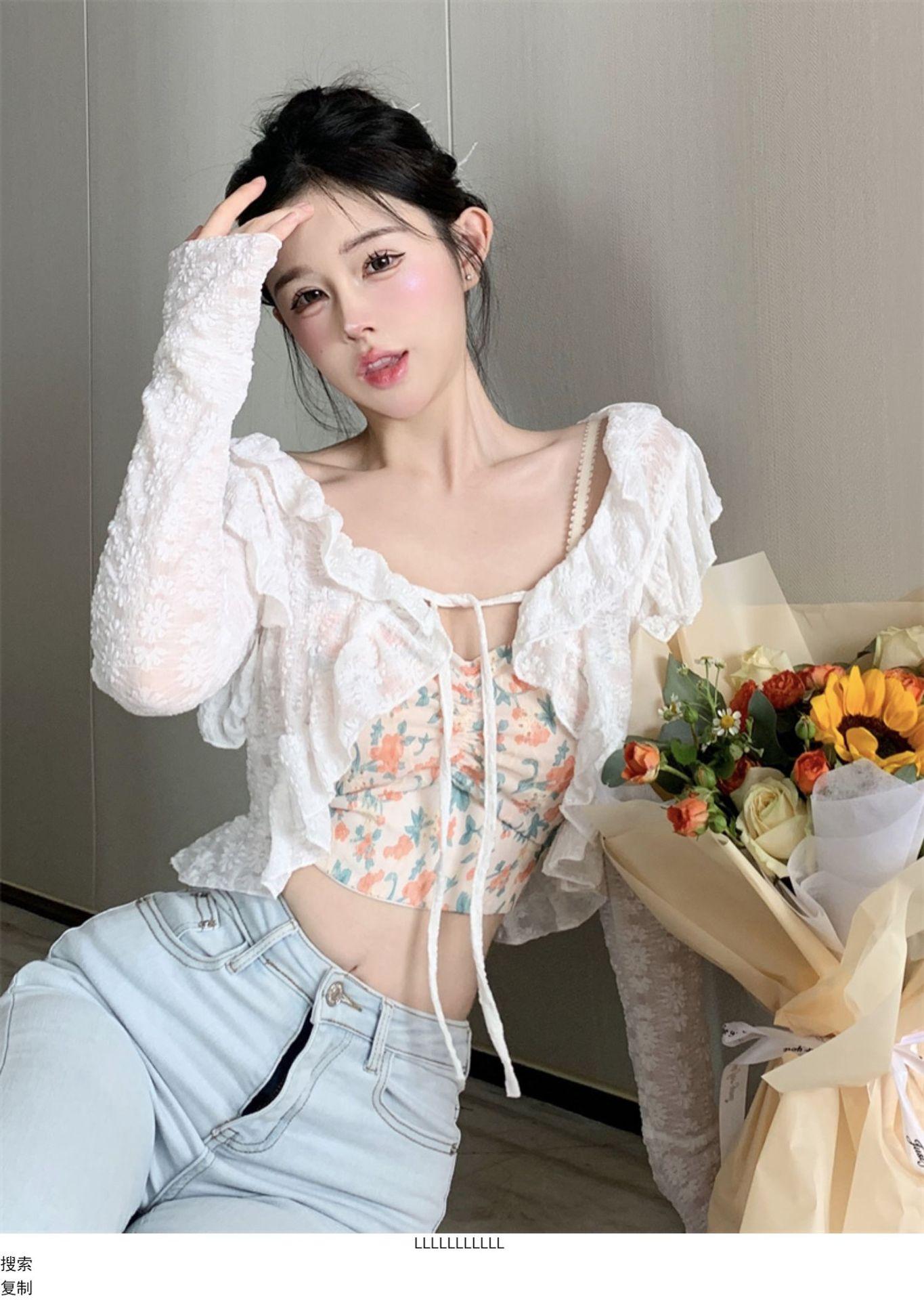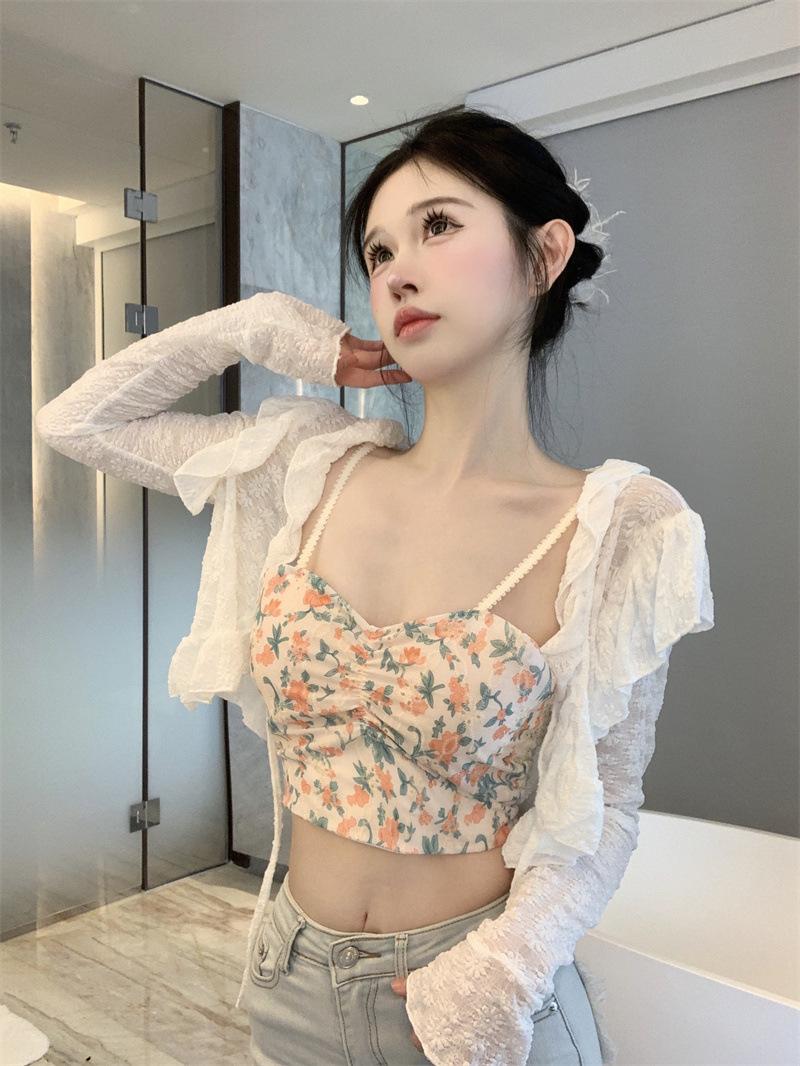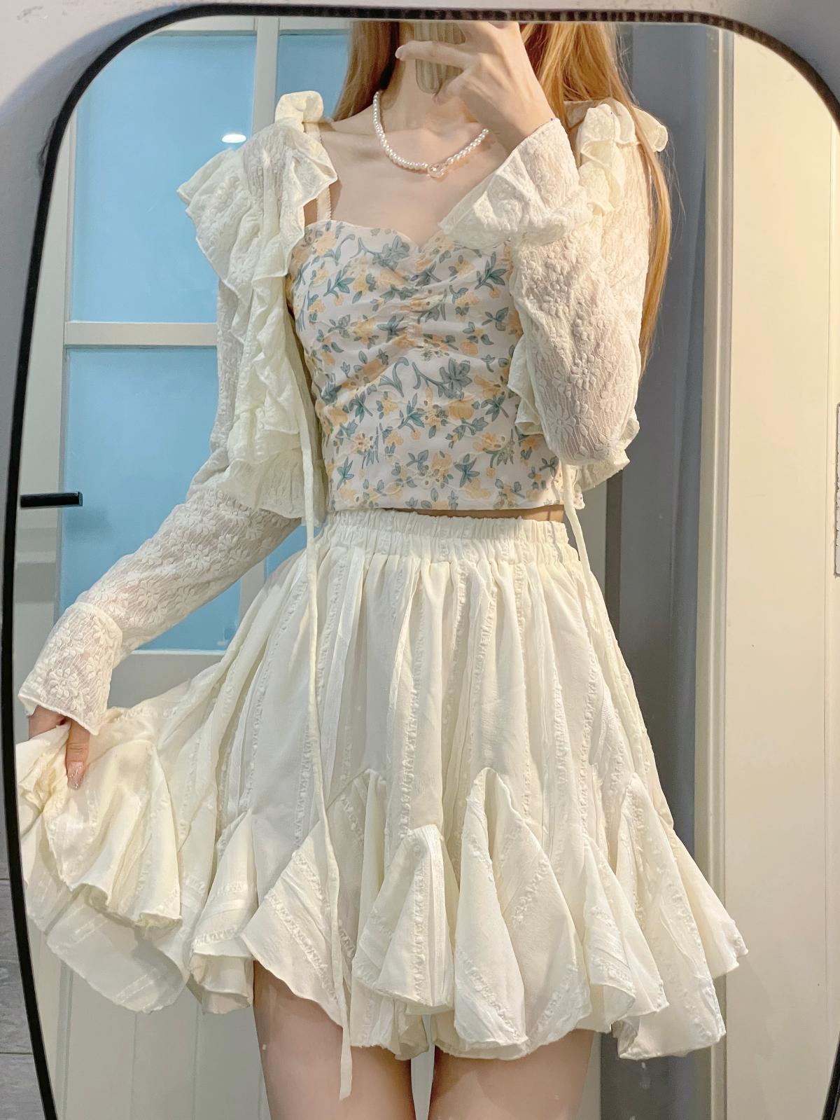 Cárdigan protector solar, blusa fina tipo chal, cárdigan corto de encaje con mangas abullonadas para mujer, conjunto de verano, falda con tirantes para mujer
