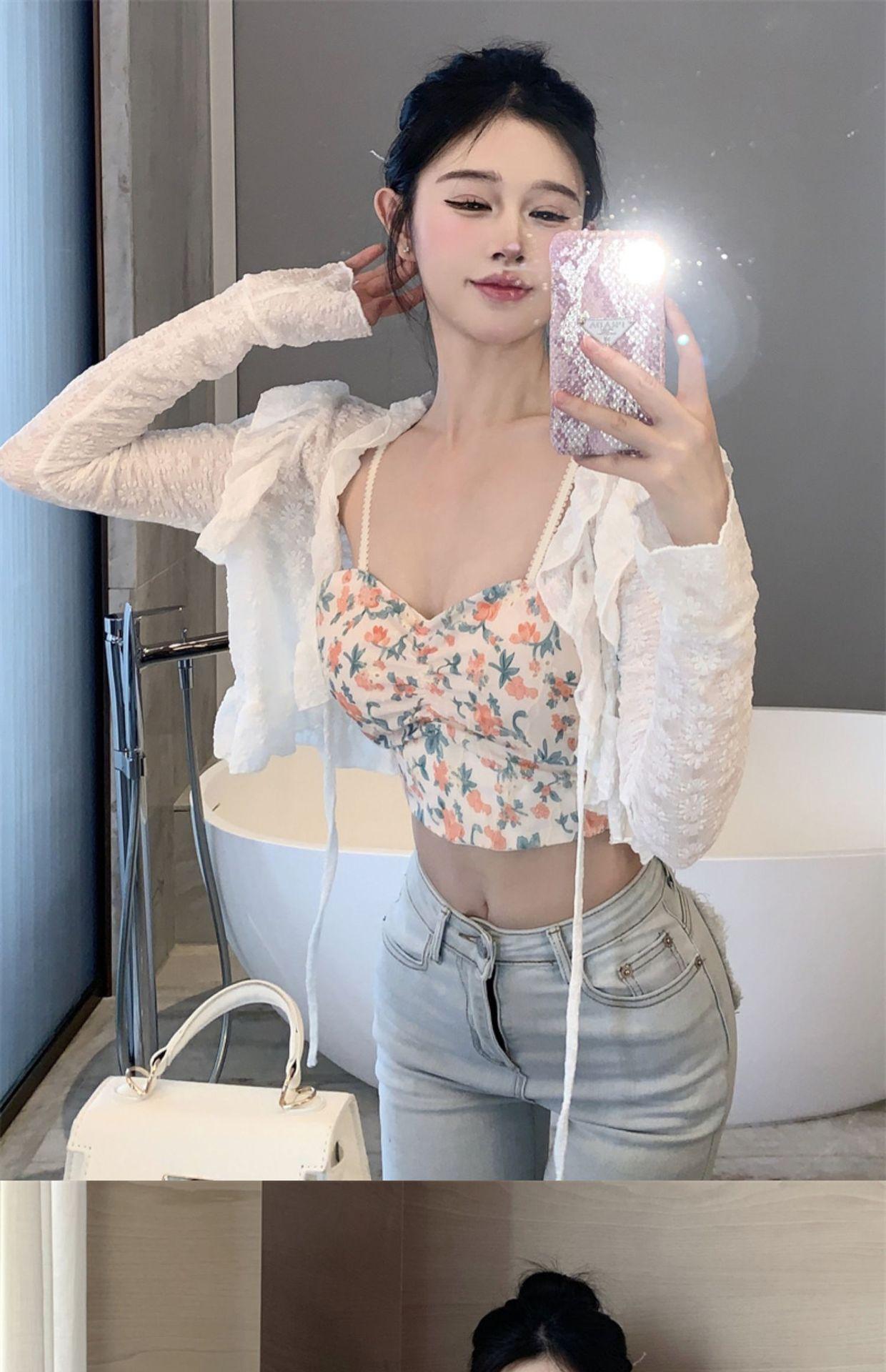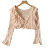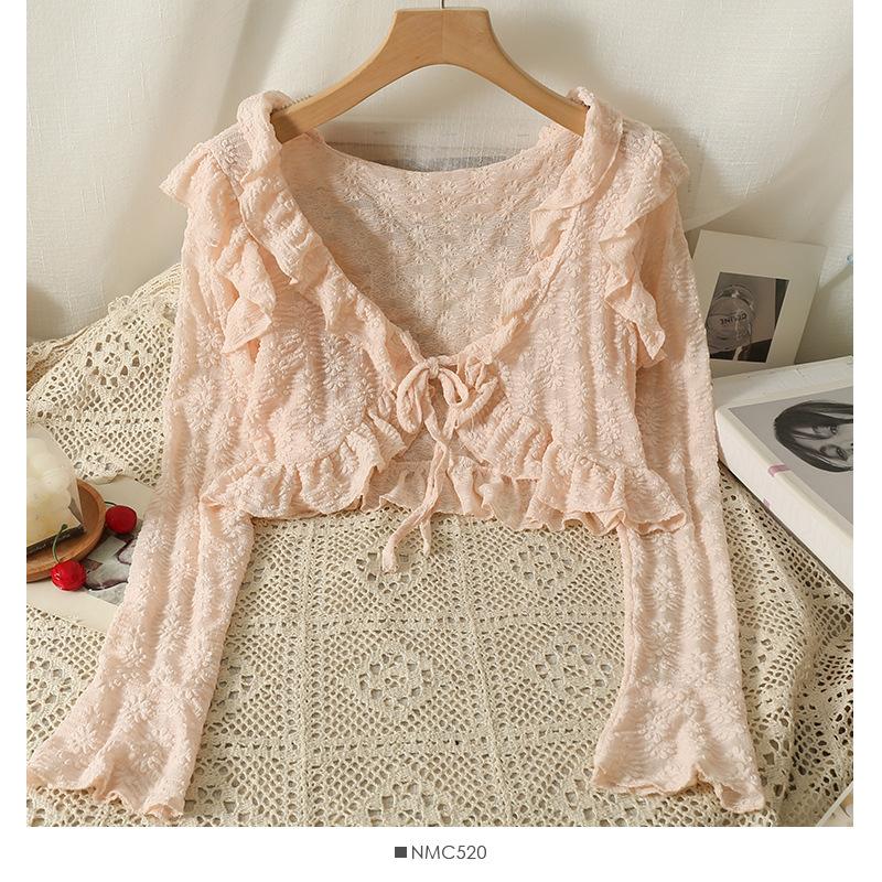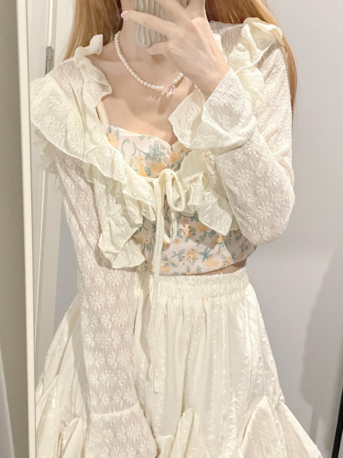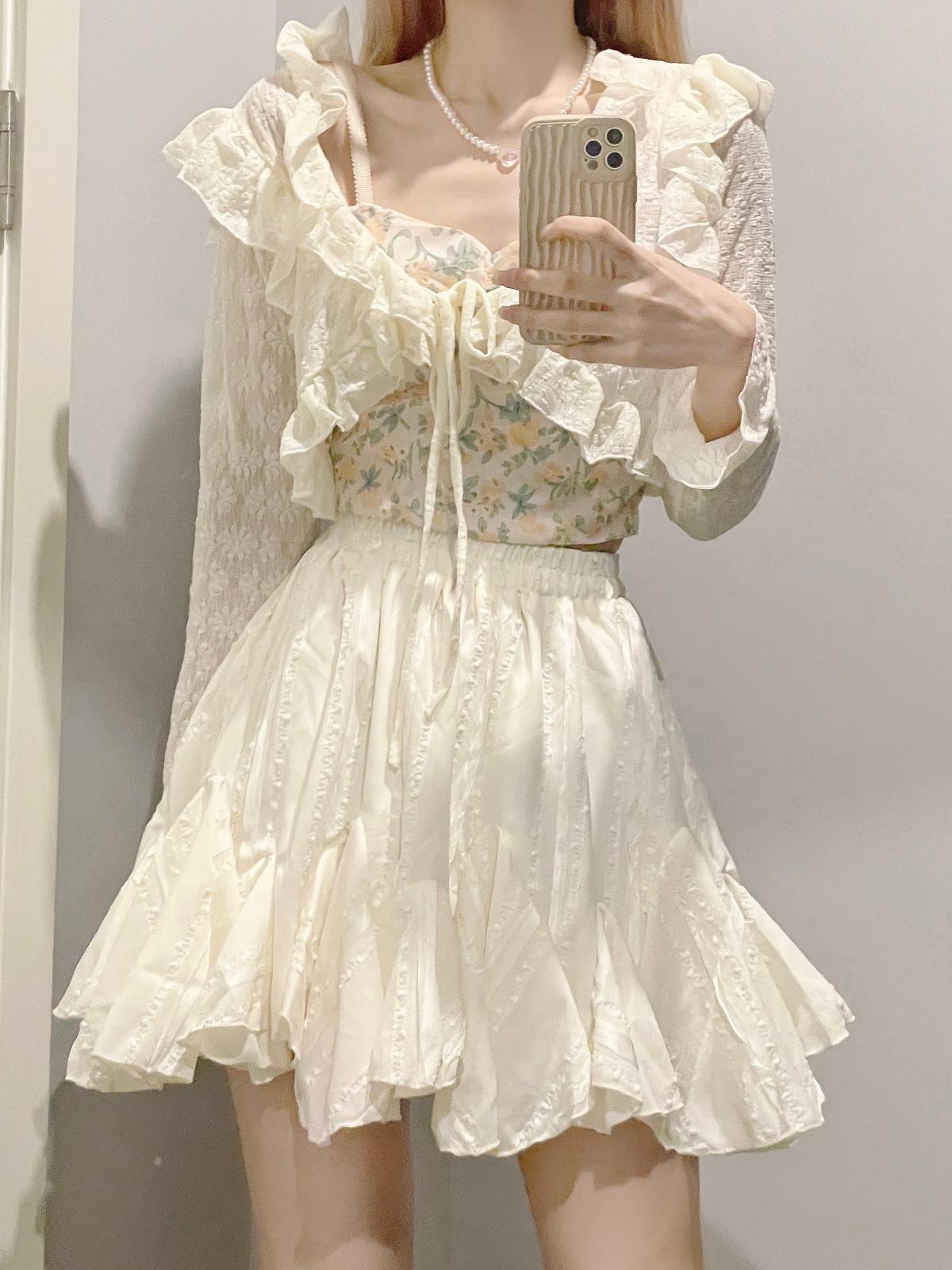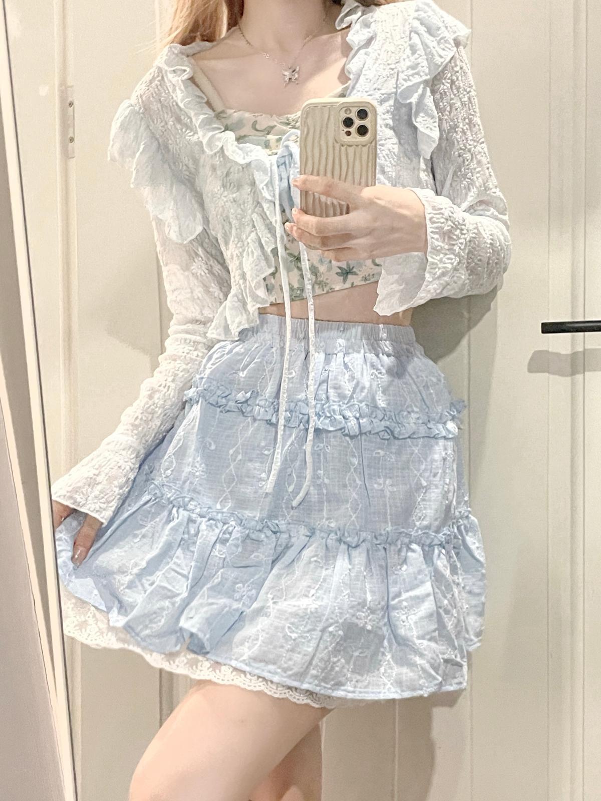 Cárdigan protector solar, blusa fina tipo chal, cárdigan corto de encaje con mangas abullonadas para mujer, conjunto de verano, falda con tirantes para mujer
