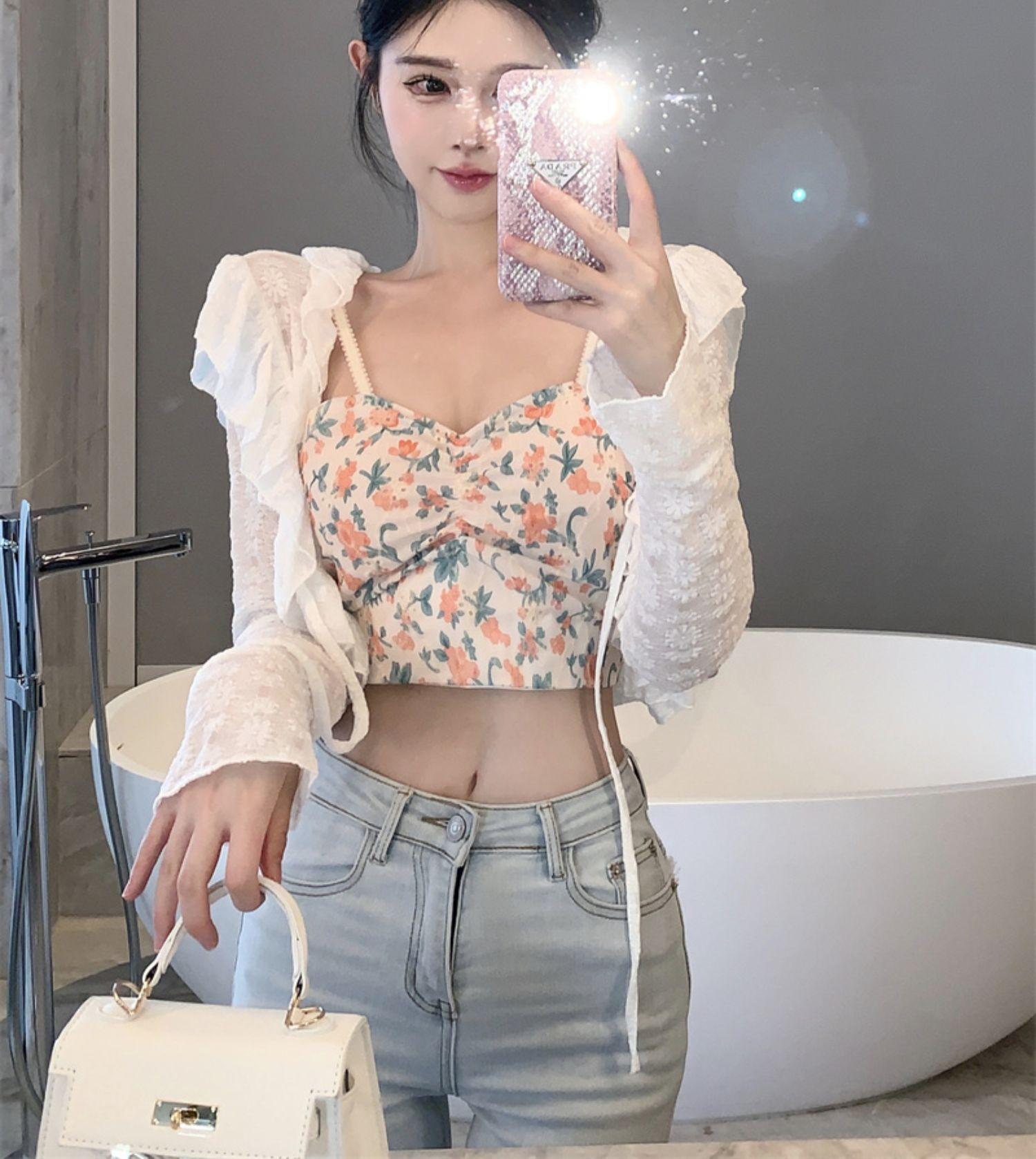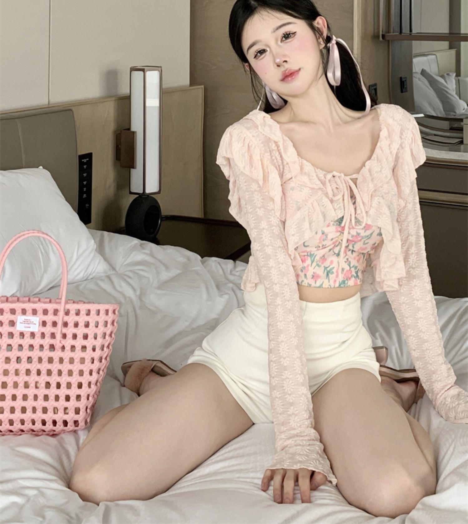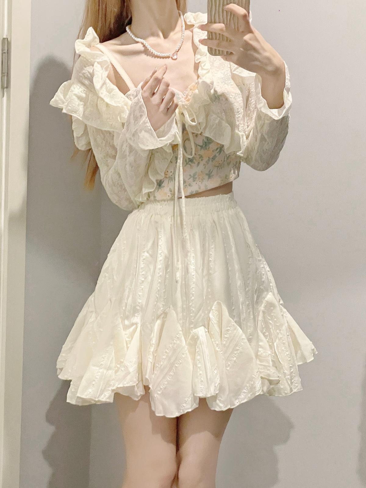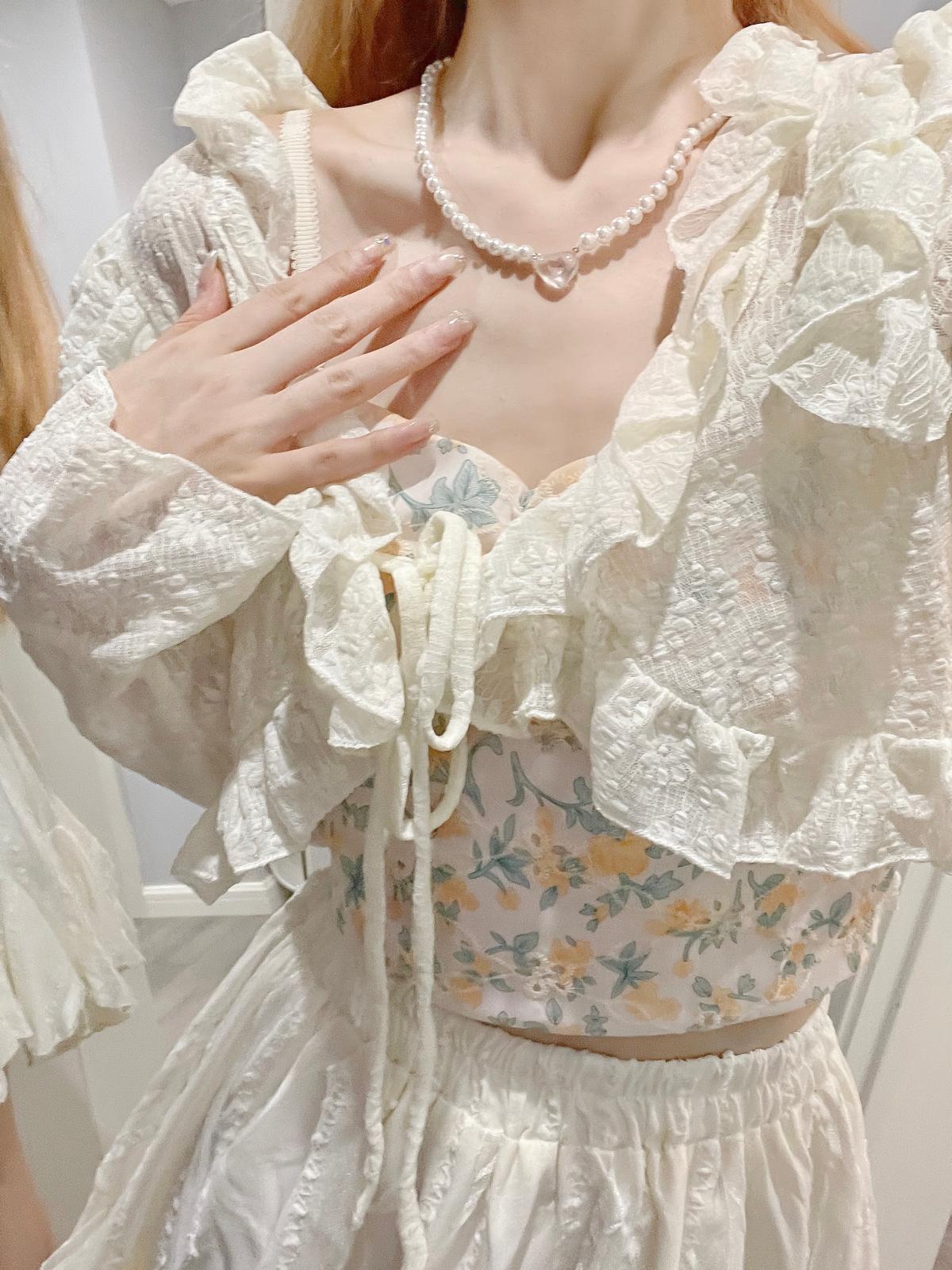 Cárdigan protector solar, blusa fina tipo chal, cárdigan corto de encaje con mangas abullonadas para mujer, conjunto de verano, falda con tirantes para mujer