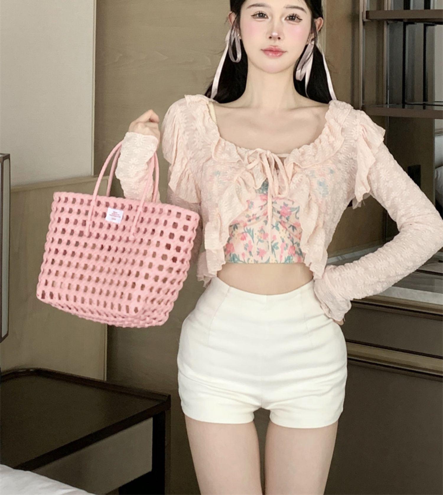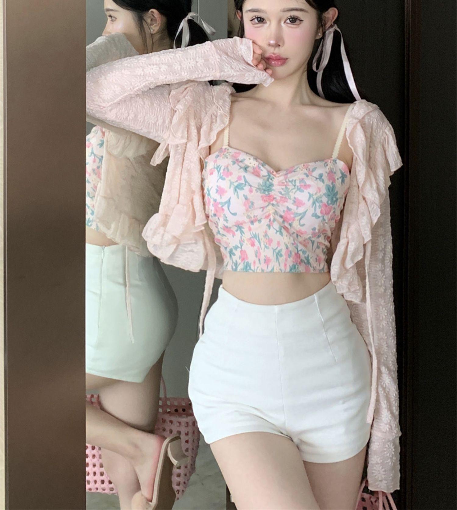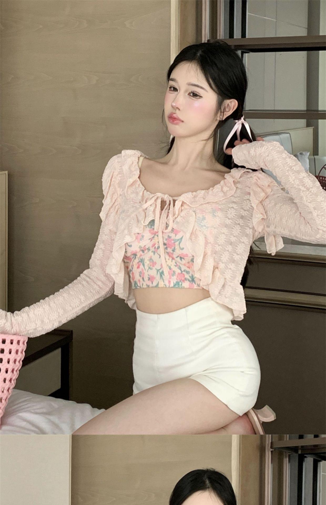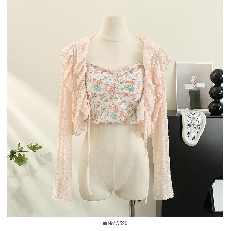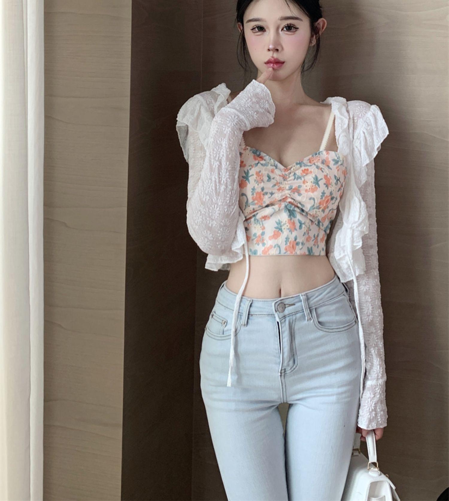 Cárdigan protector solar, blusa fina tipo chal, cárdigan corto de encaje con mangas abullonadas para mujer, conjunto de verano, falda con tirantes para mujer