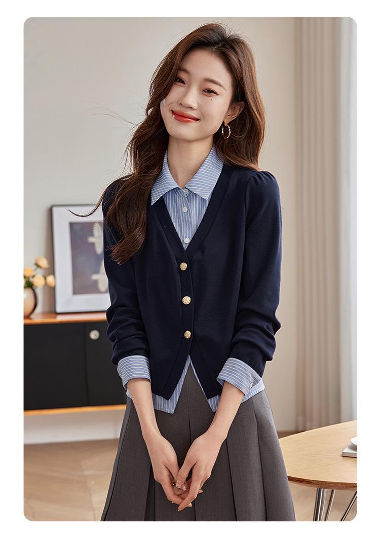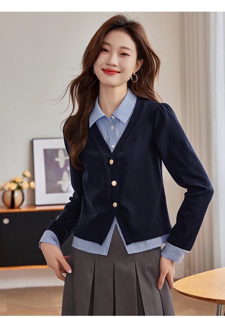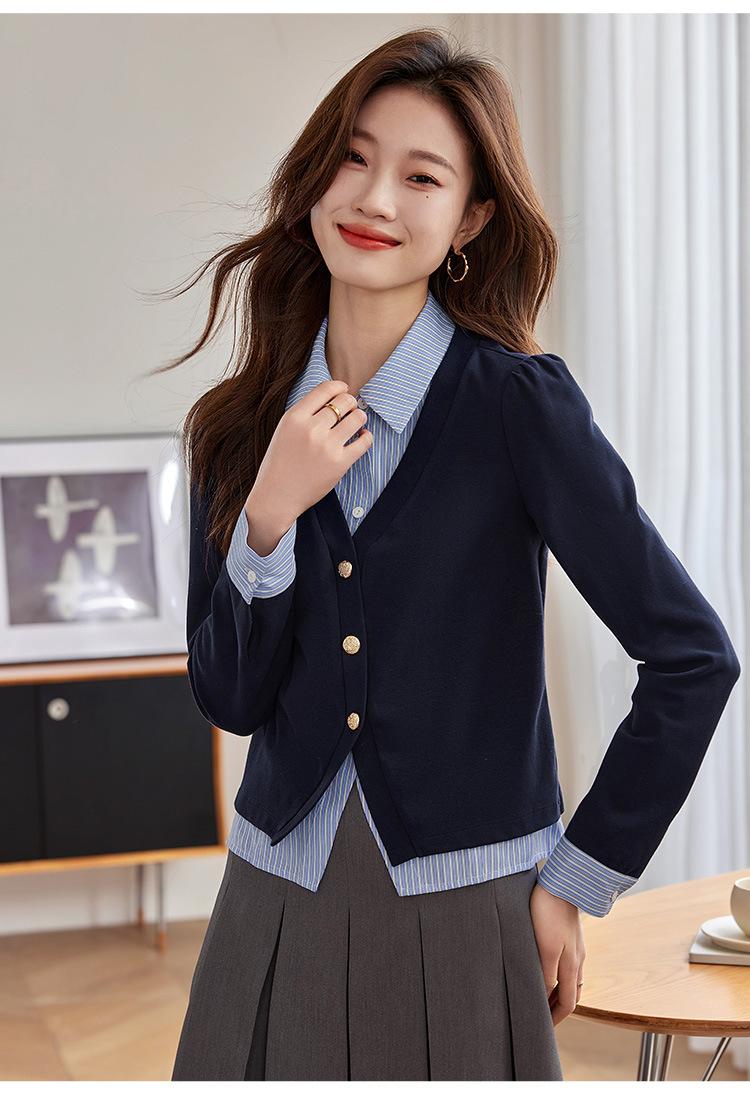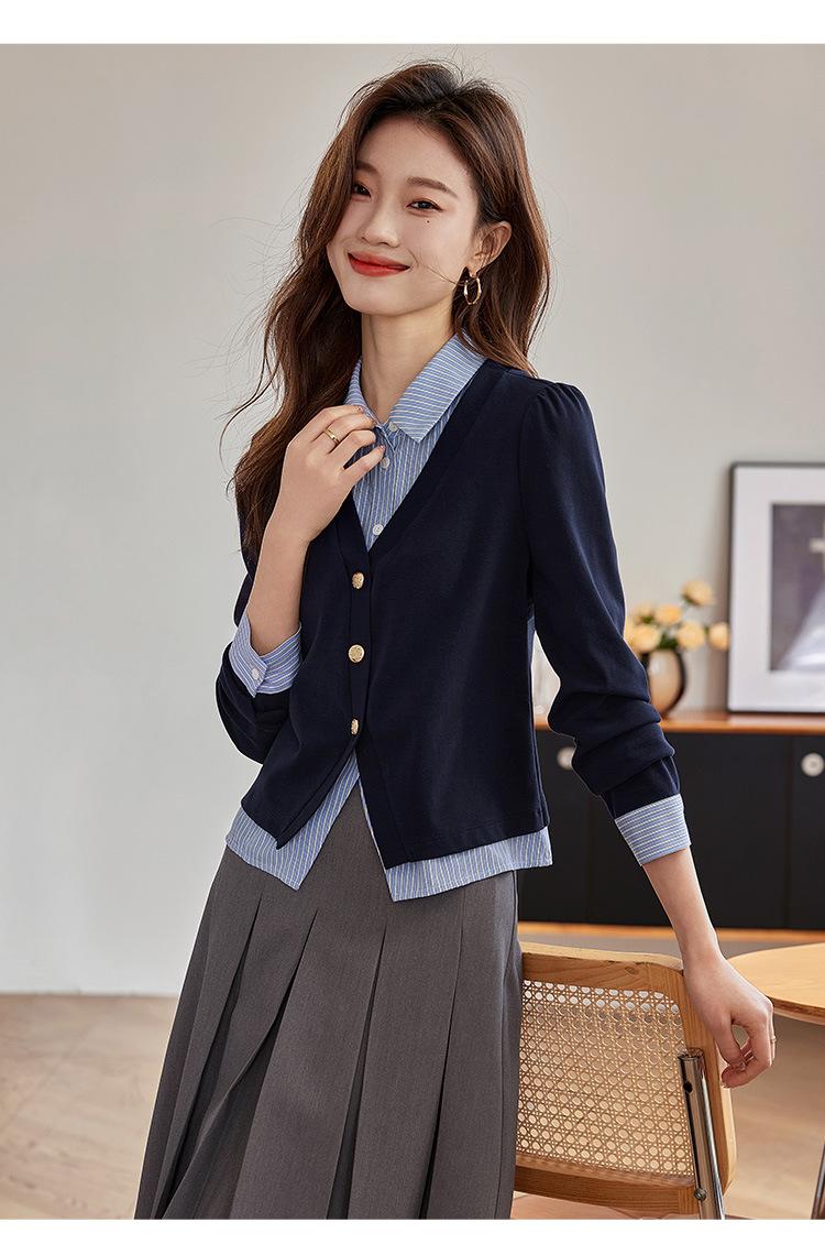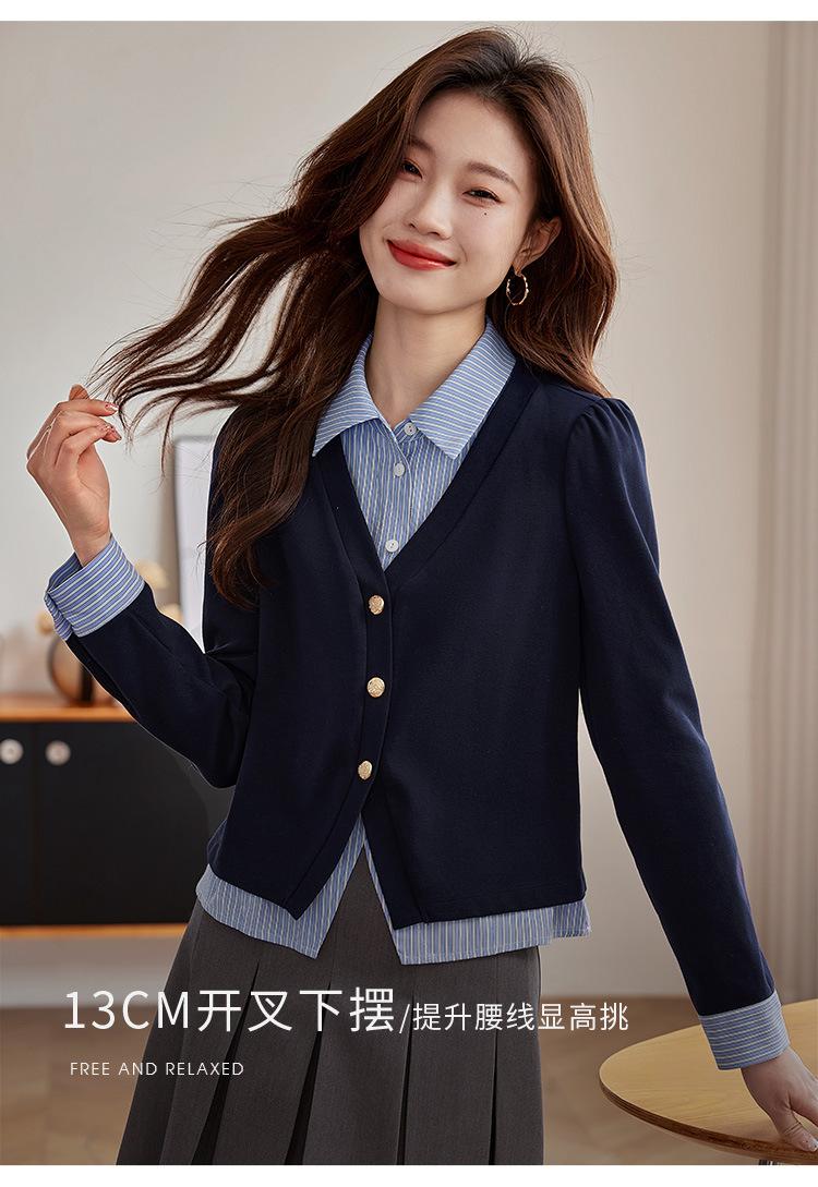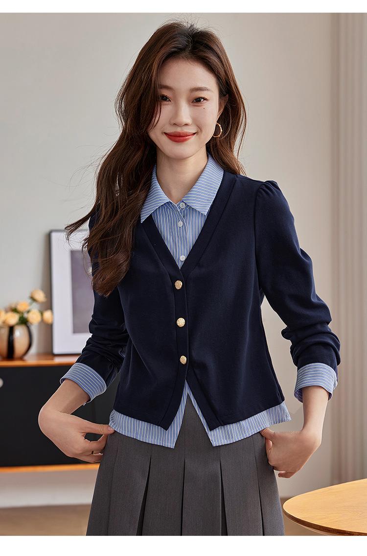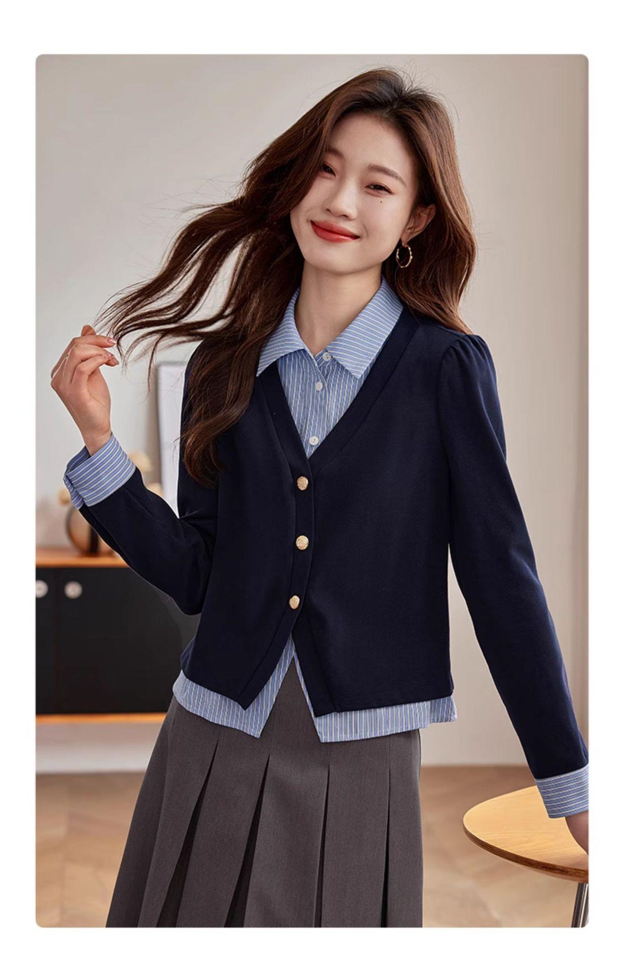 Suéter de mujer con cuello de camisa POLO a rayas de dos piezas falso estilo preppy apilado Primavera 2024 Nuevo