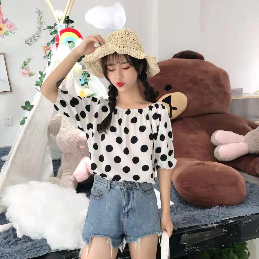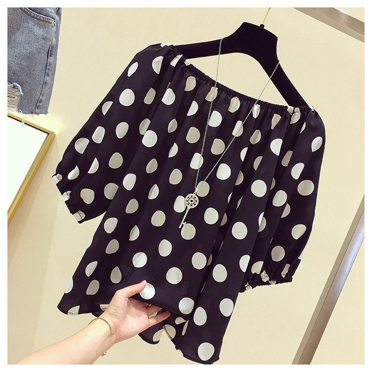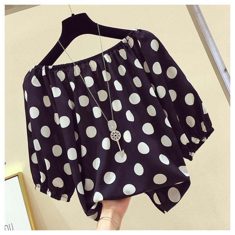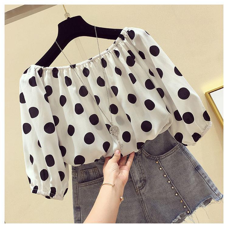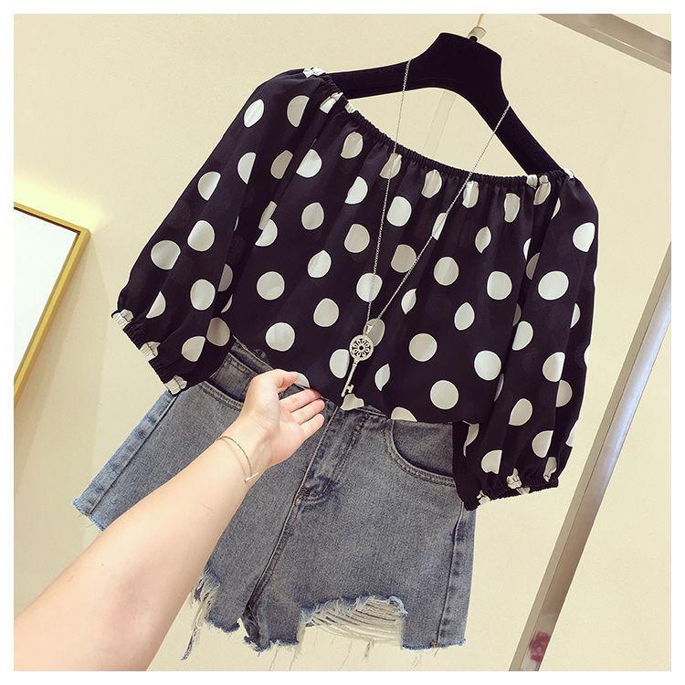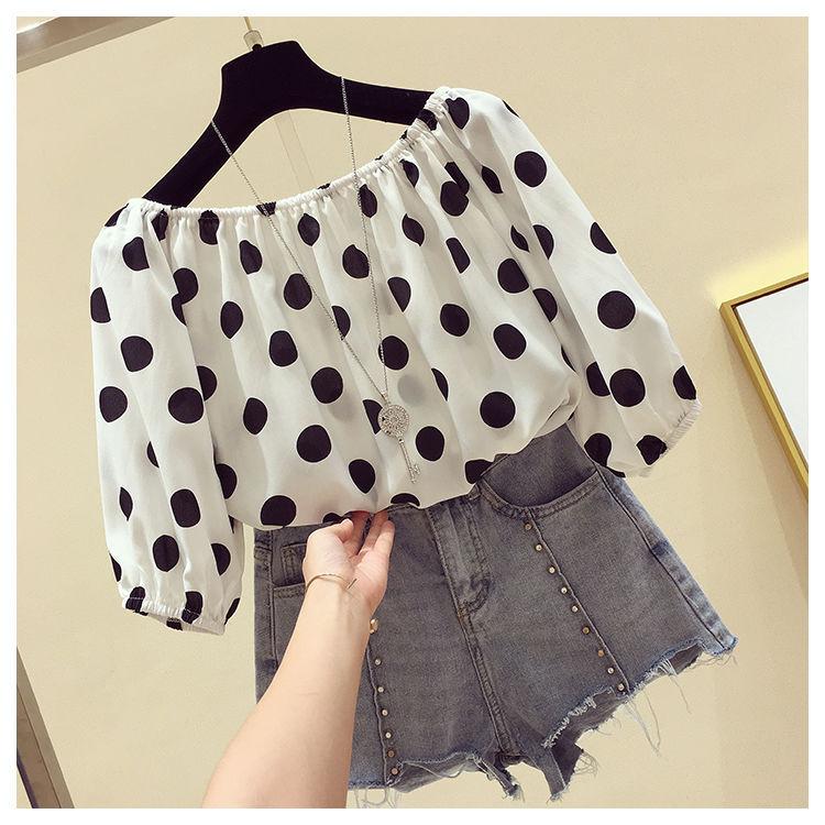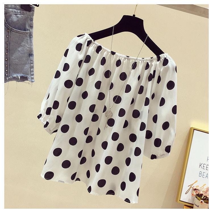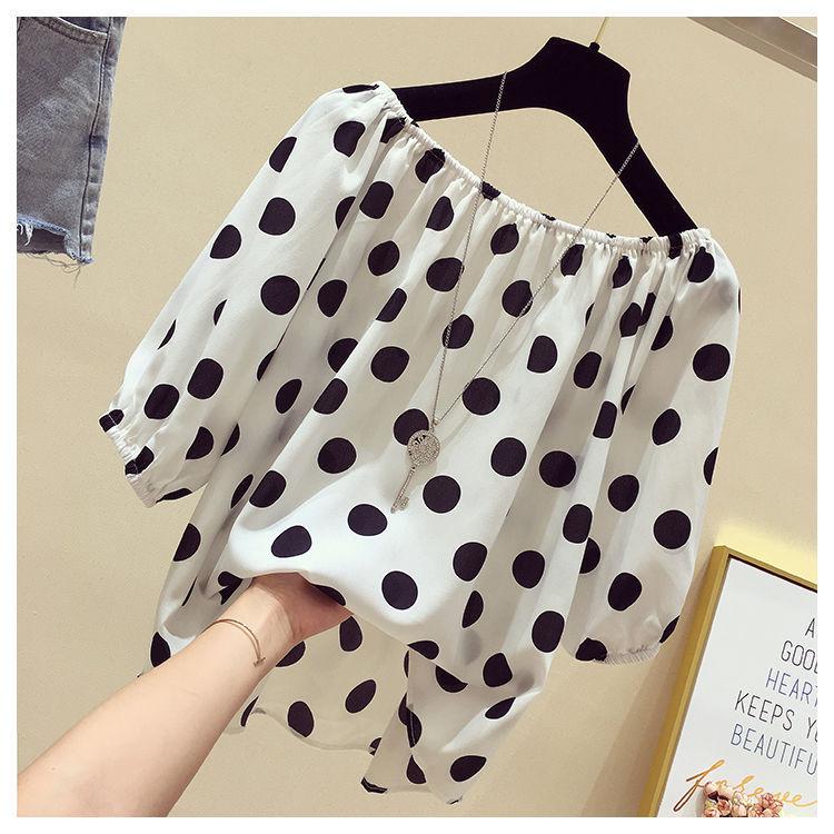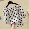 Camisa de gasa para mujer de manga corta de verano nueva estilo coreano holgada talla grande cubre abdomen estilo extranjero lunares de onda hombro top para dos usos