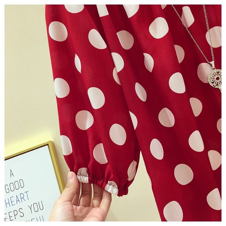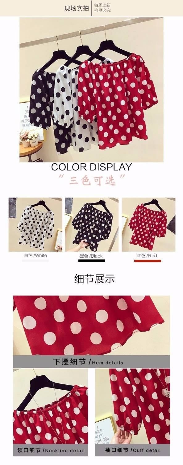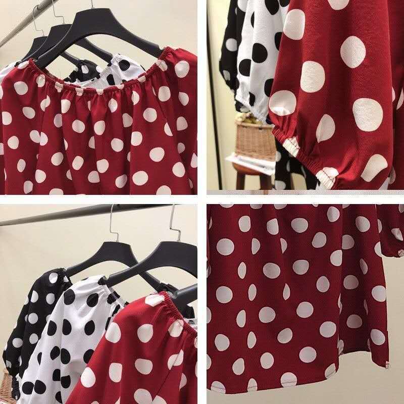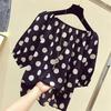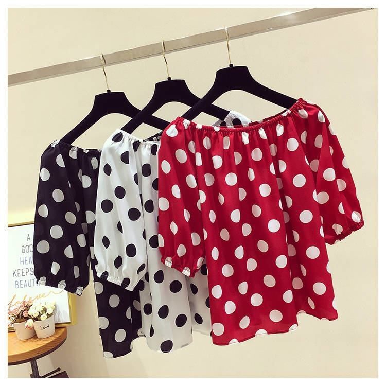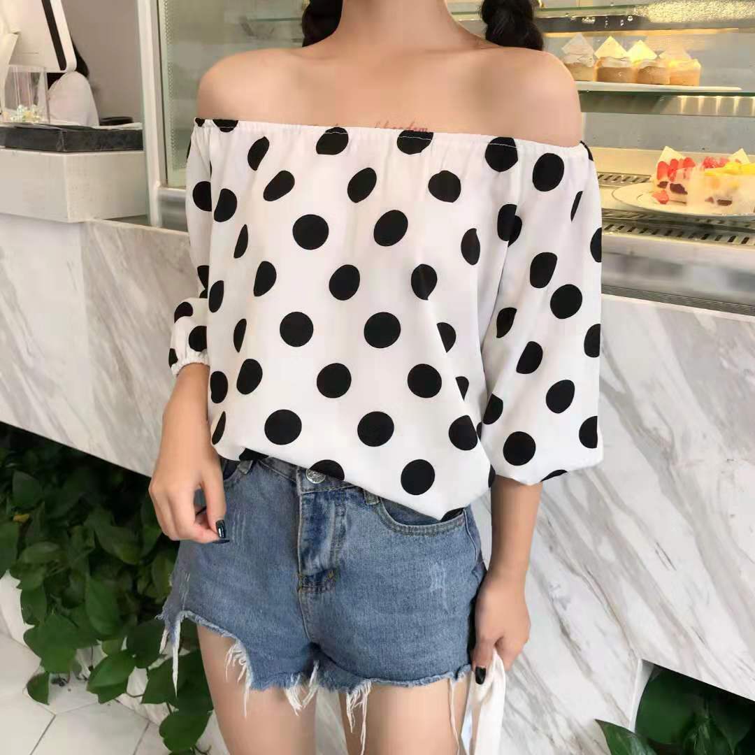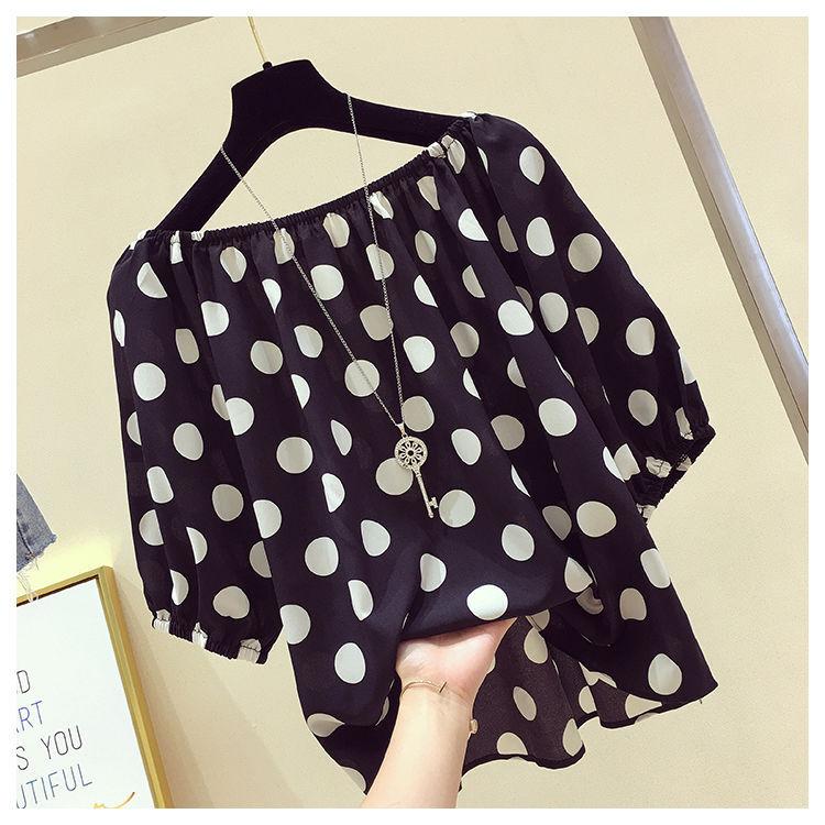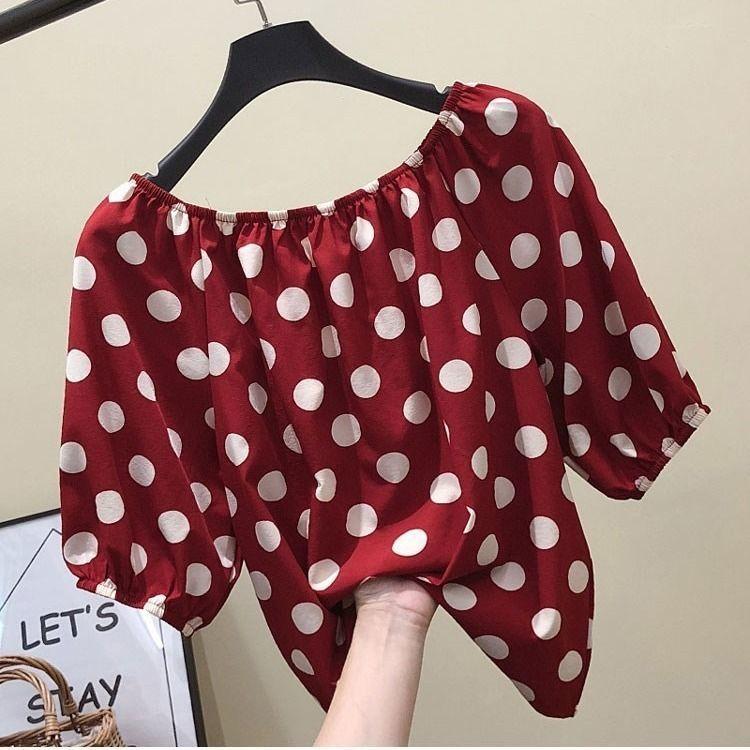 Camisa de gasa para mujer de manga corta de verano nueva estilo coreano holgada talla grande cubre abdomen estilo extranjero lunares de onda hombro top para dos usos